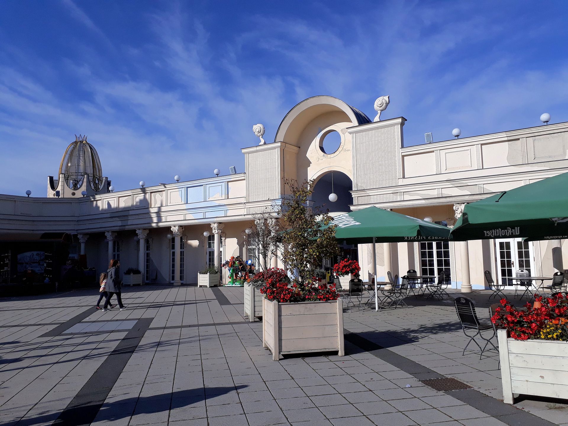 Das nicht ganz in den Bereich passende asiatische Thema geht auf den Vorbesitzer des Condors zurück. Das Fahrgeschäft stammt nämlich aus dem CentrO.Park in Oberhausen und wurde nach dessen Schließung zur Saison 2004 nach Leipzig umgesetzt. An der Fahrt selbst gibt es nichts auszusetzen, man dreht den Condor hier tatsächlich überraschend stark auf. Ungünstig ist aber in jedem Fall der Standort, denn von oben wird der eben noch gelobte Marktplatz ein wenig entzaubert. Dass man die nicht direkt einsehbare Rückseite der Gebäude nicht weiter gestaltet, leuchtet ja ein. Hier hat man es aber obendrein bei einer einstöckigen Bauweise mit Flachdach belassen und die vom Marktplatz aus sichtbaren Schrägdächer und Giebel einfach nur obendrauf gesetzt. Die andere Seite hat man dann einfach weggelassen, sodass man von hinten in dieses aufgesetzte Dach hineinschauen kann. Sicherlich war der Condor nicht Bestandteil der Planung, aber zumindest die parkzugewandte Seite hätte man doch mit kompletten Dächern versehen können. Zum einen, weil man die in den ersten Jahren auch so schon sehr gut sehen konnte, bis die Bäume im Park vernünftig gewachsen waren, zum anderen weil man damit hätte rechnen müssen, dass da irgendwann mal eine Attraktion entsteht, von der aus man auch die Rückseite der Gebäude einsehen kann.