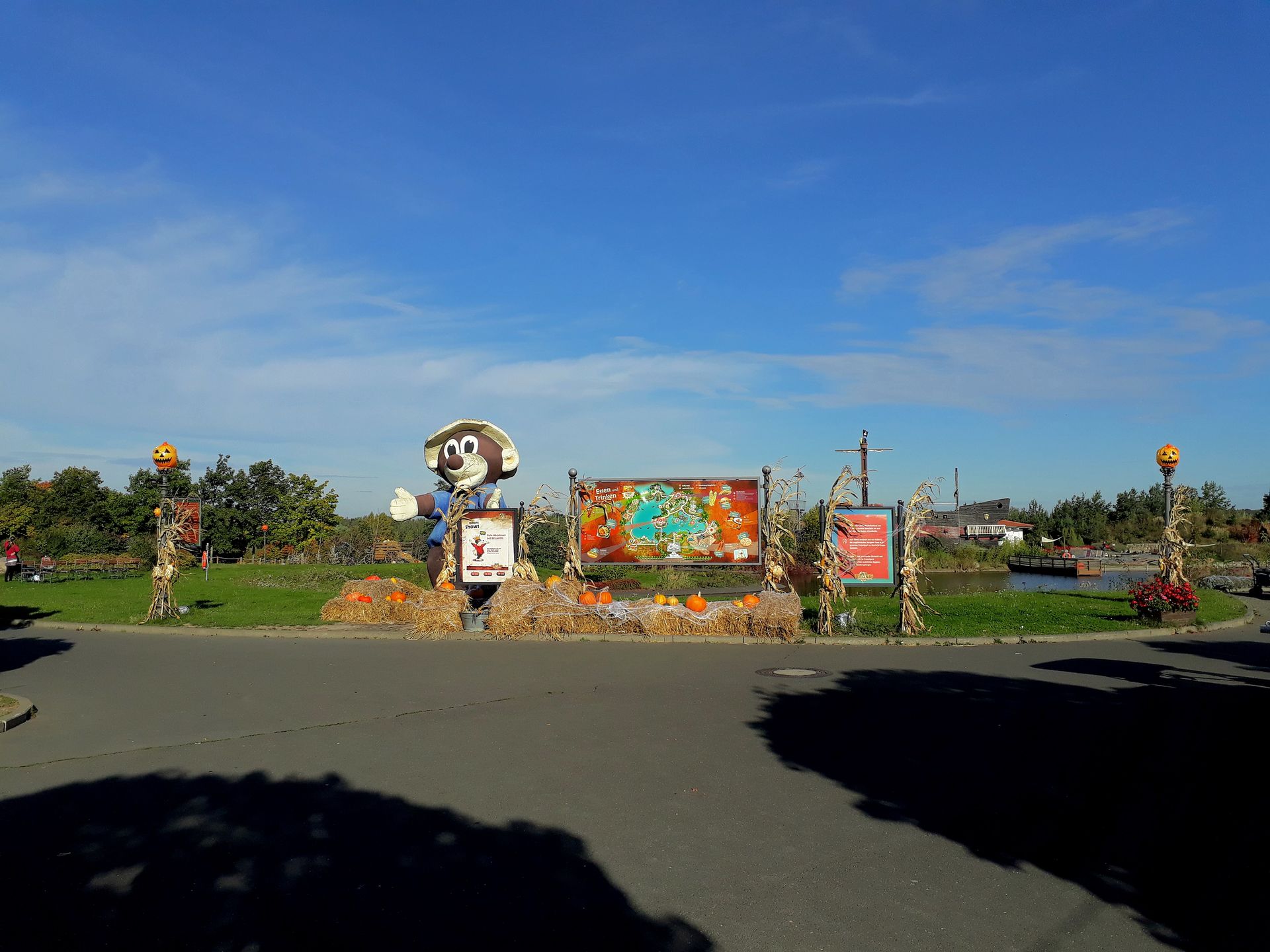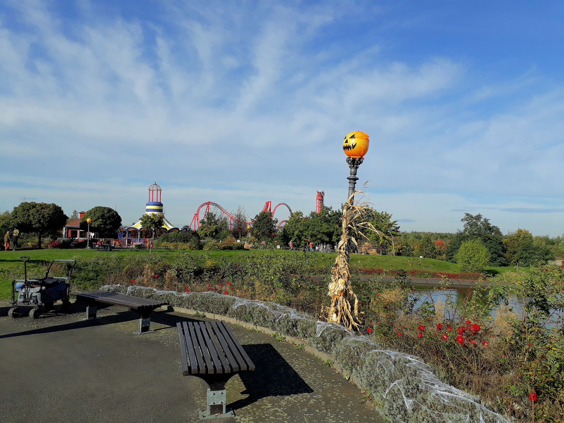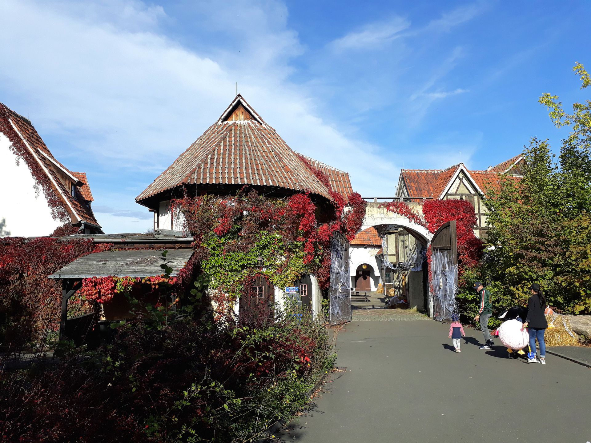 Tritt man aus dem Schloss heraus, steht man auch schon auf dem Hauptweg und es eröffnet sich das Panorama des Parks mit weiterer Halloween-Deko.