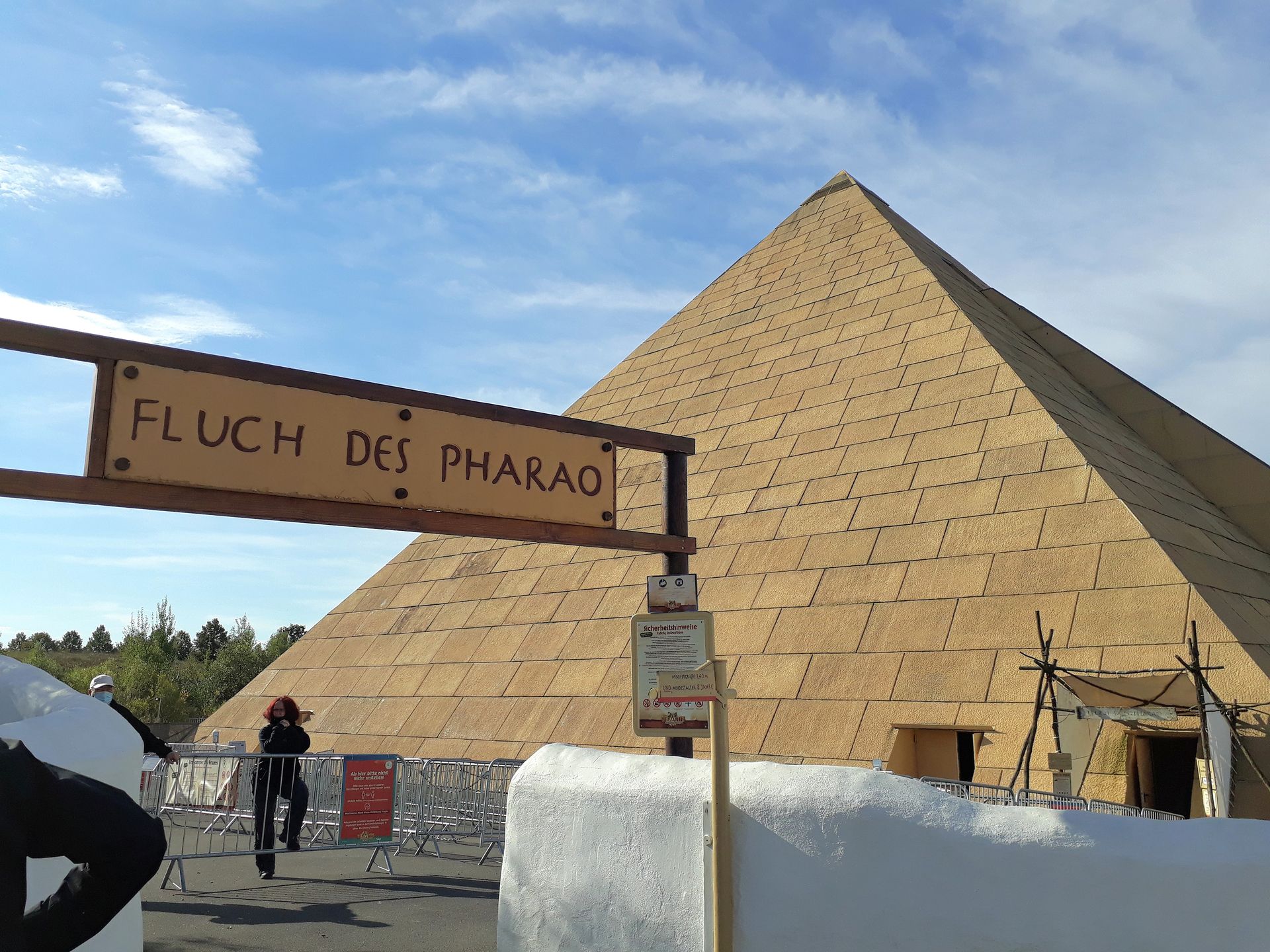 Genau genommen gab es eigentlich vor jedem Indoor-Wartebereich einen Zusatz-Bereich aus besagten Absperrungen. Soweit ich das beurteilen kann, wurden dort zu Hochzeiten der Maßnahmen die Leute vor dem Betreten der Gebäude zurückgehalten, um eben die Zahl der Menschen in den Innenräumen zumindest zu reduzieren. Im Oktober des vergangenen Jahres schien das wohl nicht mehr nötig, jedenfalls konnten wir überall ungehindert durchlaufen. Abstand war zwar noch vorhanden, aber in den seltensten Fällen waren es die berühmten anderthalb Meter. Und das mit den Masken sahen viele auch eher als Empfehlung denn als Pflicht. Aber zurück zum Pyramiden-Vorplatz. Dort hatte man neben dem Zugang zur Wildwasserbahn auch noch die Wartebereiche zu zwei Halloween-Mazes aufgebaut. Namentlich die Grabkammer des Grauens und den Fluch des Imhotep. Die wären ebenso wie die drei weiteren Mazes jeweils ab 11 Uhr zugänglich gewesen, sofern sie uns interessiert hätten.