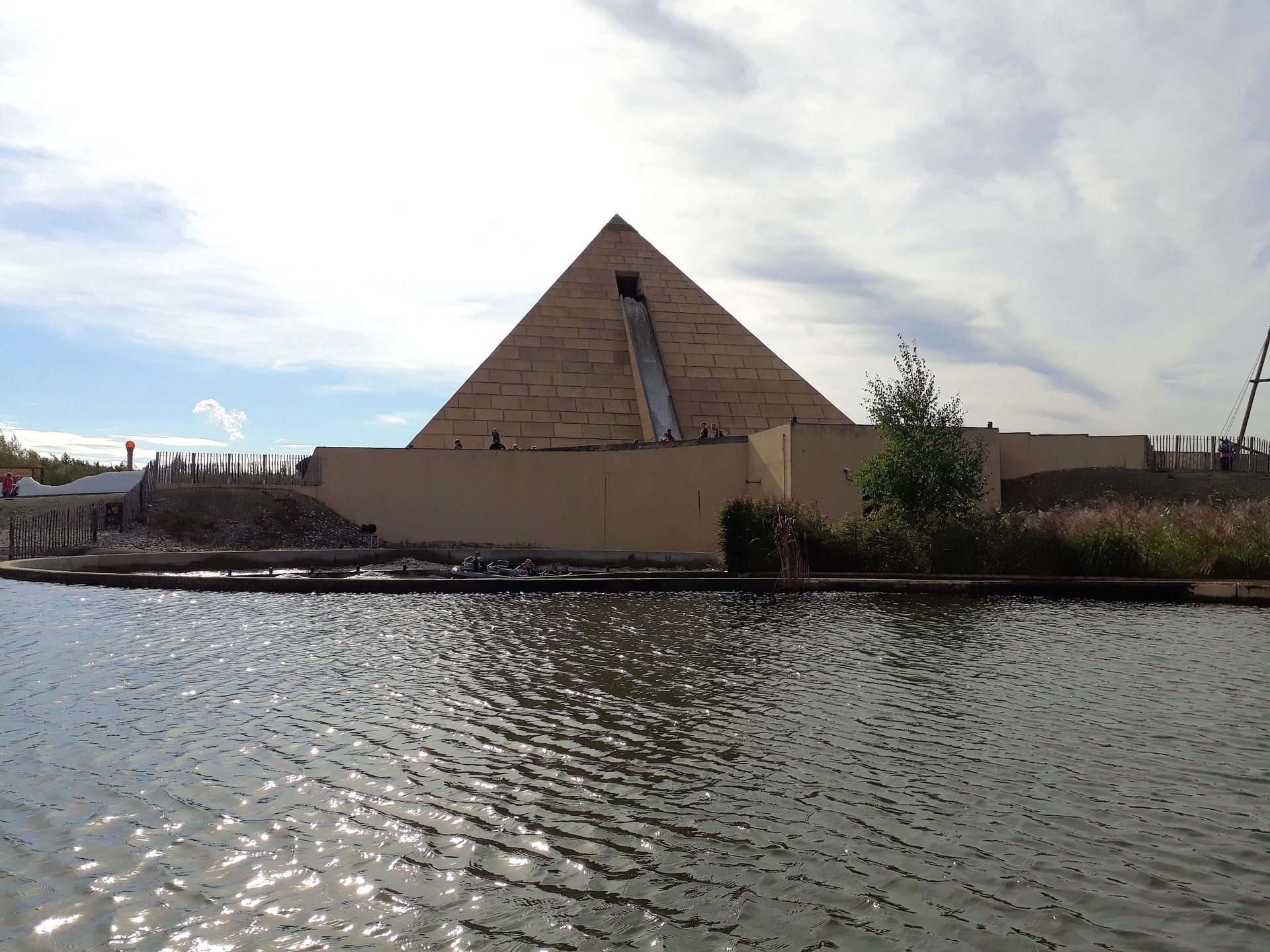 Während viele Boote maximal halbvoll unterwegs waren, machten wir eines komplett voll. Allerdings platzierte man uns in der letzten Reihe, sodass wir mit einer eher trockenen Fahrt rechnen konnten. Vom Förderband entlassen führt die Fahrt zunächst im Slalom durch die karge Landschaft zur Pyramide hin und hinein. Nun könnte man ja meinen, dass in einem so großen Bauwerk massig Platz für einen ausgeprägten Darkride-Part wäre - wenn schon der Wartebereich nur einmal am Rand quer durch führt. Aber tatsächlich durchfährt man dort drin lediglich eine einzige Kurve, welche das Boot zur Mitte der Pyramide und damit zum Vertikallift führt. Und dabei ist der Kanal beidseitig direkt von ziemlich nackten Wänden eingerahmt, es wird also auch nahezu kein Platz von Theming eingenommen. Im Phantasialand wäre man sicher froh, wenn man so viel Platz hätte, dass man da einfach eine riesige Pyramide quasi ohne Inhalt hinstellen könnte. Ok, inzwischen weiß ich, dass man dort ursprünglich noch eine Show-Arena integriert hatte, die aber offensichtlich nicht lange genutzt wurde. Mittlerweile sind dort die beiden Mazes drin, aber die sind ja auch nur wenige Tage im Jahr geöffnet - obwohl man angeblich über eine ganzjährige Öffnung nachgedacht hatte. Der darüber hinaus freie Teil kann übrigens