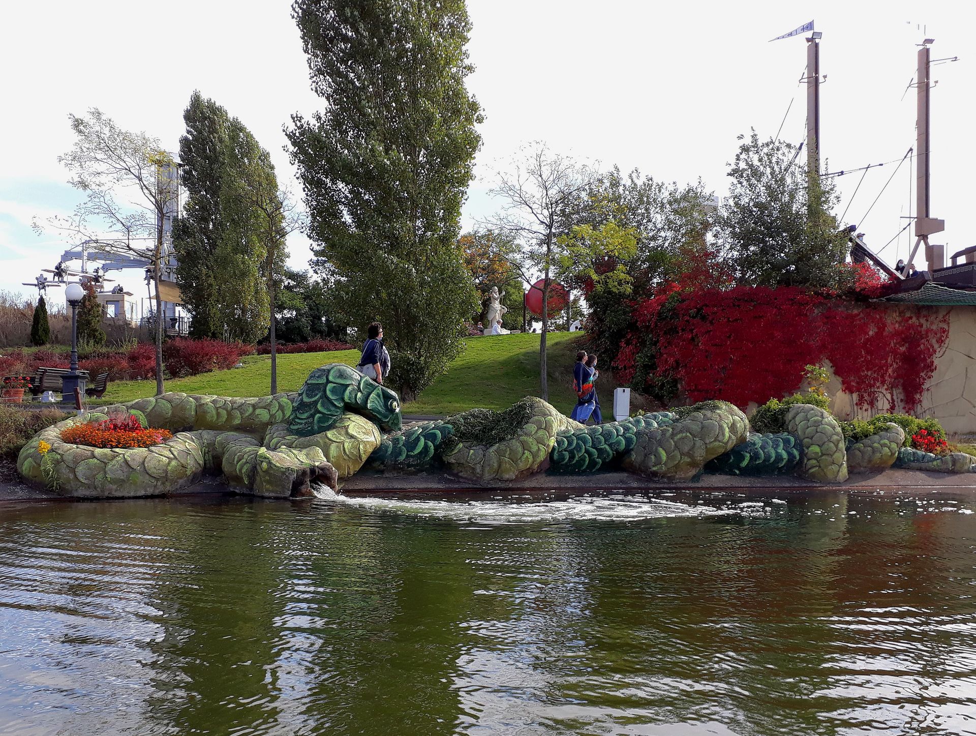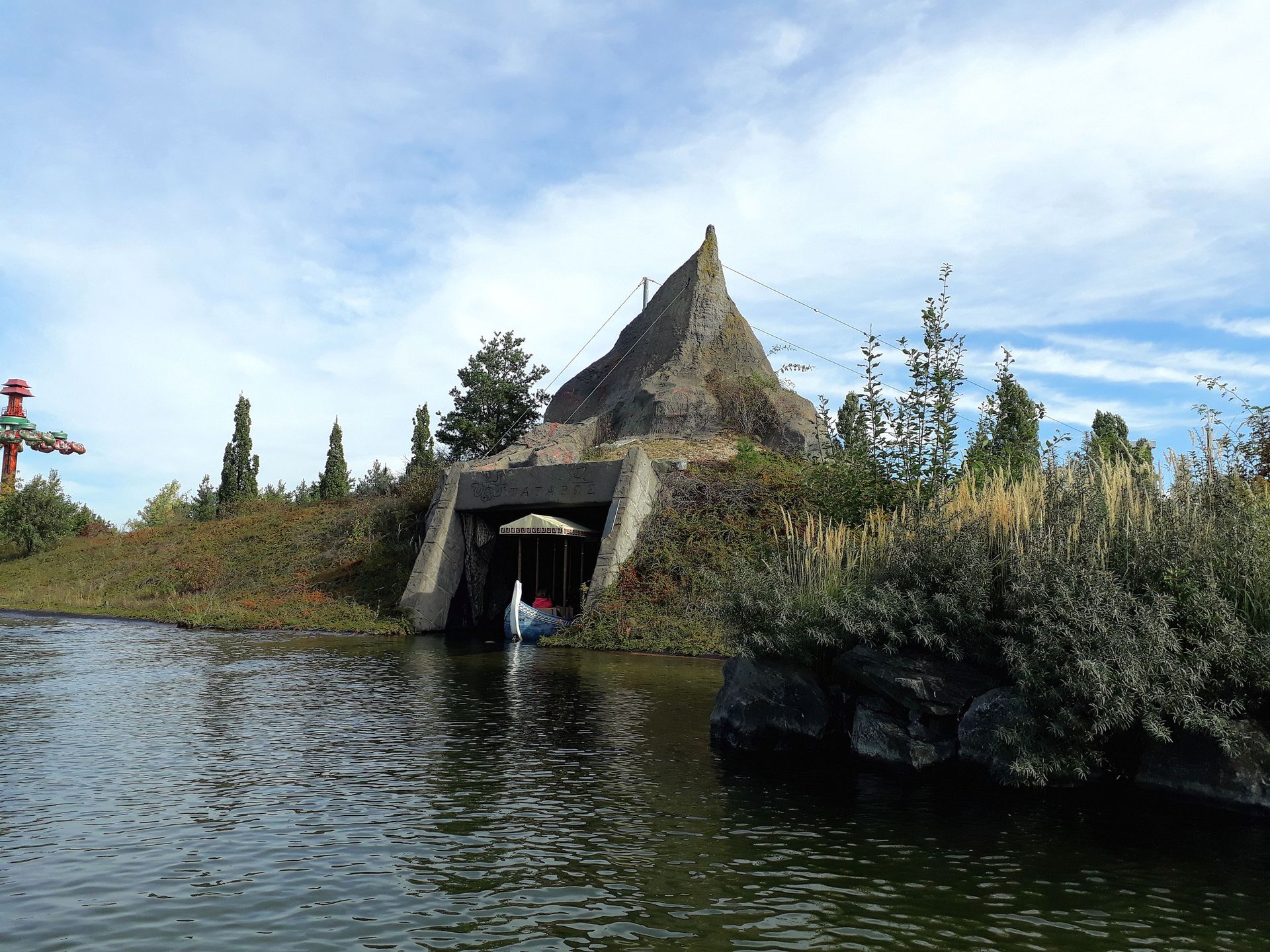Und wenn man das dann noch mit ein bisschen griechischer Mythologie verknüpft, kann man das Ganze sogar noch als Themenfahrt verkaufen. Finde ich eine wirklich gute Idee, vor Allem mit der Einbindung der anderen Attraktionen, an denen man vorbeifährt. Die Umsetzung könnte allerdings besser sein. Ein paar Figuren auf einer überwucherten Insel, zwei Betonschlangen am Ufer und ein mäßig thematisierter Tunnel sind dann doch eher das untere Ende der Fahnenstange. Wenn man bedenkt, dass besagte Thematisierung aufgrund der Mehrkosten beim Bau der Pyramide zunächst zurückgestellt und erst im Laufe der Jahre nachgereicht wurde, muss das Budget echt verdammt knapp kalkuliert gewesen sein. Das soll jetzt allerdings nicht zu negativ klingen, normalerweise kommen diese Bootsfahrten ja gänzlich ohne Thematisierung aus. Eine ruhige Fahrt durch die (künstliche) Natur des Parksees reicht ja auch zum Entspannen. Die kleine Geschichte am Rande kommt hier eben noch als dezente Zugabe obendrauf - und wenn man jetzt noch etwas Grünschnitt auf den Inselchen betreiben würde, könnte man davon vielleicht auch etwas mehr sehen.