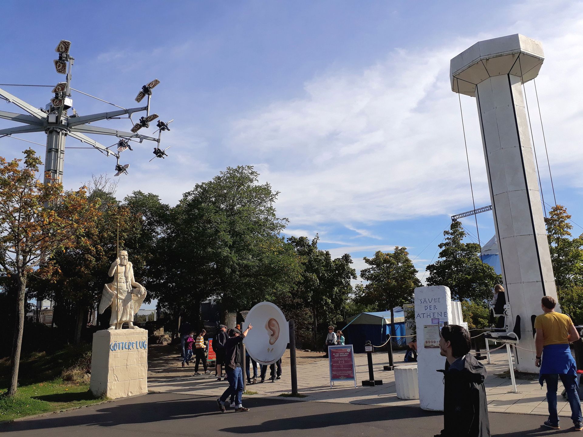 Überragt wird der Strand der Götter vom Heege-Turm Säule der Athene und dem Prototypen des Sky Rollers, dem Götterflug.