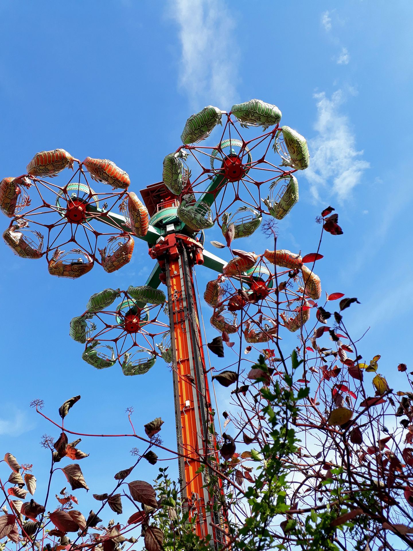 Gerstlauer mit dem Konzept jedoch erst ab 2012 in Form des leicht abgewandelten Sky Flys. Aber auch den Sky Roller entwickelte man weiter, die erste neue Version wurde 2014 im dänischen Bakken eröffnet. Der Prototyp in Belantis kommt im Vergleich dazu noch etwas komplexer daher. Der Turm an sich ist zweiteilig, sodass er im Ruhezustand nur 13 Meter hoch ist. Erst mit Beginn der Fahrt fährt der Turm auf die volle Höhe von 22 Metern aus. Außerdem werden die Auslegerenden komplett umgeklappt, sodass die jeweils zwei Gondeln nahezu senkrecht übereinander ihre Runden drehen, wohingegen sie bei den neueren Versionen nur leicht zueinander geneigt werden. Am Steuerprinzip mit den Flügeln und dem generellen Fahrtablauf wurde aber nichts verändert. Und die vielgescholtenen Gondelbremsen bei den neueren Auslieferungen scheint es hier auch noch nicht zu geben, ich kam jedenfalls recht gut in Schwung und konnte meine Überschläge auch sehr gut halten. Zumindest bis in den Bereich um die 30-35 Umdrehungen, da hatten meine Arme mehr und mehr Mühe, die Stellung zu halten. Und so ein bisschen schwindelig wurde es mir auch langsam. Sollte ich vielleicht doch lieber abbrechen und den Rest der Fahrt nur noch die Aussicht genießen? Ja, besser wäre es wohl. Aber so dicht am persönlichen Rekord einfach aufgeben? Nein, da musste ich jetzt durch. Man weiß ja nie, wann man nochmal die Gelegenheit hätte. Sonst endet die Fahrt auf solchen Anlagen ja meist gefühlt schneller, als man den ersten Überschlag zustande bringen kann. Hier kam mir die Fahrt dagegen schier endlos vor und ich war tatsächlich froh, als der Turm endlich wieder nach unten fuhr. Leider hatte ich zwischenzeitlich den Faden beim Zählen verloren, aber grob um die 50 Überschläge waren es auf jeden Fall. Damit bin ich jetzt aber auch durch, das werde ich - fahrzeitenbedingt - mit hoher Wahrscheinlichkeit nicht mehr toppen können. Also kann ich die Dinger künftig auch als Aussichtsfahrt nutzen. Die Wartezeit betrug für uns übrigens trotzdem nur eine der langen Fahrten - plus das Ende der vorherigen.