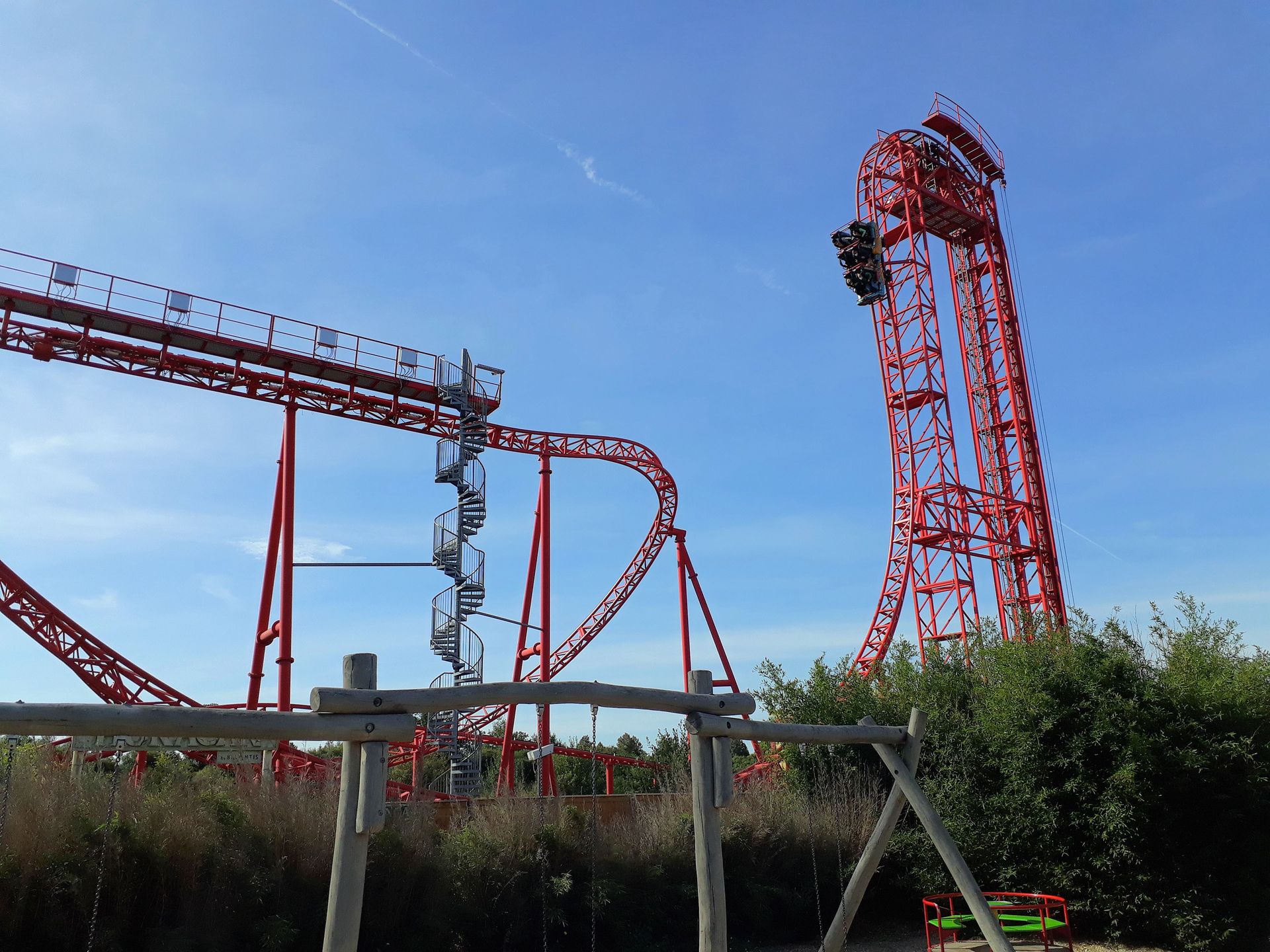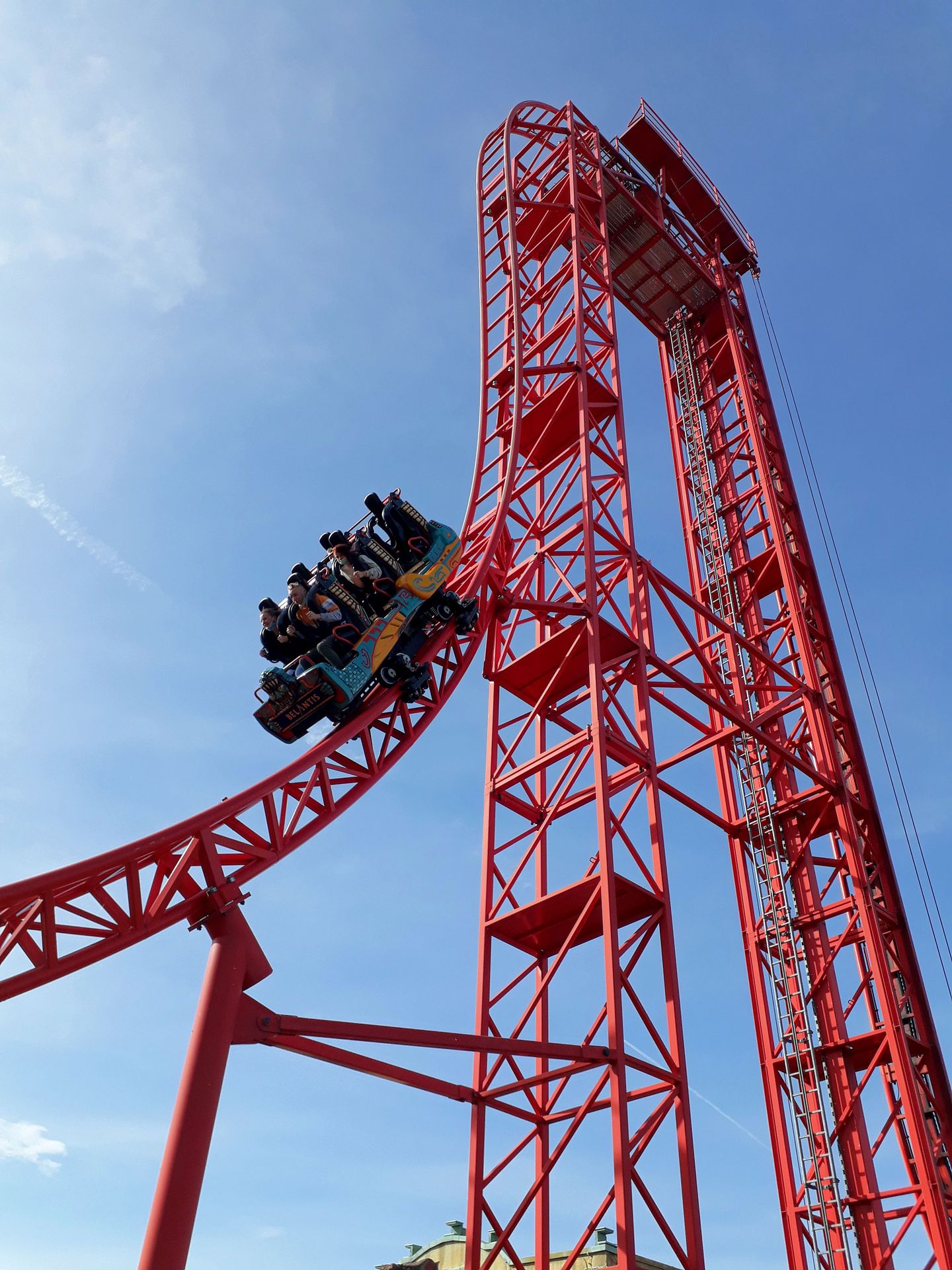 Trotzdem konnten wir quasi ohne Wartezeit in einen der 6er-Züge einsteigen und den 97°-Drop (mit Beinahe-Stopp des Lifts am oberen Scheitelpunkt) in Angriff nehmen.