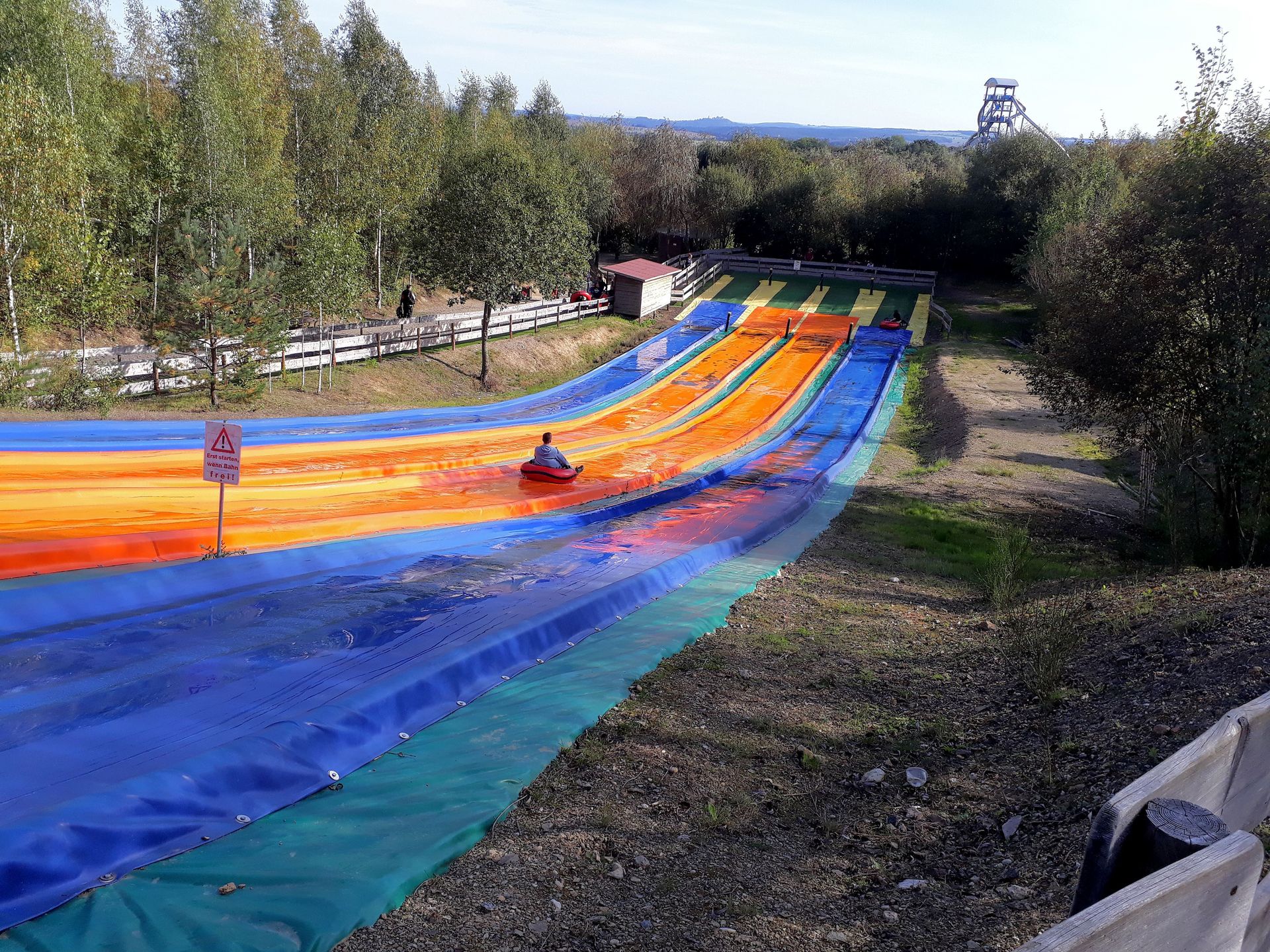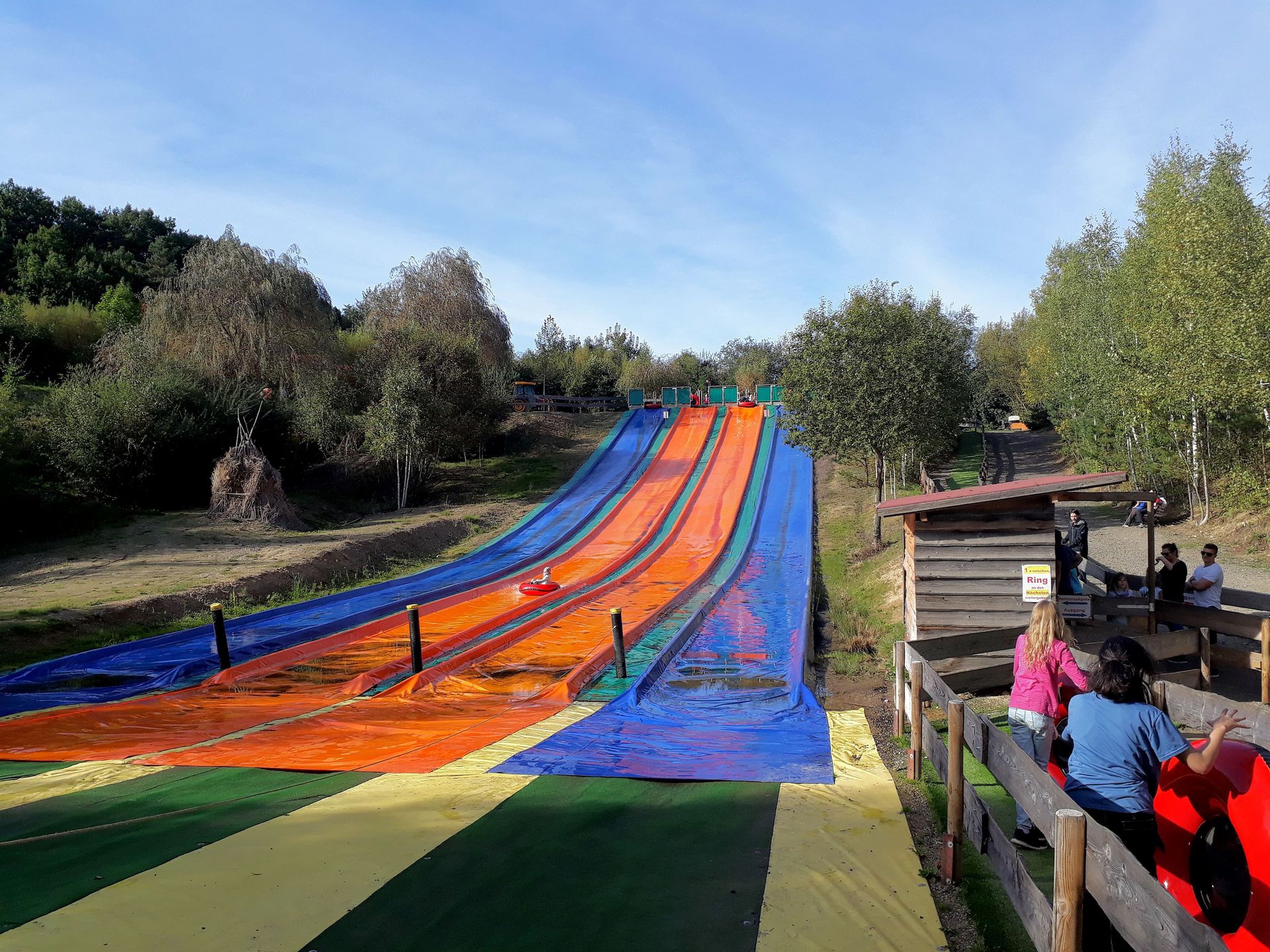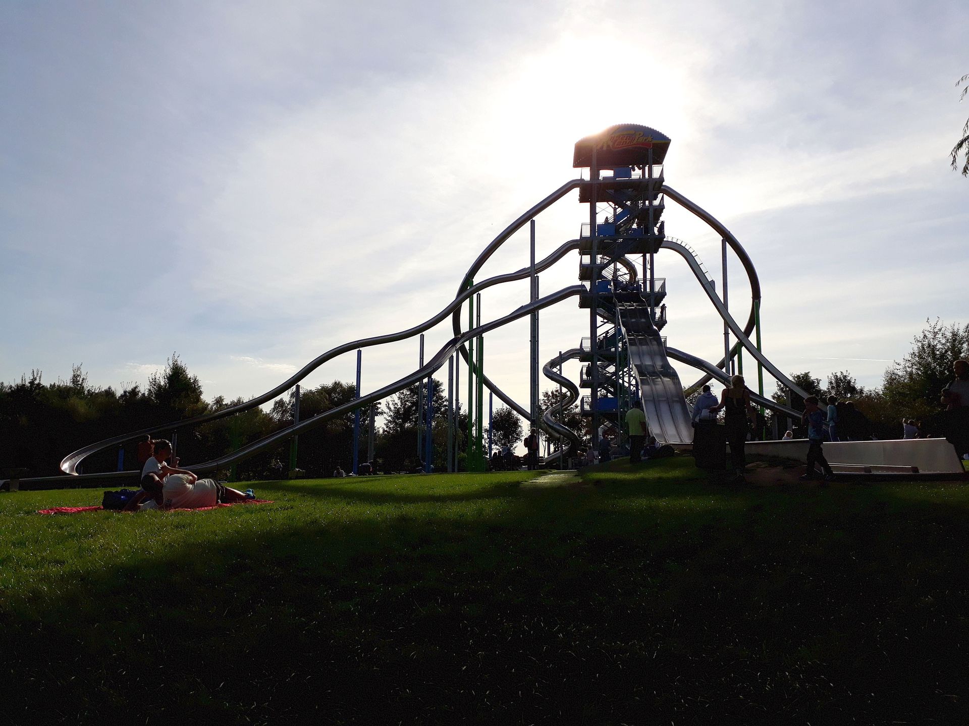 Nichts für Leute mit Höhenangst. Und auch Nichts für Unsportliche. Also eigentlich nix für mich. Das ist wirklich ganz schön hoch und man muss doch einige Stufen überwältigen. Ich war schon auf halber Höhe mit wackeligen Knien außer Puste. Oben angekommen wählten wir die linke Rutsche, also mit der Kurve rechtsherum. Da bekommt man tatsächlich auch ein ordentliches Tempo drauf. Der Übergang von der Kurve in den geraden Auslauf kommt allerdings etwas zu plötzlich, da hat es mich kurz auf die Seite gelegt, wobei ich mir ein paar kleine Schrammen am Unterarm zuzog. Trotzdem eine echt coole Anlage, die auch bei den anderen Besuchern extrem beliebt ist, die abgelegten Rutschmatten waren eigentlich immer in kürzester Zeit wieder neu vergeben. Ich hätte auch die anderen Rutschen gerne noch ausprobiert, wenn wir mehr Zeit - und Puste - gehabt hätten.