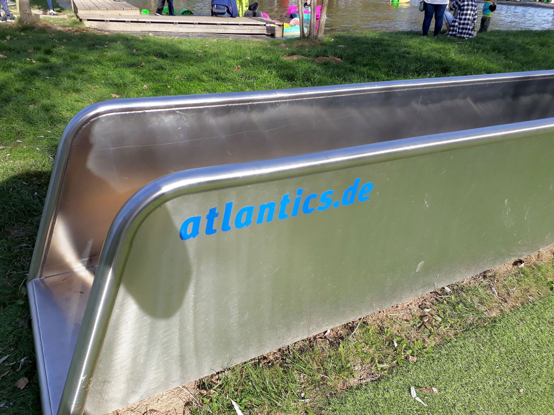 Die Gründer des Unternehmens waren nach der Wende arbeitslos geworden und wollten sich ihre Brötchen eigentlich mit dem Import von Spielzeug aus Fernost verdienen. Dazu fehlte allerdings Kapital, da die Asiaten ihre Massenware nur containerweise abgeben wollten. Also schwenkte man um und arbeitete mit Herstellern von Schaukeln, Wippen und Co. zusammen. 1996 verkaufte man schließlich die erste Evakuierungsrutsche an einen Kindergarten in Sachsen-Anhalt. Als kurz darauf alle öffentlichen Gebäude einen zweiten Fluchtweg aufweisen mussten, entwickelten sich die in Dänemark eingekauften Evakuierungsrutschen zum Hauptgeschäft von atlantics. Allerdings konnte man sich mit den neuen Besitzern des bisherigen Herstellers nicht mehr einigen, sodass man ab 2000 die Produktion einfach selbst in die Hand nahm. Inzwischen liefert man von Döbeln aus hunderte Rutschen jährlich in mehr als 50 Länder dieser Welt. Dazu zählt eben auch der hiesige Rutschenturm im Sonnenlandpark, der 2018 mit zunächst sechs Rutschen an den Start ging. Dabei blieb die oberste Etage des 30 Meter hohen Turms noch frei, die dortige Spiralrutsche wurde zusammen mit zwei weiteren auf den unteren Ebenen erst im Folgejahr installiert. 2020 komplettierten die beiden Steilkurven-Rutschen von der obersten Ebene den Turm, der somit nun über 11 verschiedene Rutschen mit Starthöhen zwischen 5 und 25 Metern verfügt. Vom Erfolg des Rutschenturms überzeugt, wurde 2020 übrigens auch im Schwesterpark am Bodensee ein solcher installiert - wenn auch mit "nur" 8 Rutschen und wenige Meter kleiner.
