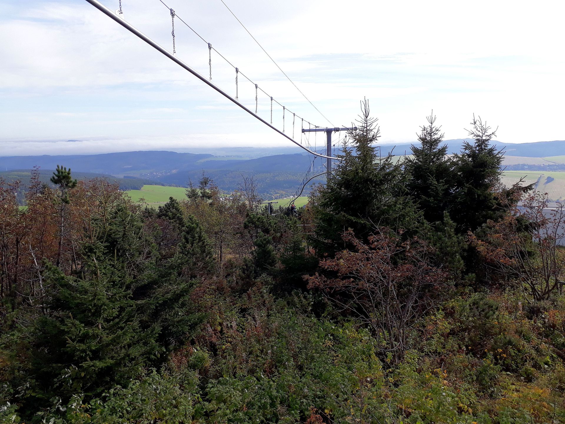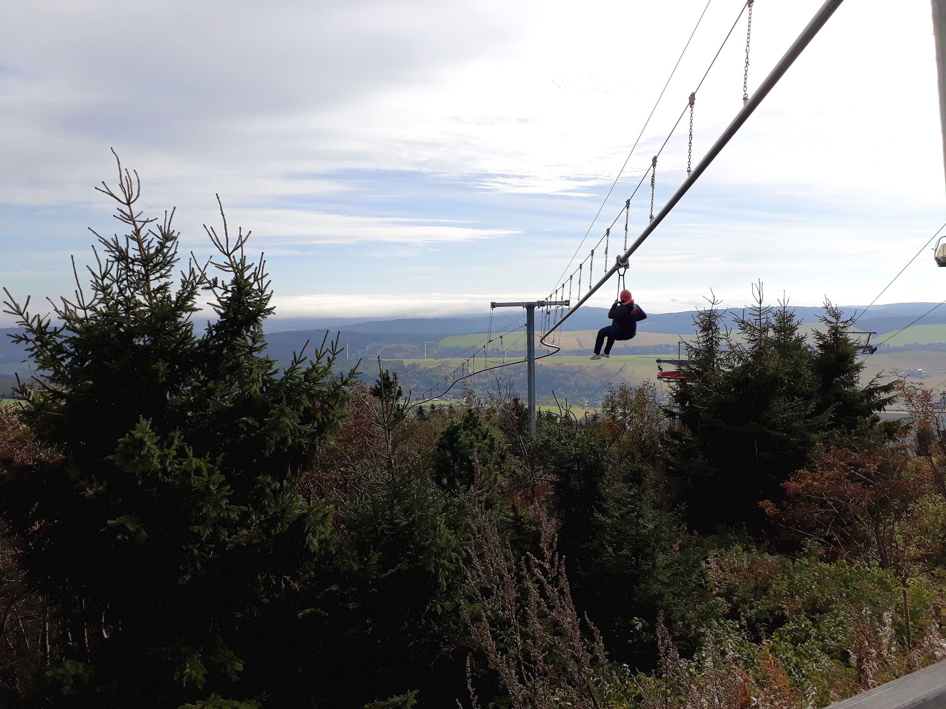 Wegen der guten Aussicht allein waren wir aber natürlich nicht hier. Denn vor wenigen Jahren hatte einer der (ehemaligen) Geschäftsführer der LGO im Urlaub eine Idee, wie man den Sessellift auch im Sommer besser auslasten könnte. Im Urwald von Costa Rica hatte er nämlich eine Zip-Line genutzt und wollte eine solche auch in Oberwiesenthal installieren. Das war aufgrund der geologischen Voraussetzungen aber wohl nicht möglich. Stattdessen stieß er auf die Firma Hochkant, welche im deutschsprachigen Raum den Vertrieb des Systems Fly-Line übernimmt. Und dieses ließ sich 2018 tatsächlich auch am Fichtelberg umsetzen - wenn auch zum Ärger des Naturschutzbunds, der bei den Planungen wohl einfach übergangen wurde und erst zufällig von der Anlage mitten im Brutgebiet der vom Aussterben bedrohten Ringdrossel erfuhr... Ohne Rekorde geht in Oberwiesenthal aber offenbar nichts, sodass die hiesige Fly-Line nicht nur die erste Sachsens, sondern obendrein auch noch die längste der Welt sein soll. Auf 1.550 Metern werden knapp 300 Höhenmeter überwunden. Zuvor heißt es aber Ticket einscannen, Gurt anlegen und Helm aufsetzen.