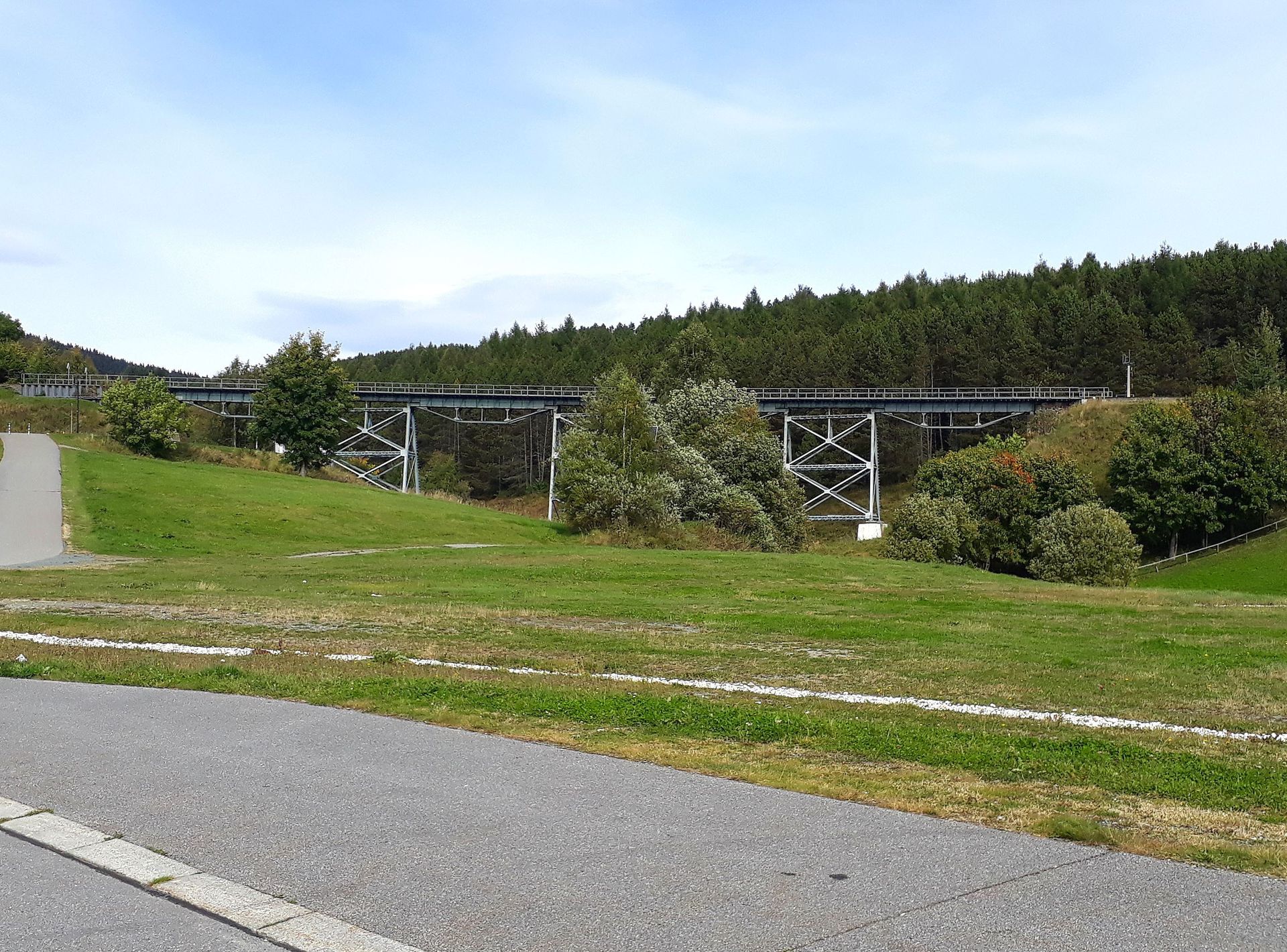 Kurz vor Erreichen des Bahnhofs Oberwiesenthal überquert die Bahn das 100 Meter lange und knapp 20 Meter hohe Viadukt Hüttenbachtal.
