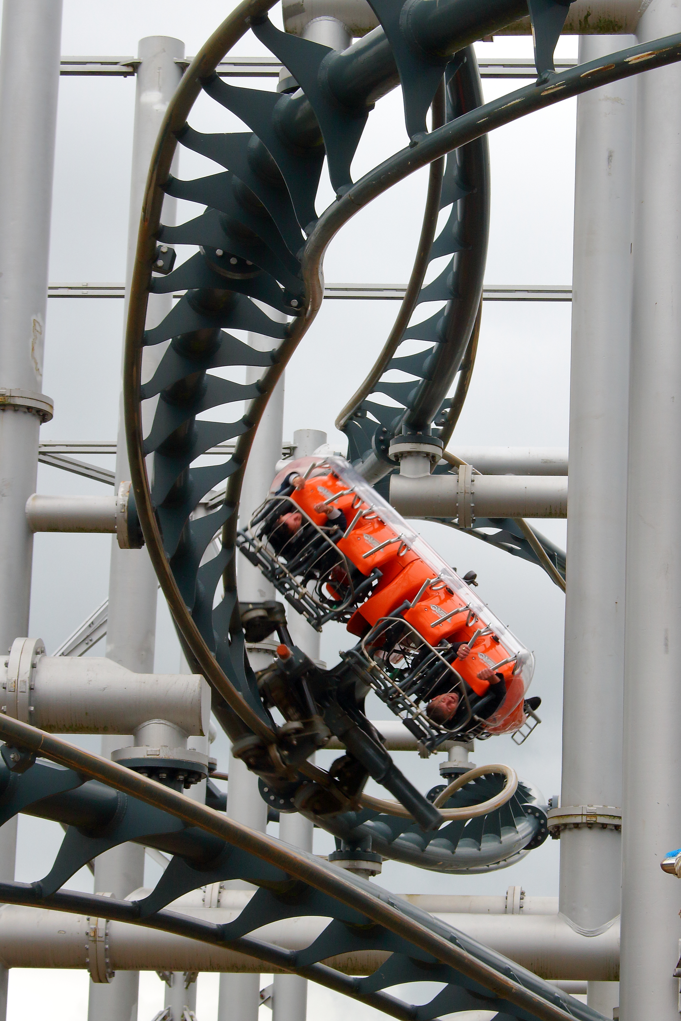 Vorne schießt der Zug noch mit genügend Tempo hinein, dass tatsächlich kurz das Gefühl von Schwerelosigkeit aufkommt, die dann aber durch die Verlangsamung des langen Zuges nach einem Teil der Drehung aufhört und man sich plötzlich wieder im Sitz findet.