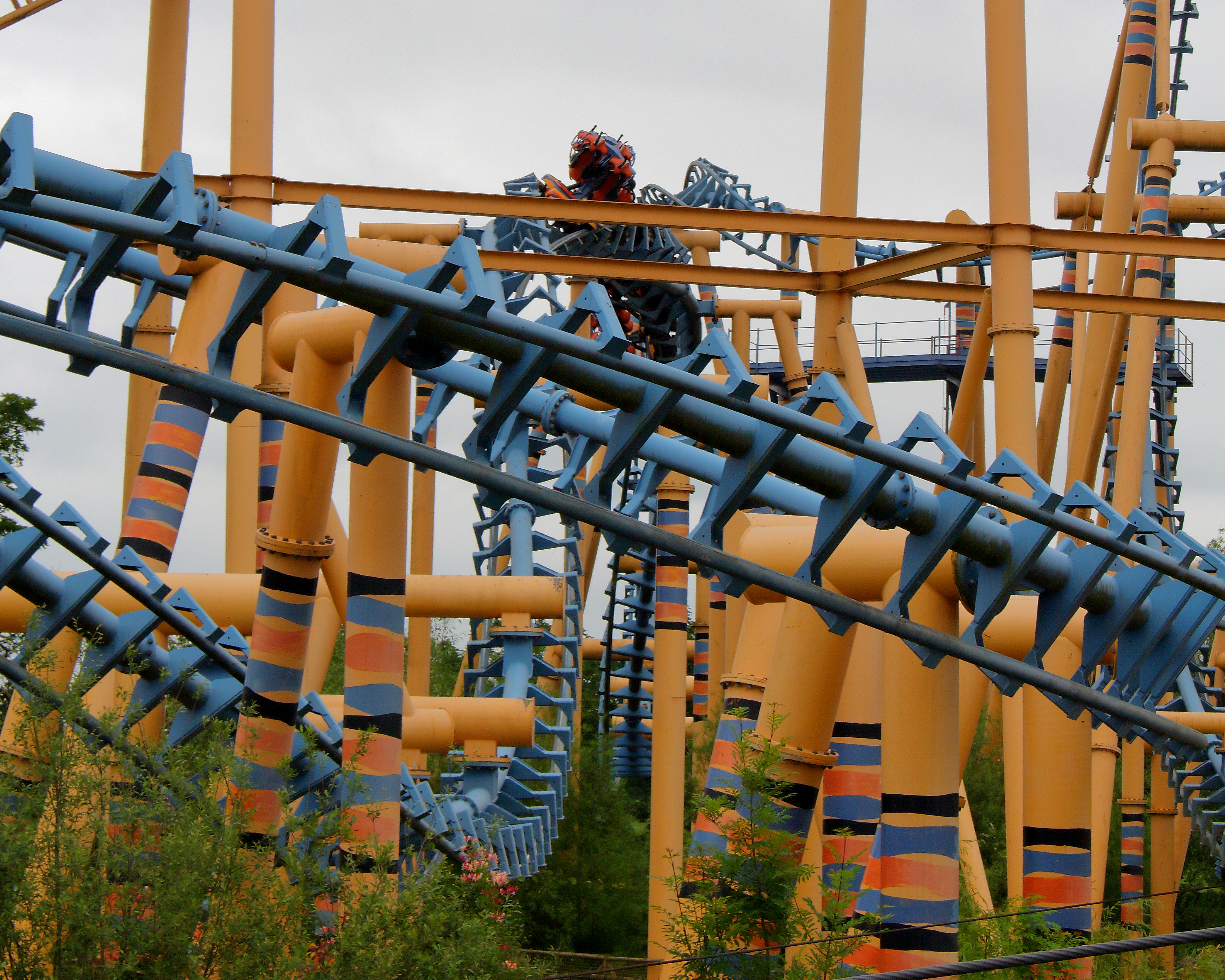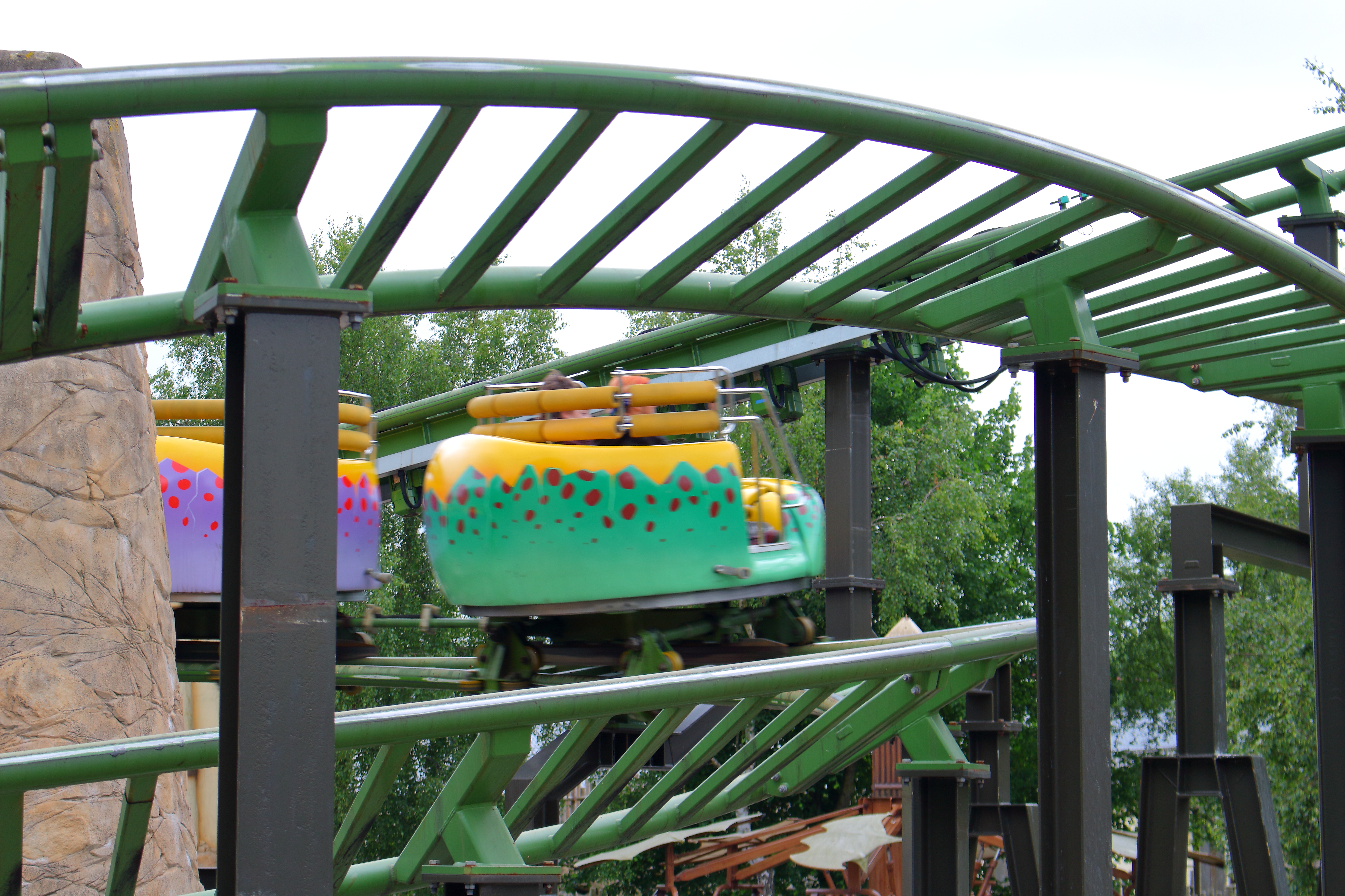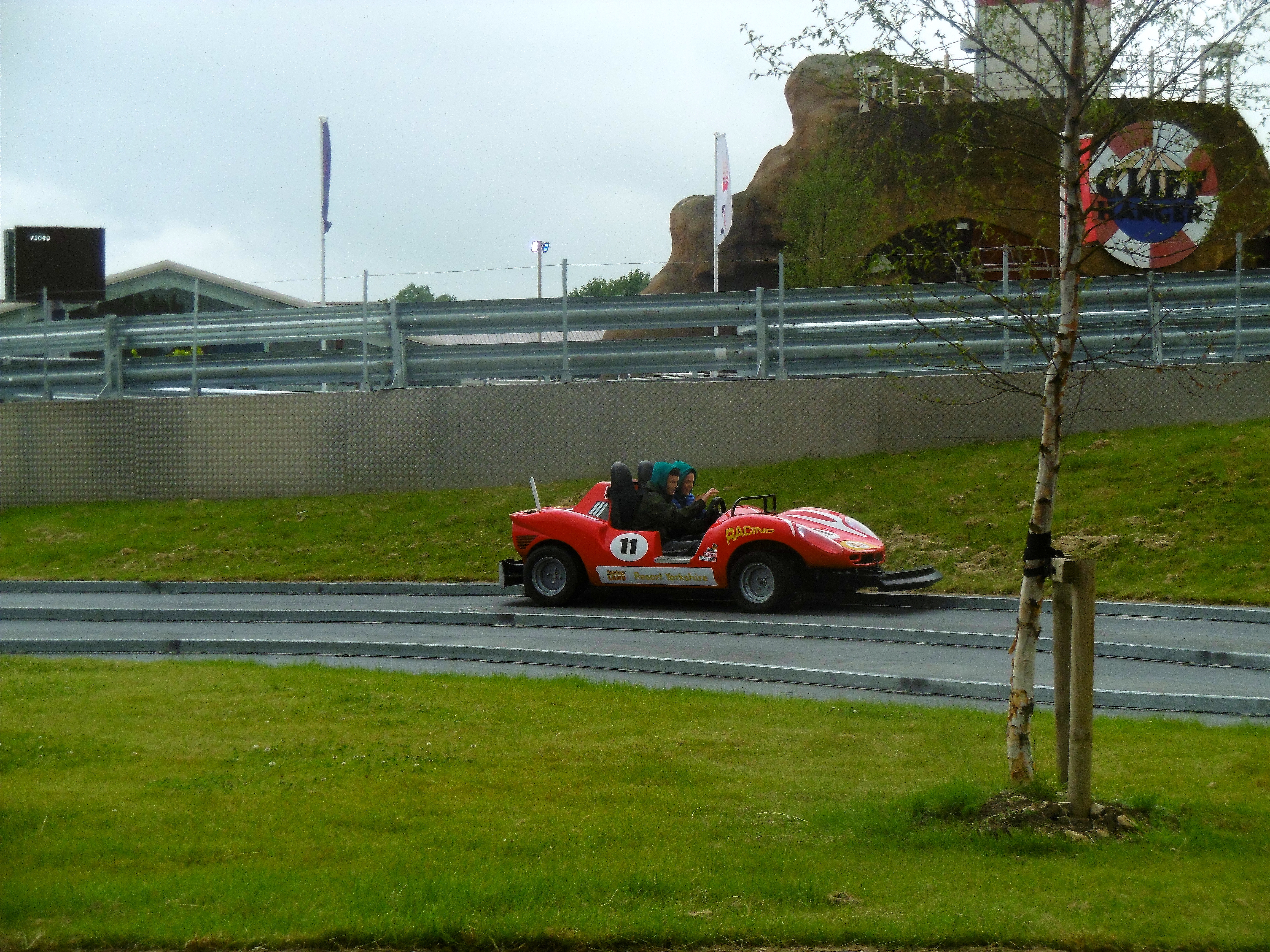 Einerseits eine lange Strecke mit einer ebenso langen Fahrtzeit (die umso besser ist, wenn es dabei auch noch schön zu regnen beginnt). Diese lange Fahrzeit kommt aber auch durch die unglaubliche Drosselung der Fahrzeuge zustande. Spaß kam so keiner auf, von Renn-Feeling ganz zu schweigen. Leider der größte Flops des Parks, für den sich die mittlerweile vorhandene kurze Wartezeit nicht gelohnt hat.