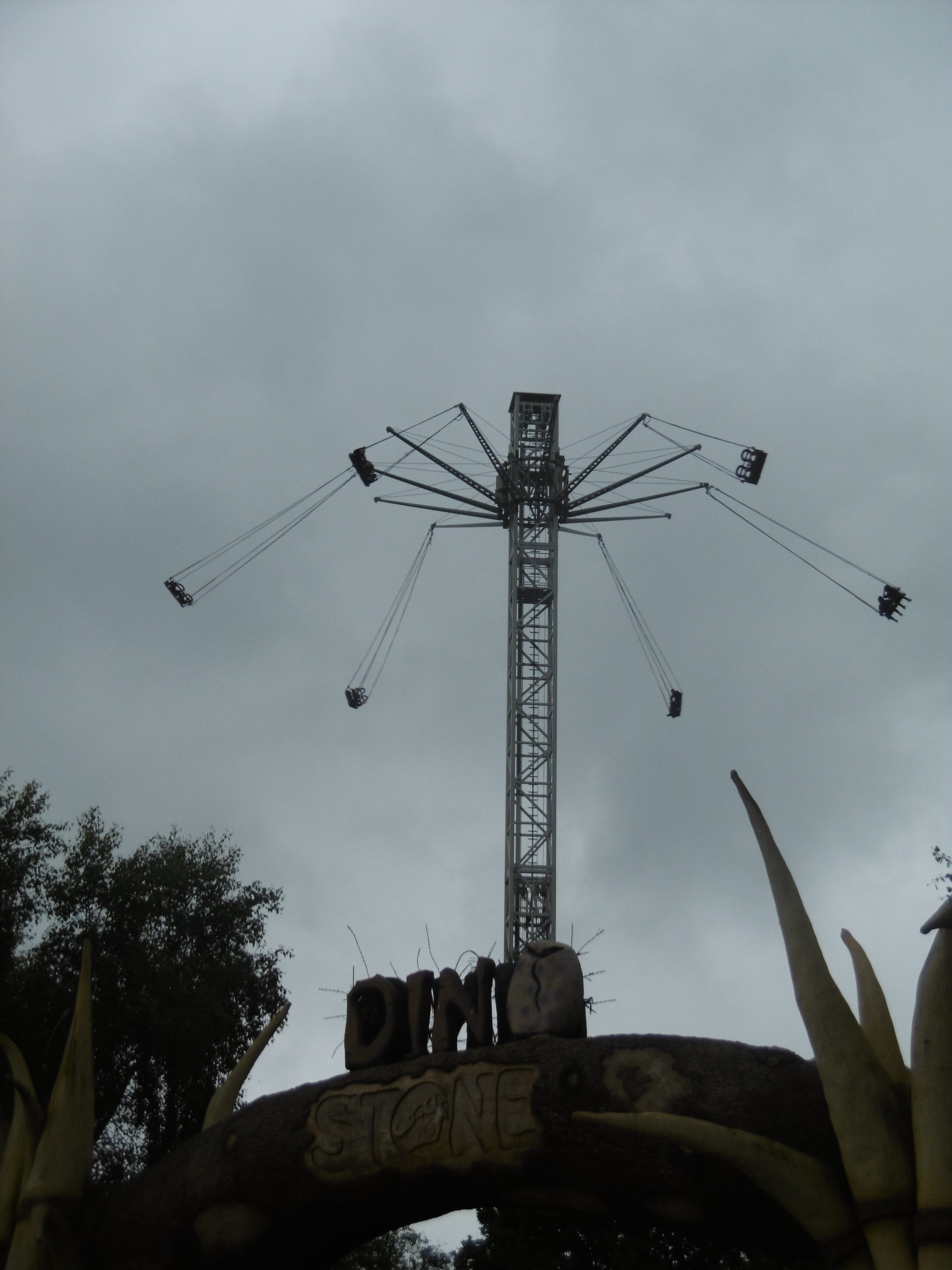 Ein S&S-Turm, dessen weiß-rote Verkleidung im Eröffnungsjahr 2002 noch bis zur Spitze reichte, nach einem Jahr aufgrund von Anwohnerbeschwerden (da haben die schon so wenige …) wieder entfernt wurde.