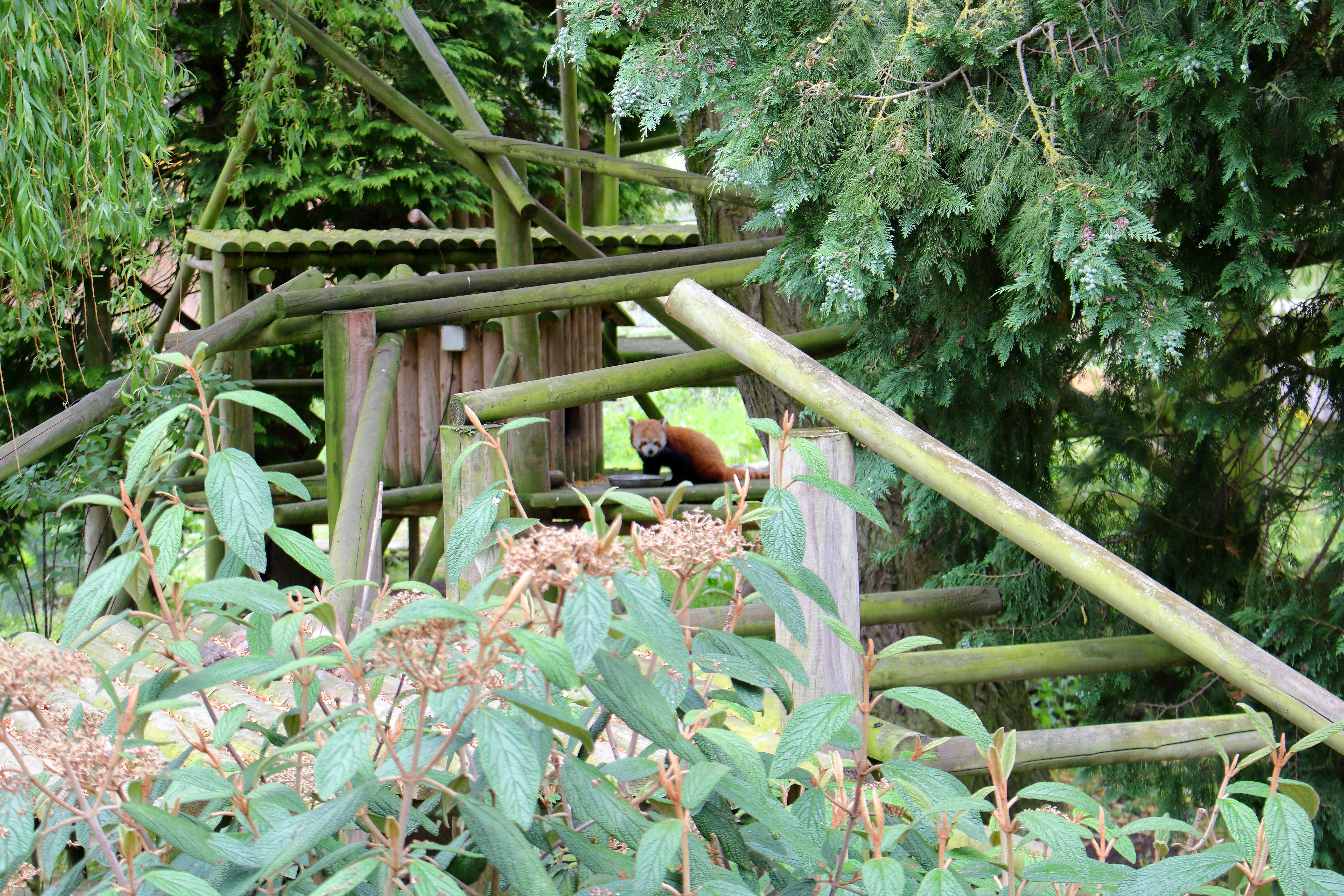 Direkt neben der Bühne gibt es ein Gehege mit roten Pandabären, …