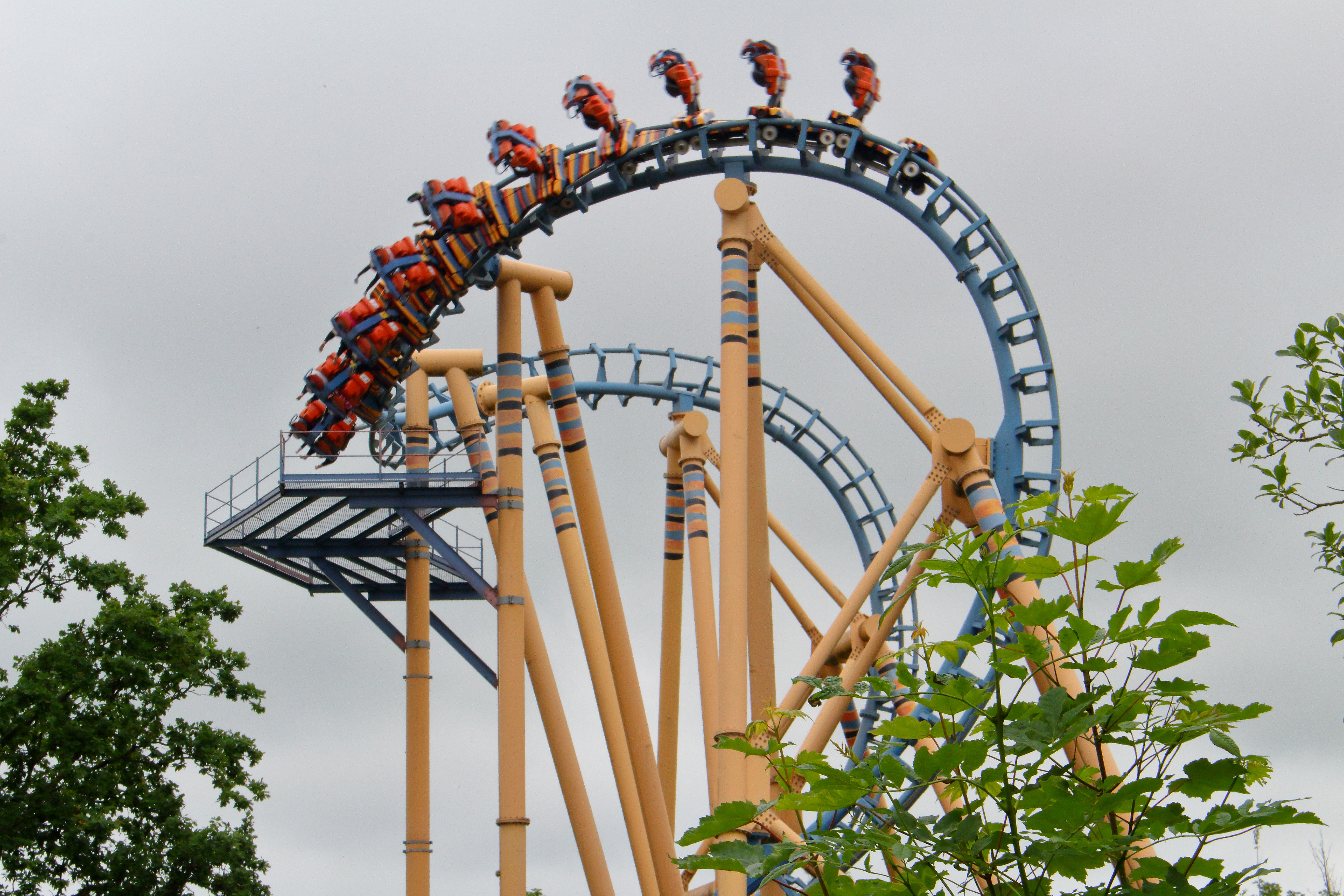 Und der Looping wird auch mit ordentlich Tempo befahren. In den hinteren Reihen wird der Zug dabei auf dem Weg zur Überkopf-Position langsamer, wodurch sich die Innereien wieder etwas Richtung Kopf für kurze Zeit bewegen.