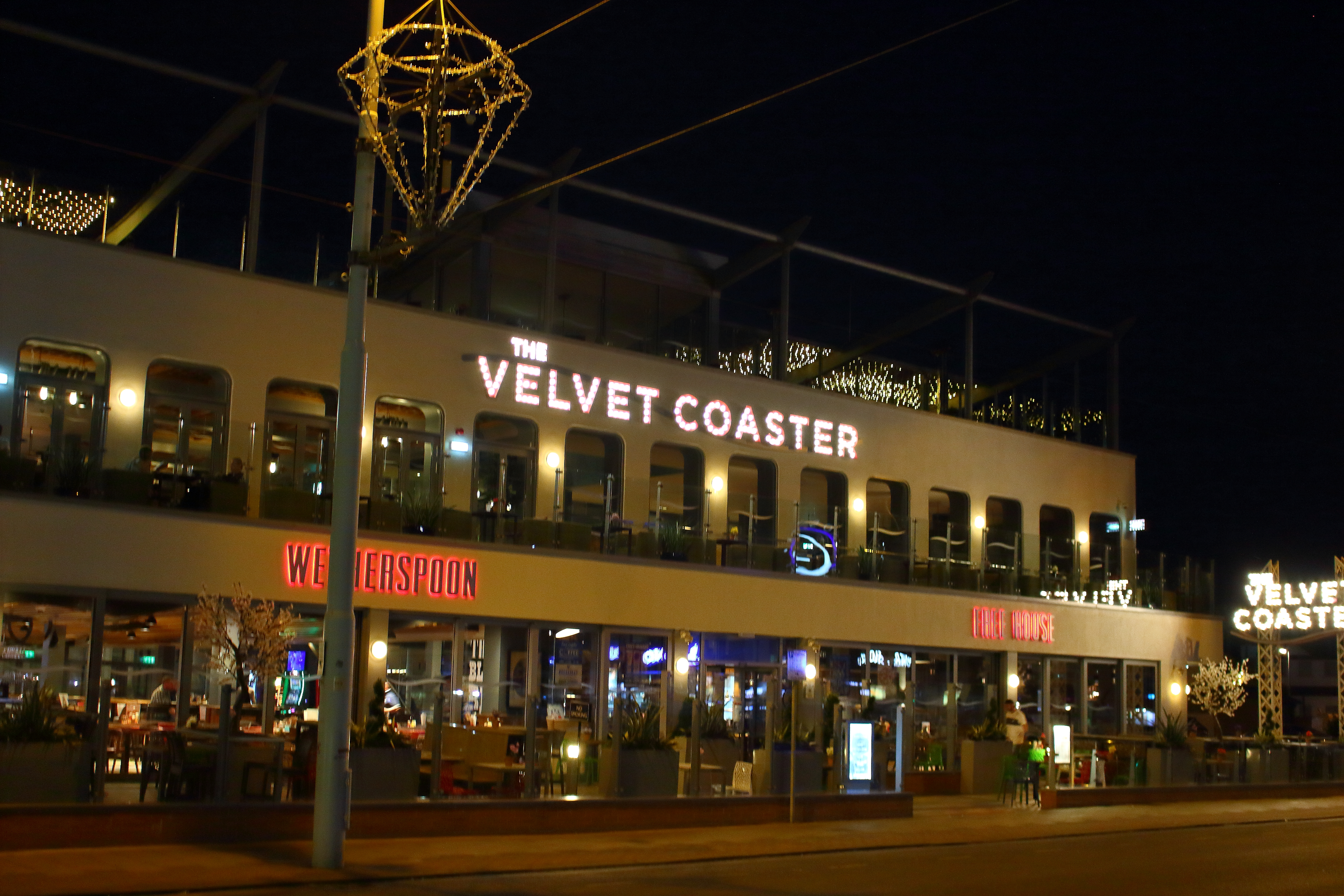 Ort unseres Treffens war der Velvet Coaster, hier etwas später in der Nacht aufgenommen, wo wir es uns auf der schicken Dachterrasse bequem gemacht und Pizza gegessen haben.