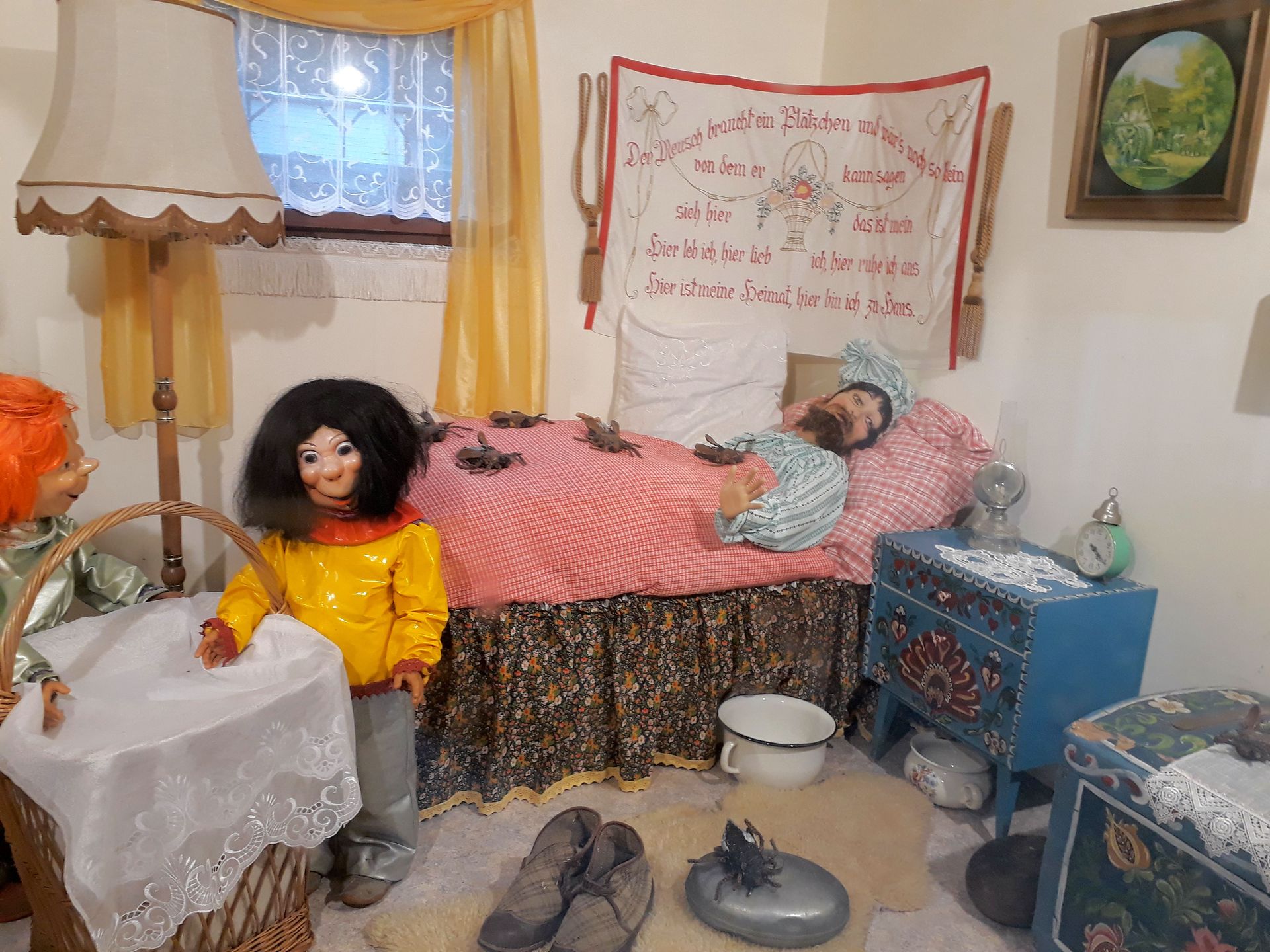 Dem Weg folgend trifft man auf einige Hütten, in denen die Streiche von Max und Moritz dargestellt werden. Aufgrund der Pfeife tippe ich hier auf Lehrer Lämpel.