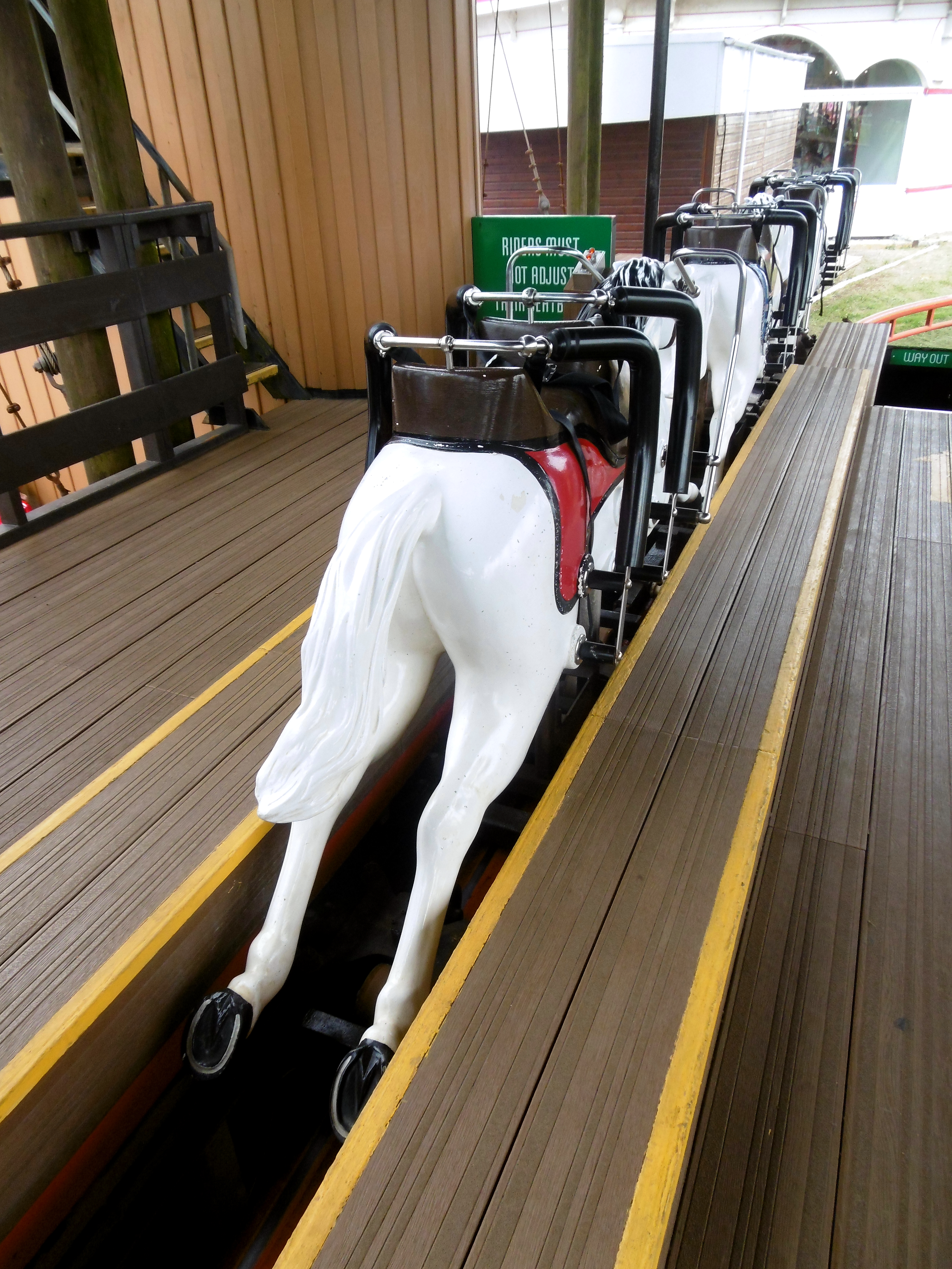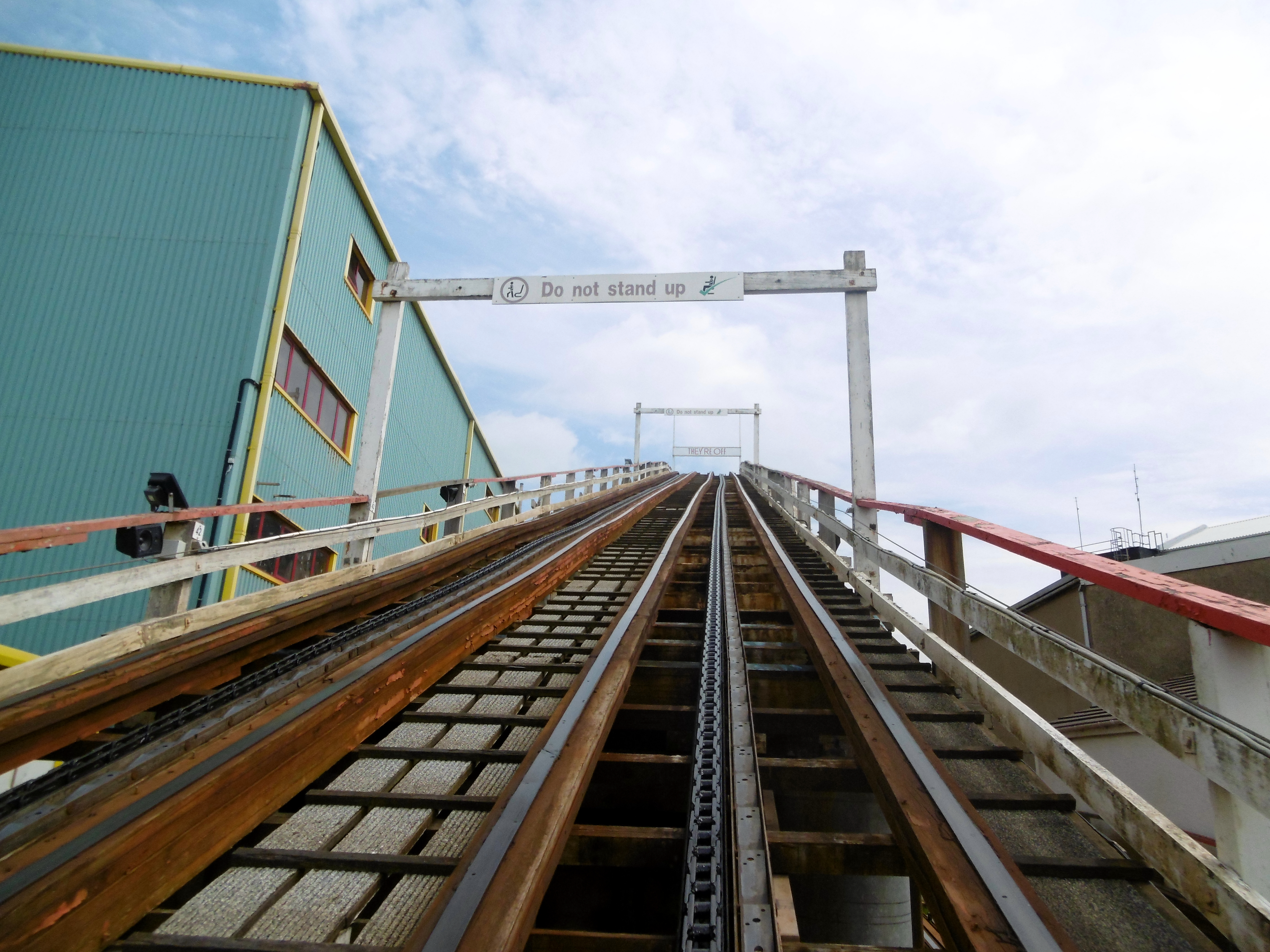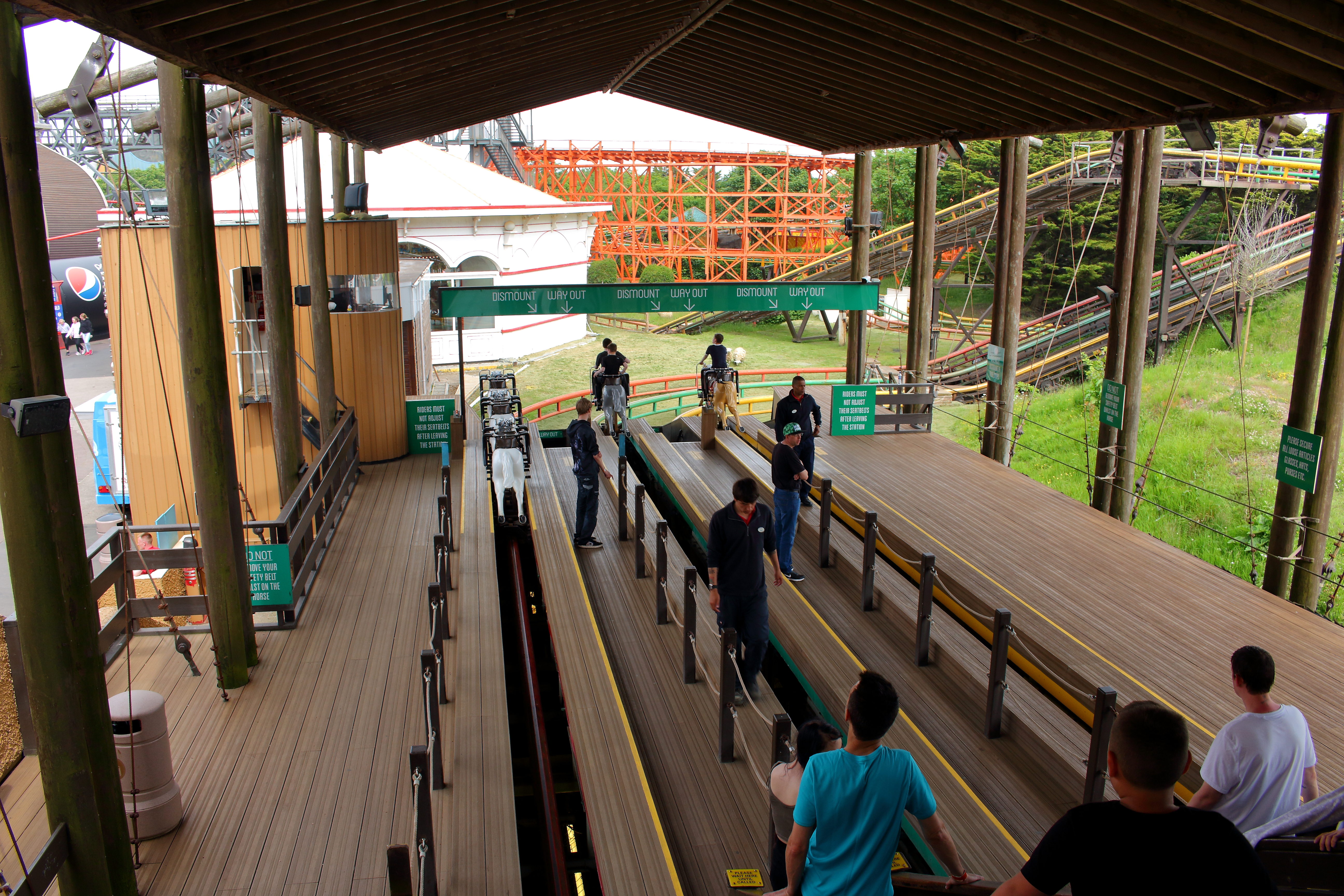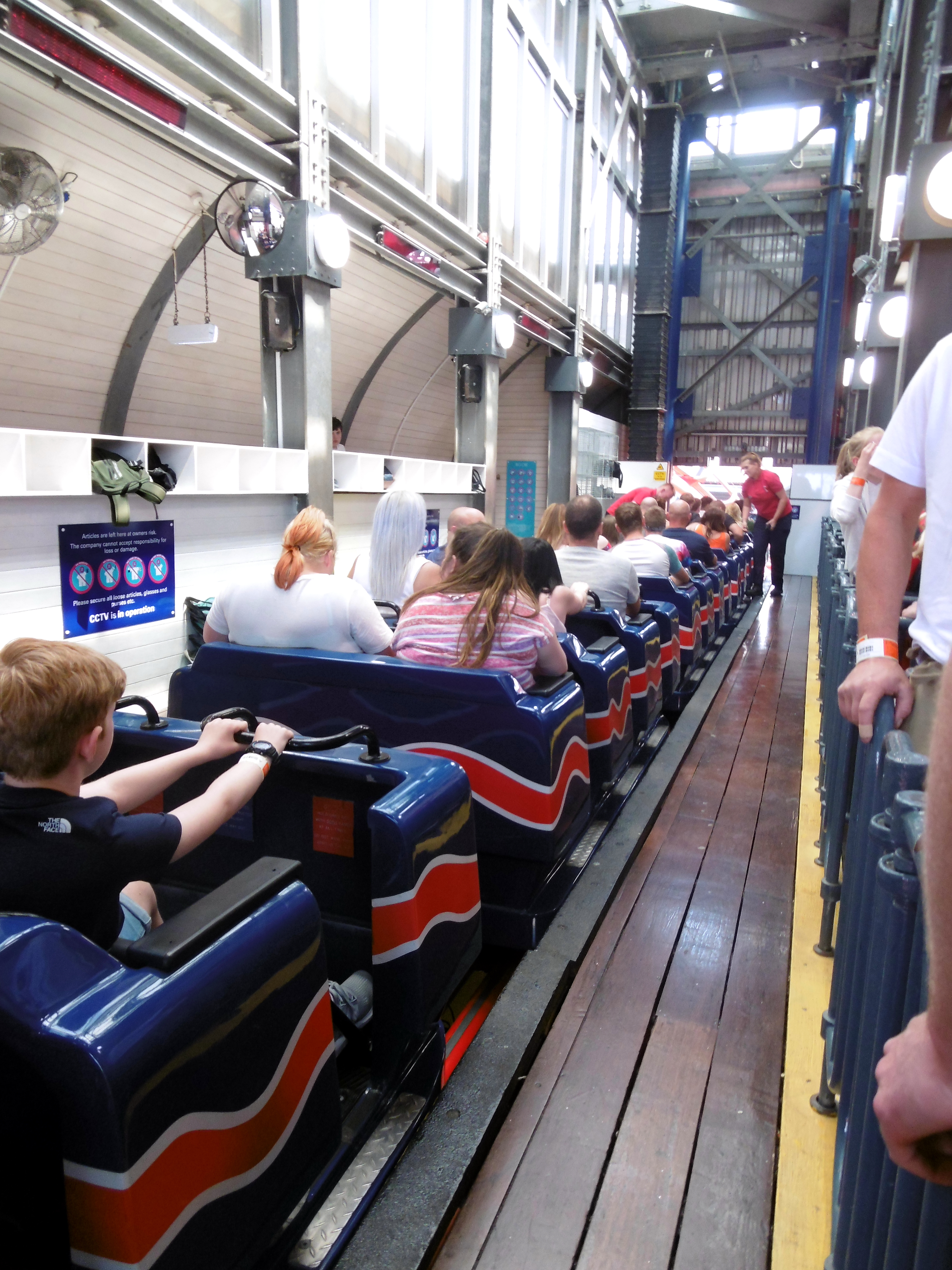 Gedrückt trifft es auch gut. Denn hier, wie auch bei den anderen Woodies, werden die Verschiebegleise noch per Muskelkraft verstellt. Da wäre ich in der Prachtzeit der Woodies gerne mal Operator gewesen. Denn die Bahn wird heute vollautomatisch gebremst und nicht wie früher per Hand. So ist es immer wieder ein nettes Spektakel, bis es der Zug von der Ausstiegsplattform zum Einstieg geschafft hat. Dabei untermalt mit einer Hintergrundmusik, die einem Horrorfilm alle Ehre macht und einer Ansage, die mit „Grand National is a wonderful ride“ beginnt, was den Irrsinn dieser Attraktion nur noch unterstreicht. Daher Simon: Du hast nicht zu wenig versprochen!