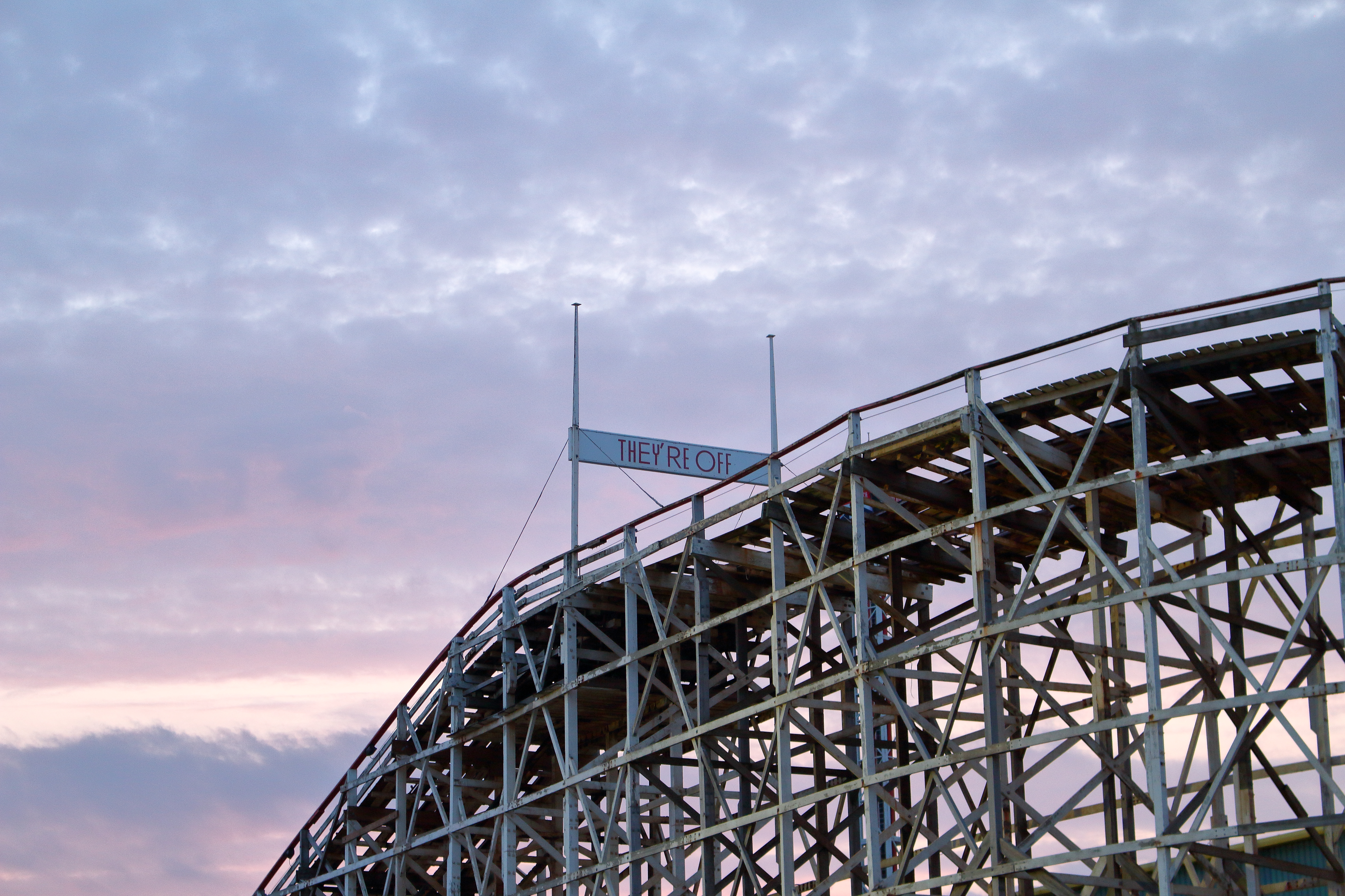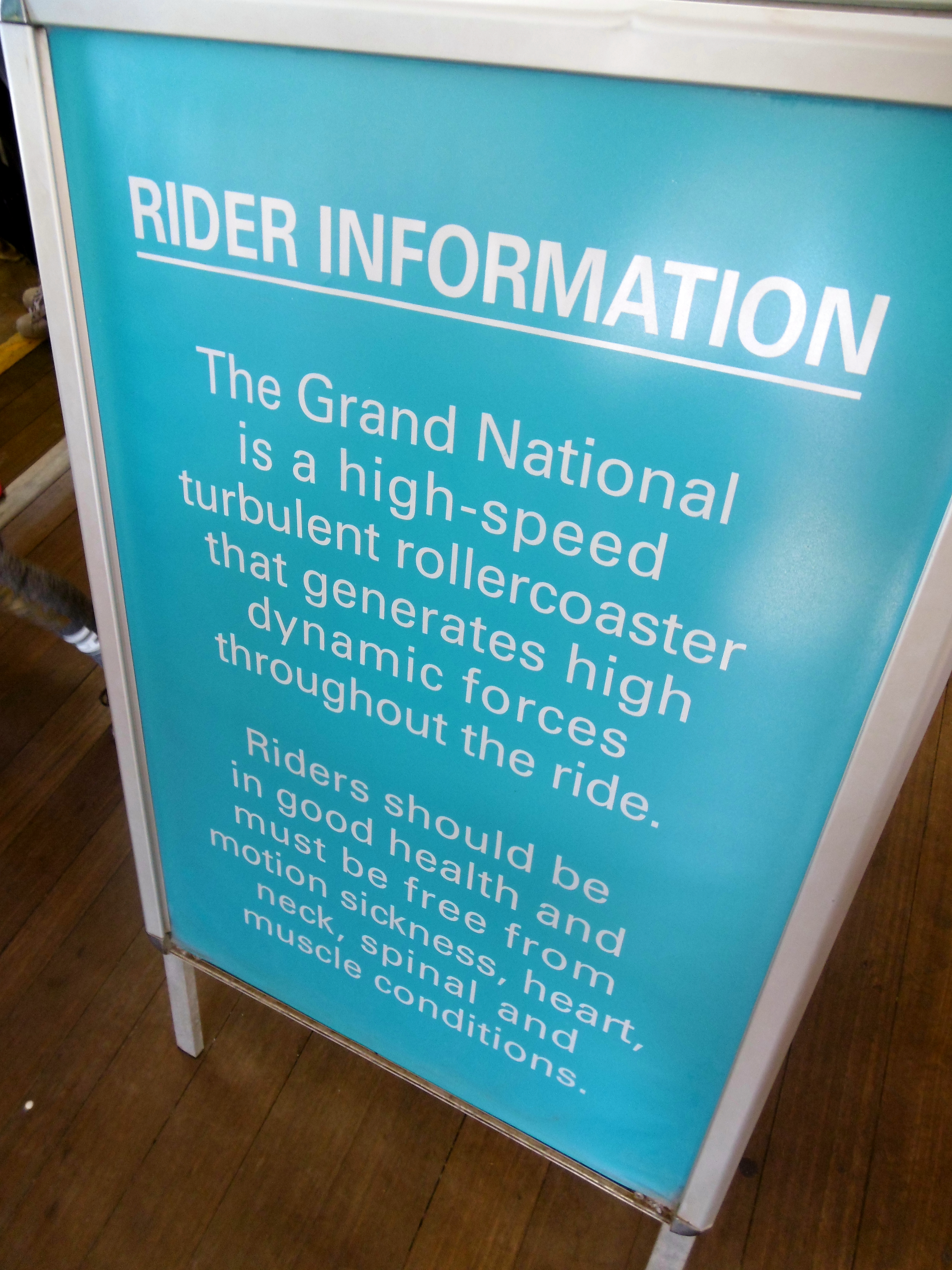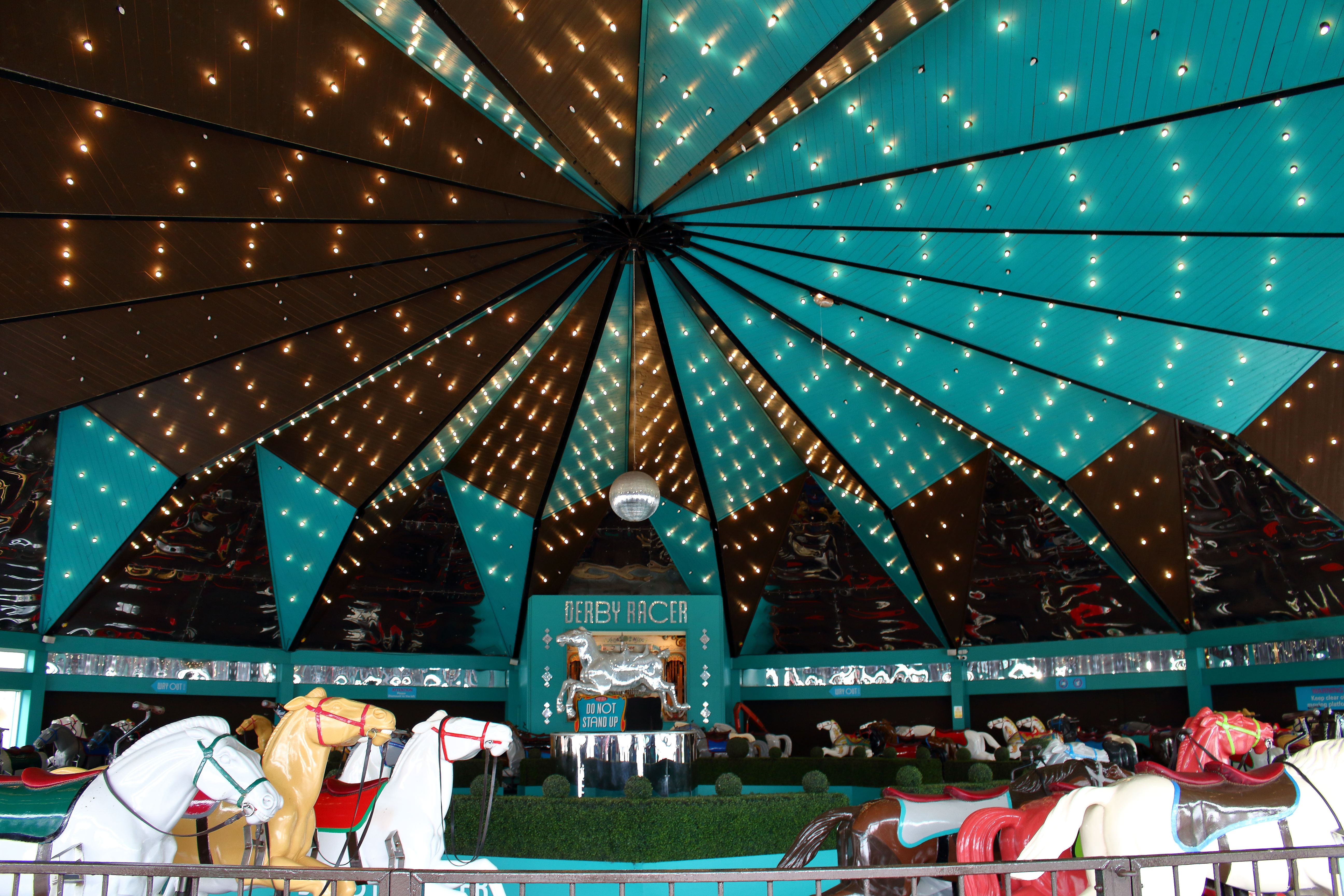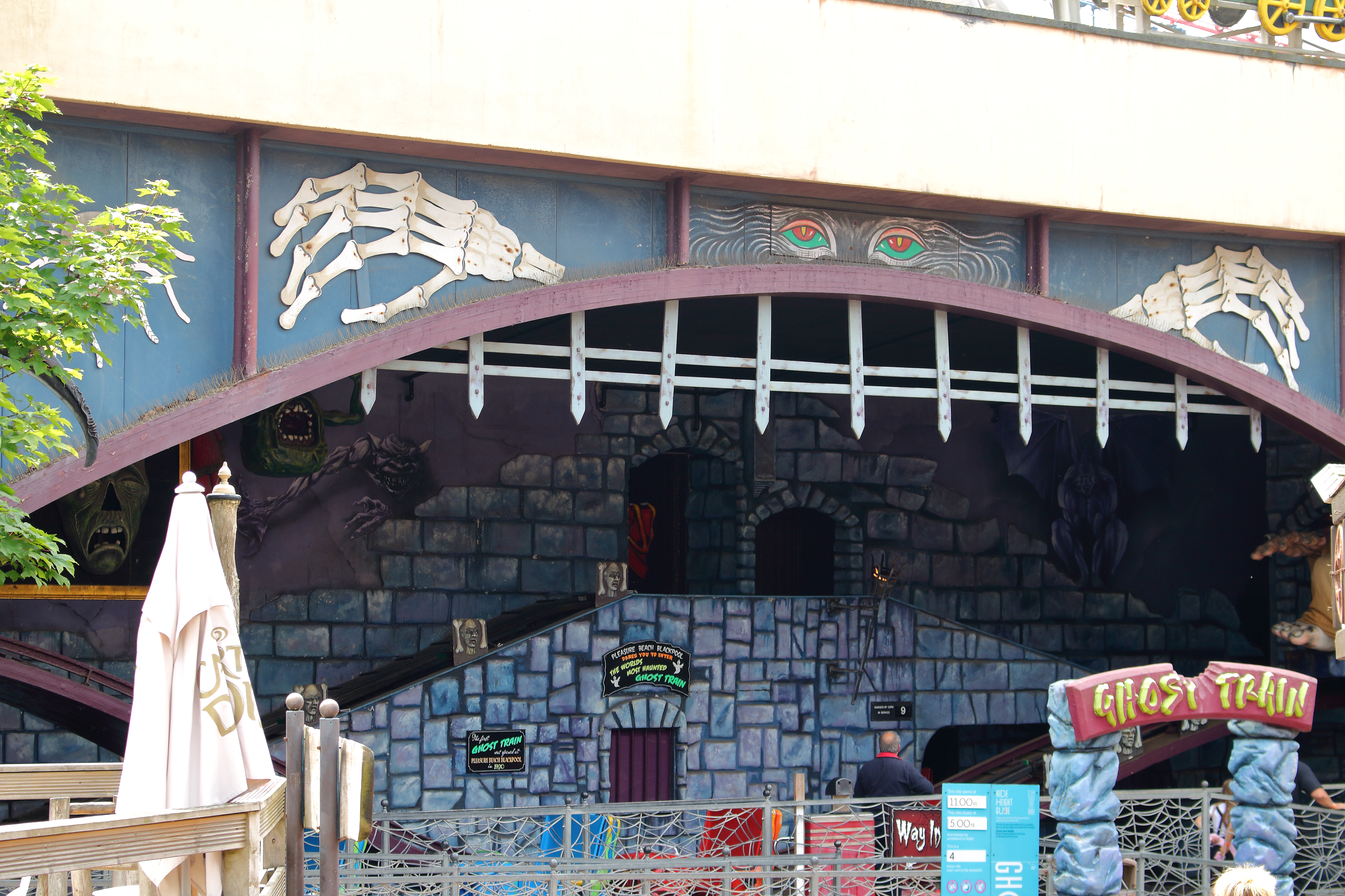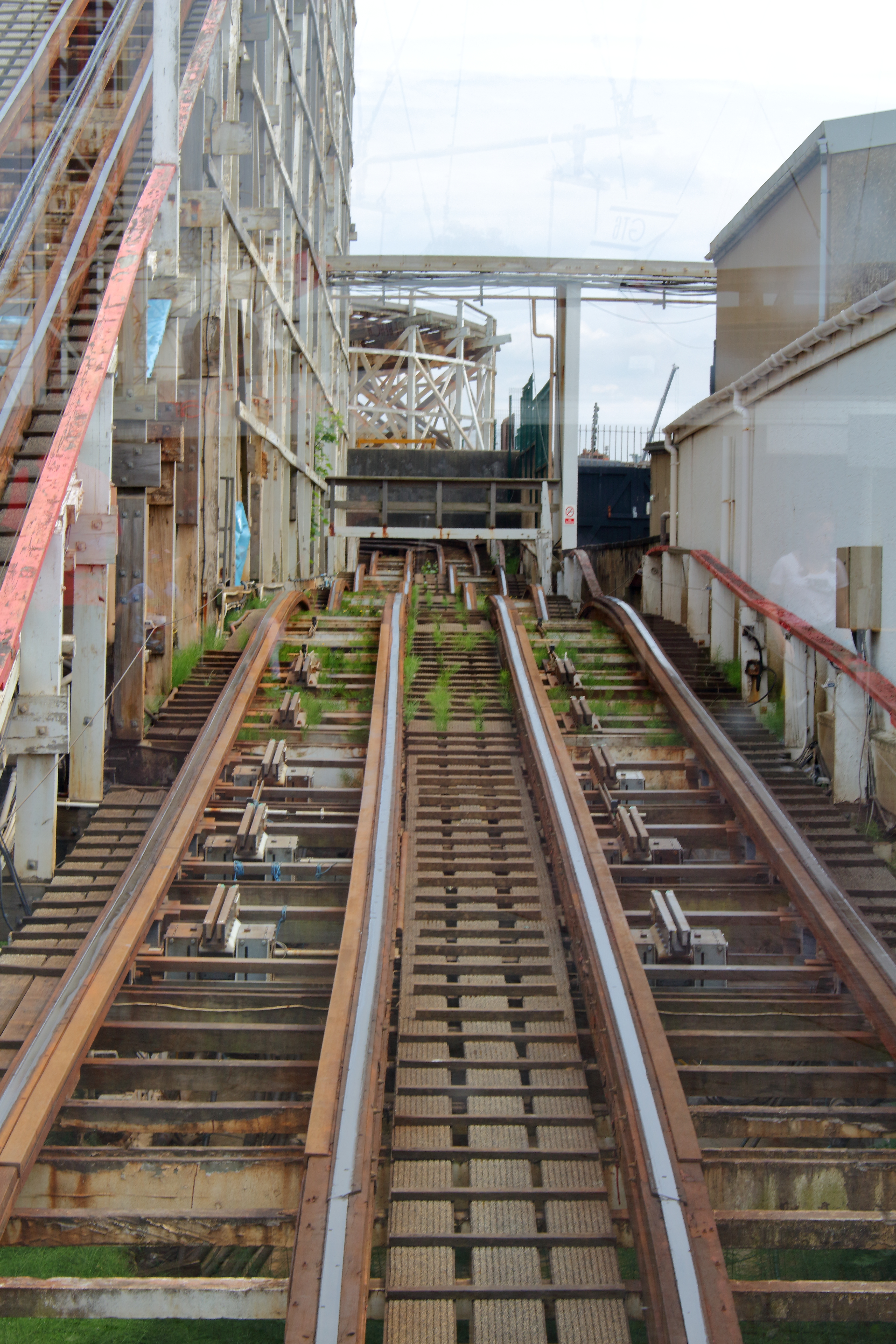 Gedrückt trifft es auch gut. Denn hier, wie auch bei den anderen Woodies, werden die Verschiebegleise noch per Muskelkraft verstellt. Da wäre ich in der Prachtzeit der Woodies gerne mal Operator gewesen. Denn die Bahn wird heute vollautomatisch gebremst und nicht wie früher per Hand. So ist es immer wieder ein nettes Spektakel, bis es der Zug von der Ausstiegsplattform zum Einstieg geschafft hat. Dabei untermalt mit einer Hintergrundmusik, die einem Horrorfilm alle Ehre macht und einer Ansage, die mit „Grand National is a wonderful ride“ beginnt, was den Irrsinn dieser Attraktion nur noch unterstreicht. Daher Simon: Du hast nicht zu wenig versprochen!