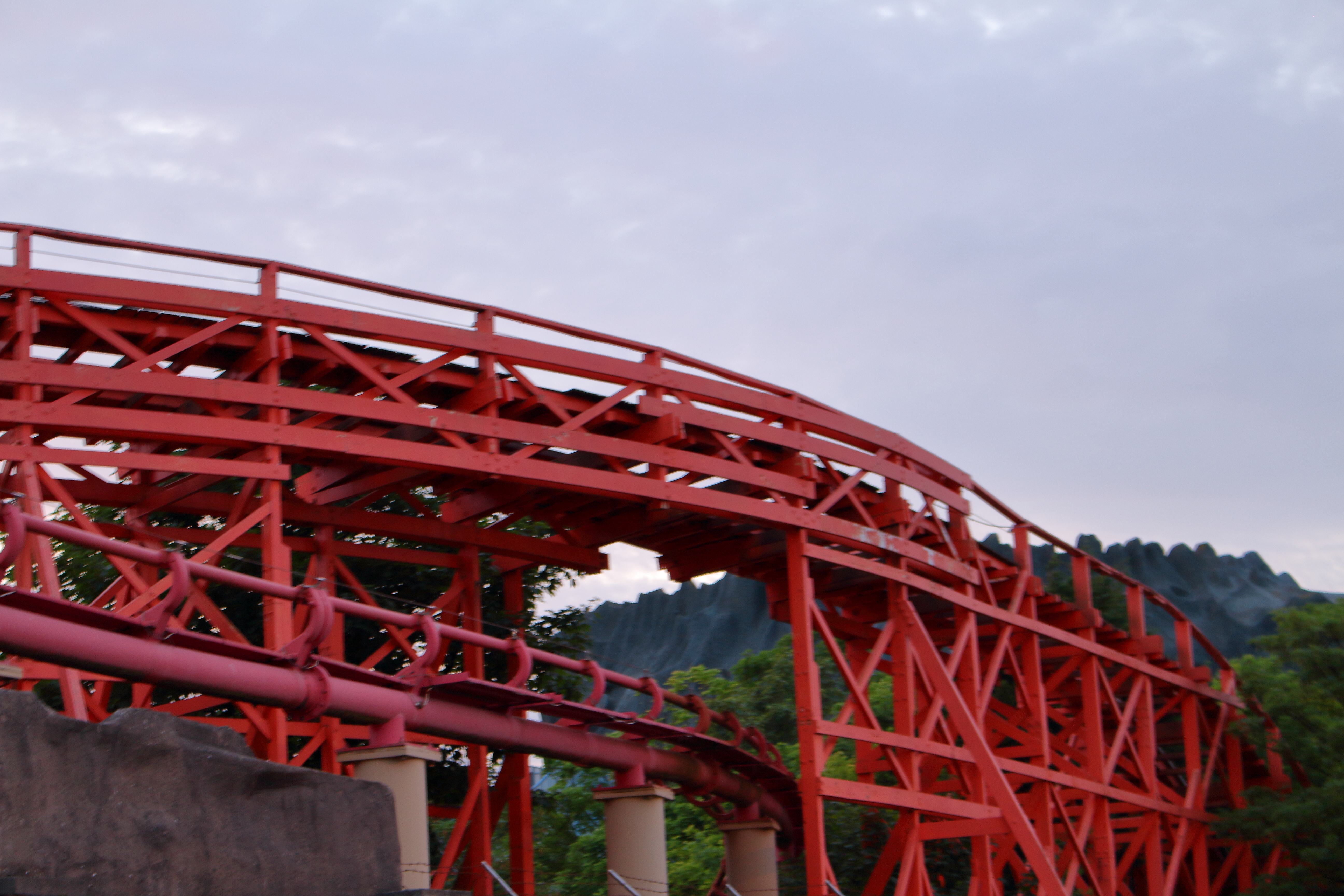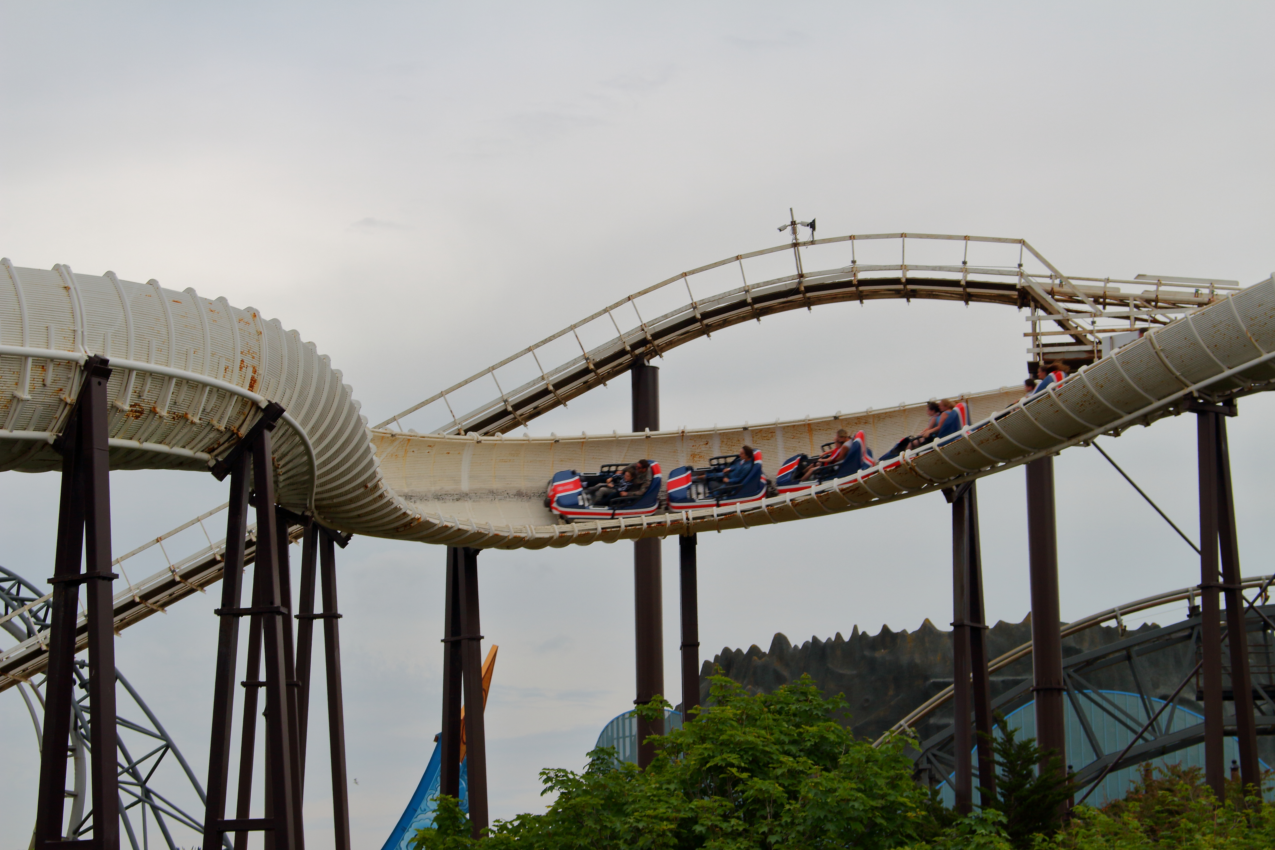 Da wir 1 ½ Tage vor Ort waren und ein chronologischer Ablauf wenig Sinn ergeben würde, werde ich den Park nun entgegen dem Uhrzeigersinn - vom Parkeingang startend – durchgehen. Hierbei wird direkt die erste Achterbahn des Parks angetroffen, die wir, wie die meisten Coasterfans, gekonnt aber links liegen lassen.