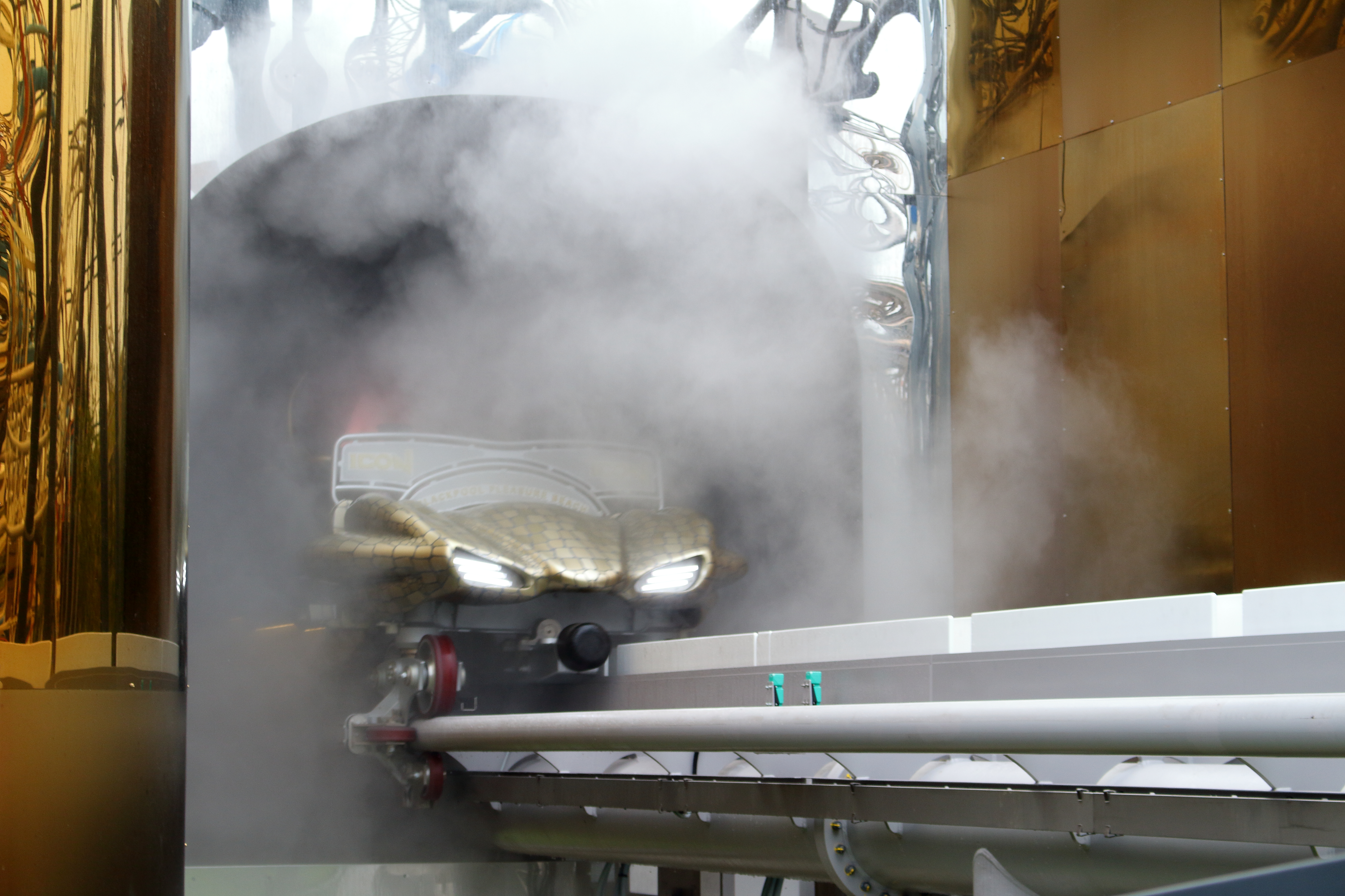 Auf dem Weg nach draußen wartet dann noch eine abschließende Fontäne auf die Rückkehrer, damit bloß keiner der Außenstehenden auf die Idee kommt, dass die Fahrt trocken ist.
