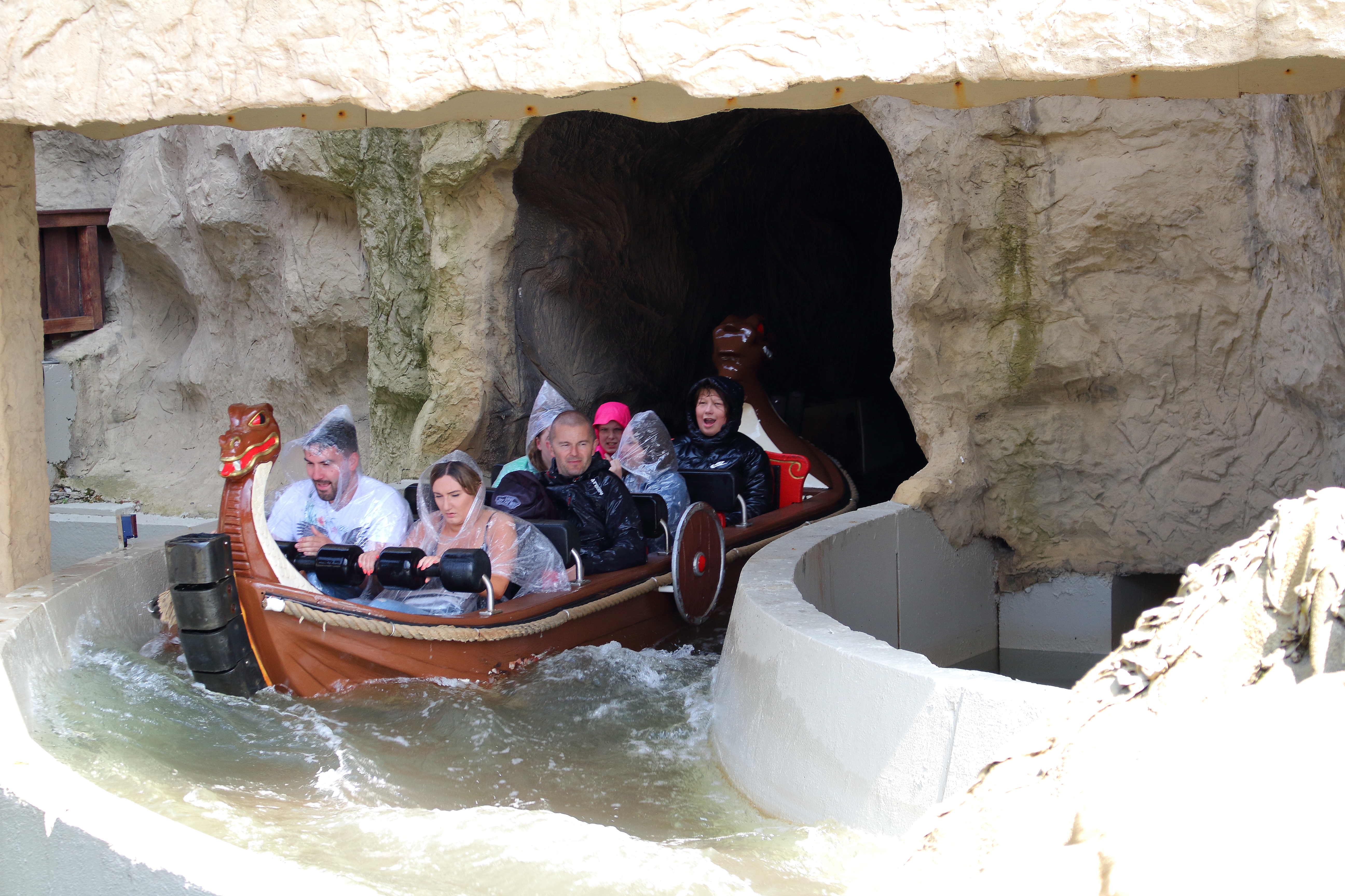 Mit Blick in das Boot in der Station war uns allen schon klar, dass es eine gute Entscheidung war, hier möglichst spät anzukommen. Denn schon bei der ersten Rechtskurve nach dem Lift strömt das Wasser nur so in das Boot, in dem zuvor schon zentimeterhoch das Wasser stand.