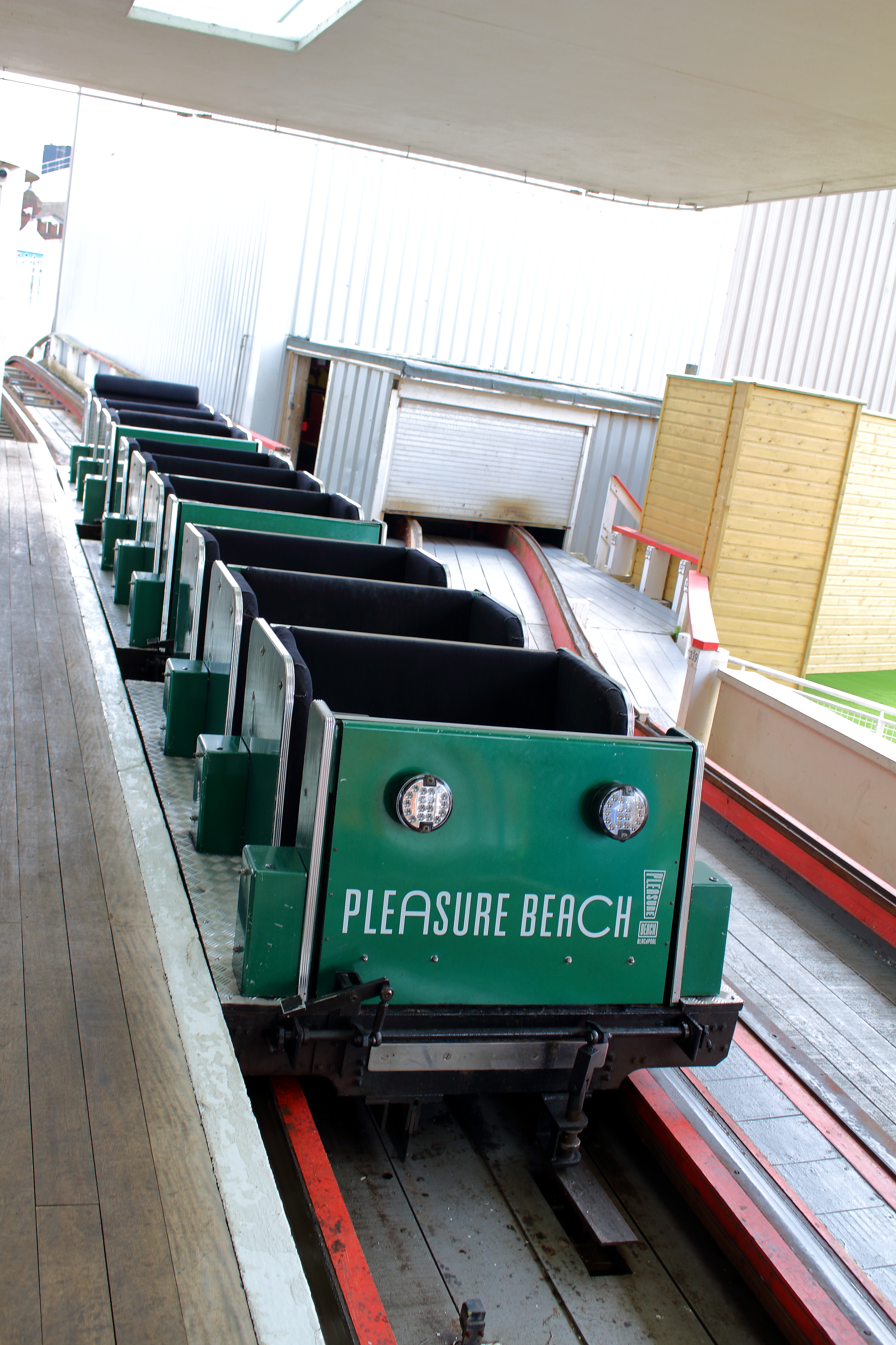 Nickelodeon Streak früher mal diverse Züge untergebracht waren. Heute findet sich dort nur noch ein alter Zug, der früher seine Runden auf dem Dipper gedreht hat. Daher auch hier PTC-Züge mit 4 Reihen, wie sie auch die alten Züge hatten. Aber mit dem Unterschied, dass die Dipper Züge eben Bügel besitzen und die alten Züge des ehemaligen „Roller Coaster“ nicht, sondern nur über Gurte. So hat die Bahn nicht nur bei viel Betrieb eine deutlich höhere Wartezeit, vielmehr geht auch noch das bügellose Feeling verloren. Und das Schlimmste: Wer um alles in der Welt hat sich den Polsterbezug der Sitze ausgedacht? Dessen Gestaltung stammt wie der Großteil der Bahn aus 1933. Bauleiter war hier jener Charles Paige aus Amerika, der hier an seiner ersten Bahn in GB arbeiten durfte.