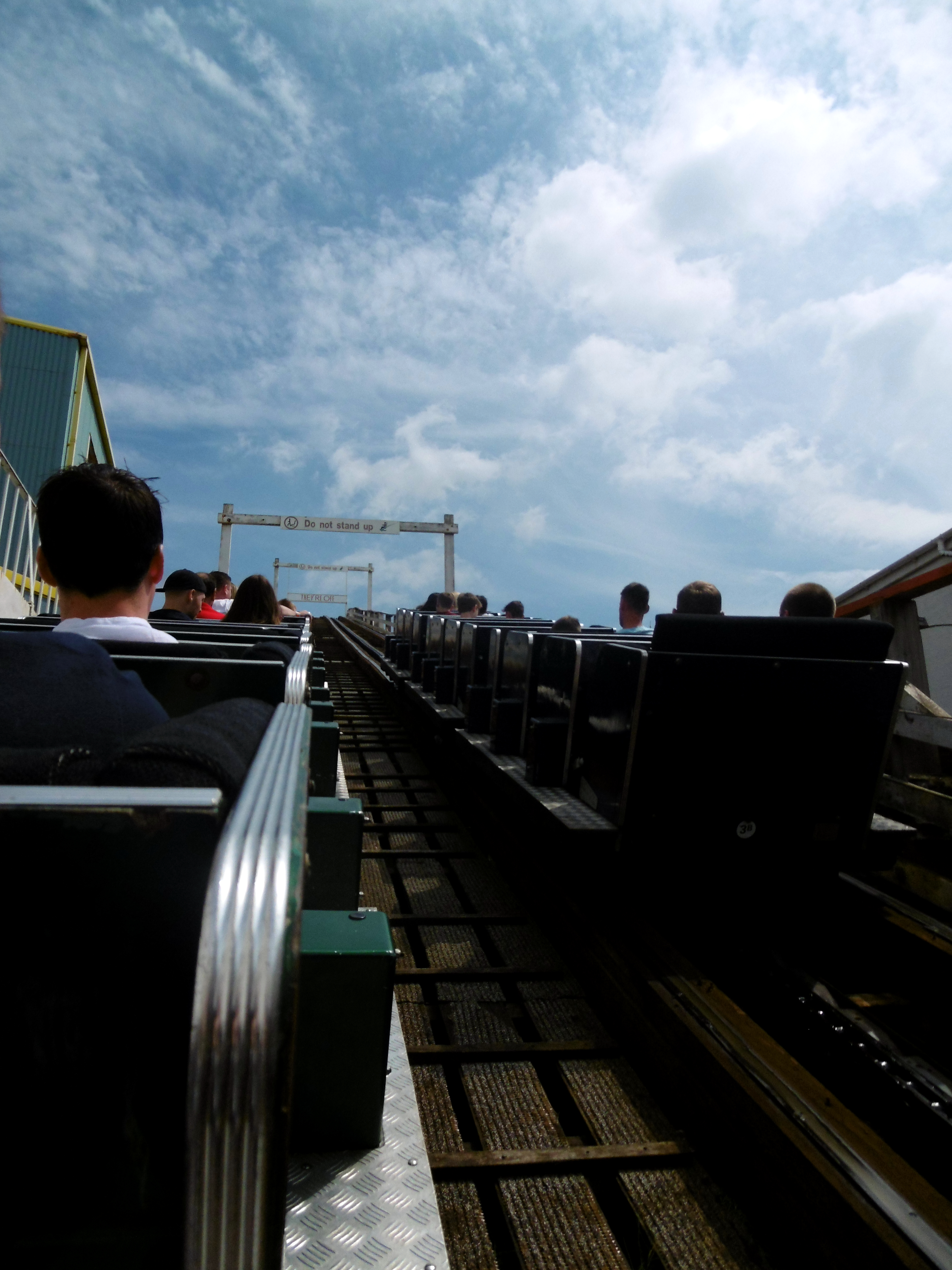 Wie ändert man das? Richtig. Nochmal! In der quasi nicht vorhandenen Warteschlange kam ich kurz mit einem englischen Familienvater ins Gespräch, dem ich erklärte, dass wir die Bahn erst zum Ende des Tages fahren, damit wir ohne Probleme mehrmals fahren können und notfalls komplett gesoaked aussteigen können. Nachdem ich in Lightwater mit „You’re sick“ versehen wurde, kam hier als Antwort: „You’re silly!“