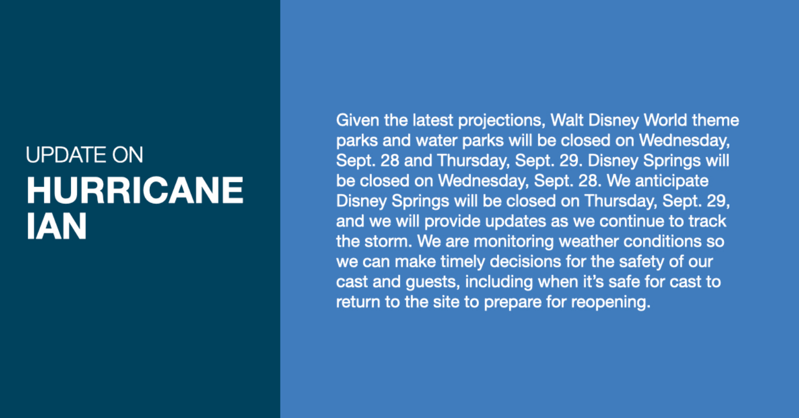 Wegen Hurricane Ian bleiben sowohl Walt Disney World als auch Universal am Mittwoch und Donnerstag geschlossen.