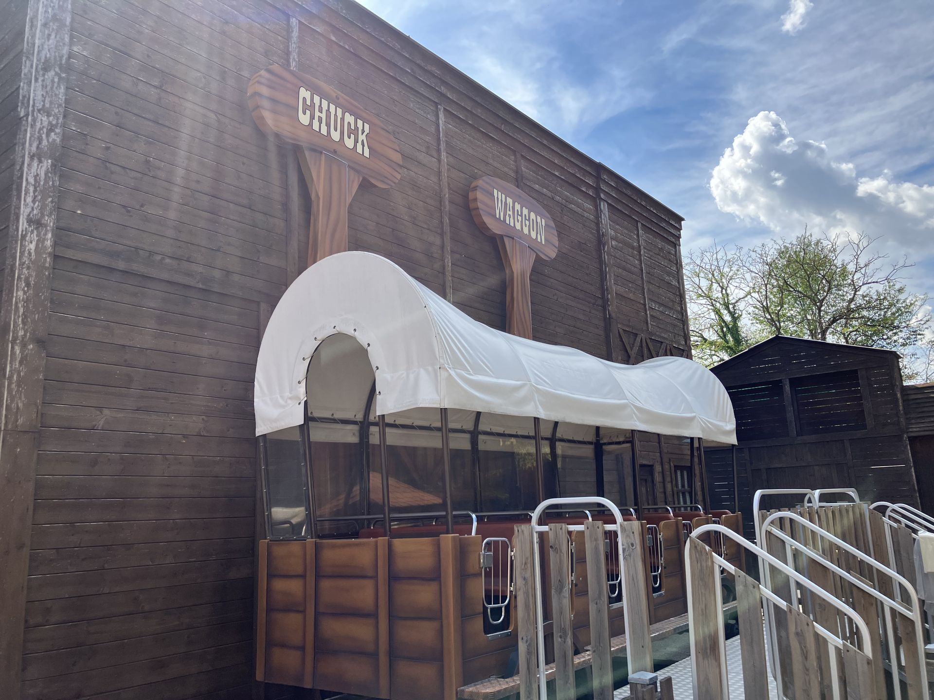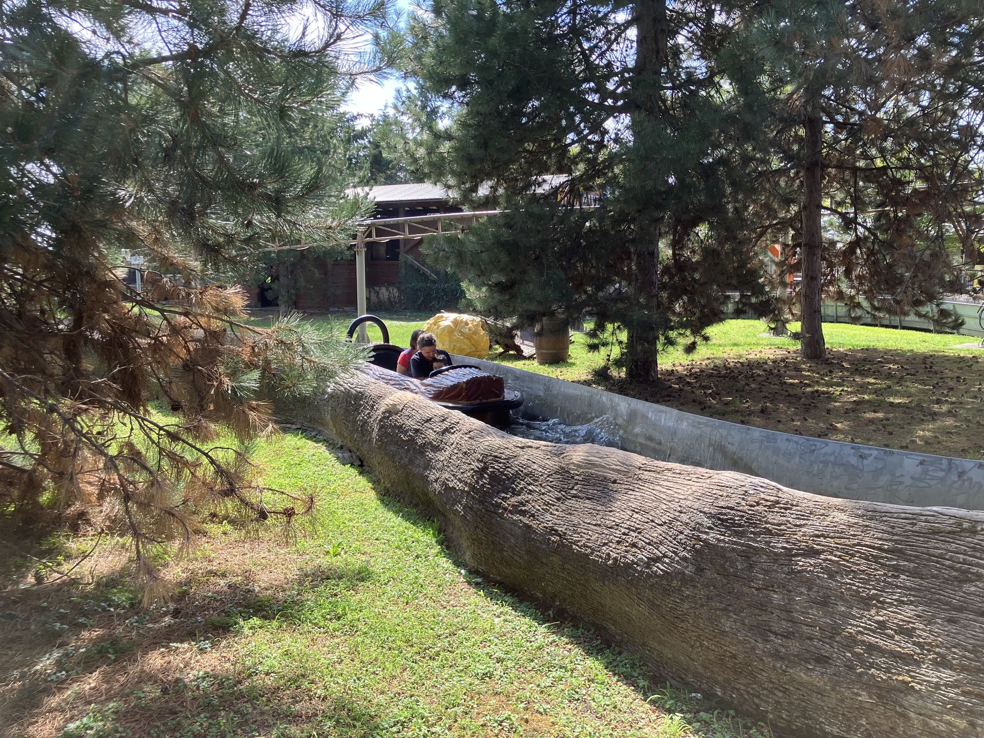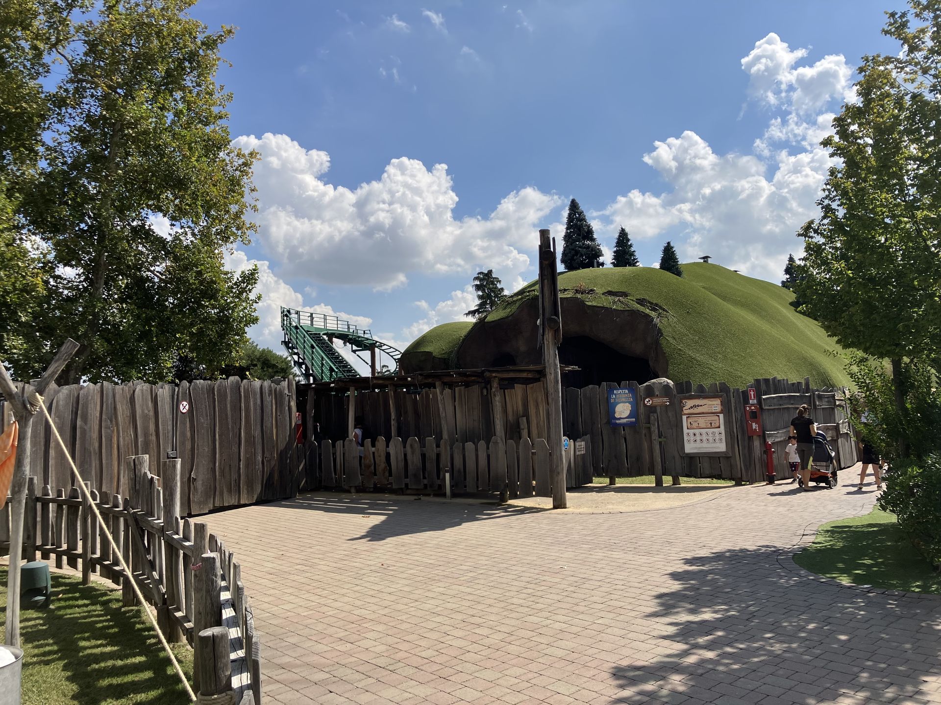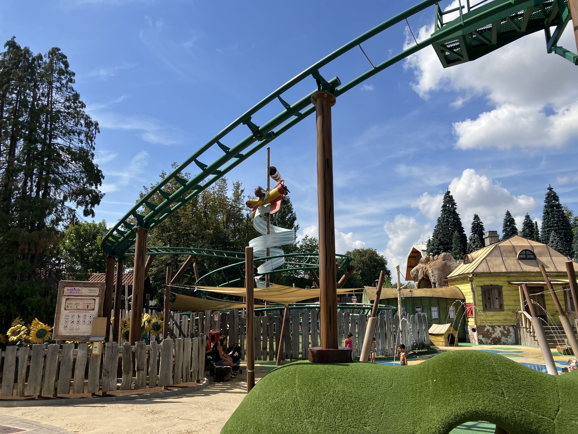Weiter ging dann der Weg in den Westernbereich, wo das Highlight, wieder eine Baumstammbahn mit gleich steilem Anstieg, als auch Abfahrt, wobei die Anlage, gleich wie die Achterbahn auch von Zamperla, wohl schon sehr lange im Park stehen und zur Zeit gefertigt wurden, wo Toleranzen wirklich noch sehr Tolerierbar waren und jeder Aufwand auch nur ein halbwegs sanftest fahren zu ermöglichen sofort eingestellt wurde. Wer ansonsten kommt auf die Idee, einen Powered Coaster, so zu konstruieren, das der Motor nur beschleunigen kann und Reibbremsen den Zug dann aufhalten müssen, von sanften Bremsen keine Spur!