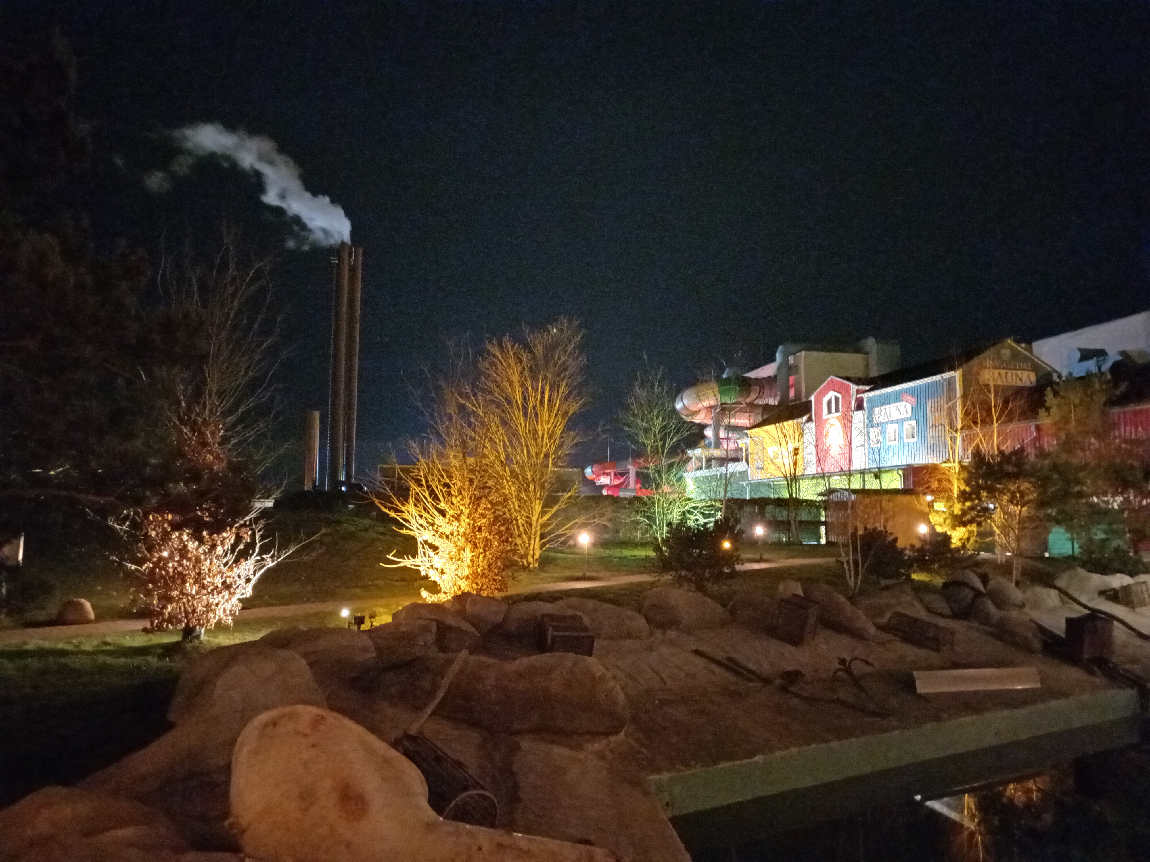 Helix relativ eng ist und man dadurch ansehnlich druckreich in die Bötchen gepresst wird, rutscht sich die zweite im offenen Hallenteil dann überaus schaukelig, was doch einige Male stolze Wasserschwälle in die Boote und über die Rutscher ergiessen lässt. Gerade die Schussfahrt vor dem offenen Part in der Halle liefert ein leidlich stolzes Tempo für den weiteren kurvigen Verlauf, der nun wieder eingetunnelt ins Freie führt. Erst mit der letzten Kehre durchbricht man wiederum die Hallenwand und schlittert elegant ins Auslaufbecken, wo wir bei all unseren Fahrten bis ganz nach vorne zu den Ausstiegsstufen geschwemmt wurden. Macht auf jeden Fall Laune, das Ding, und ist gerade durch die 270°-Kurven und den offenen Abschnitt in der Halle durchaus mit einem gewissen Einzigartigkeits-Bonus versehen. Dennoch bleibt die Fahrt naturgemäss eher familienfreundlich, aber so soll es ja auch sein. Durch die relativ engen Röhrenabschnitte dreht man sich auch nicht so rassig wie bei anderen Anlagen dieser Art - wer am Start rückwärts sitzend losgeschoben wird verweilt in der Regel auch bis ganz nach unten in dieser Position, auch auf dem gefühlt etwas breiteren offenen Hallenteil kam nur ganz begrenztes Spinning auf. Kann natürlich auch daran liegen, dass mein Begleiter und ich immer nur zu zweit und vis-à-vis gerutscht sind - bei anderer Beladeweise und Gewichtsverteilung könnte es vermutlich schon anders aussehen. Bei den Fahrten nach Einbruch der Dunkelheit waren die Aussenstrecken zwar etwas weniger deutlich, aber immer noch erkennbar auszumachen, da die transluzenten mehrfahrbigen Röhrenabschnitte dann mit Scheinwerfern beleuchtet werden.