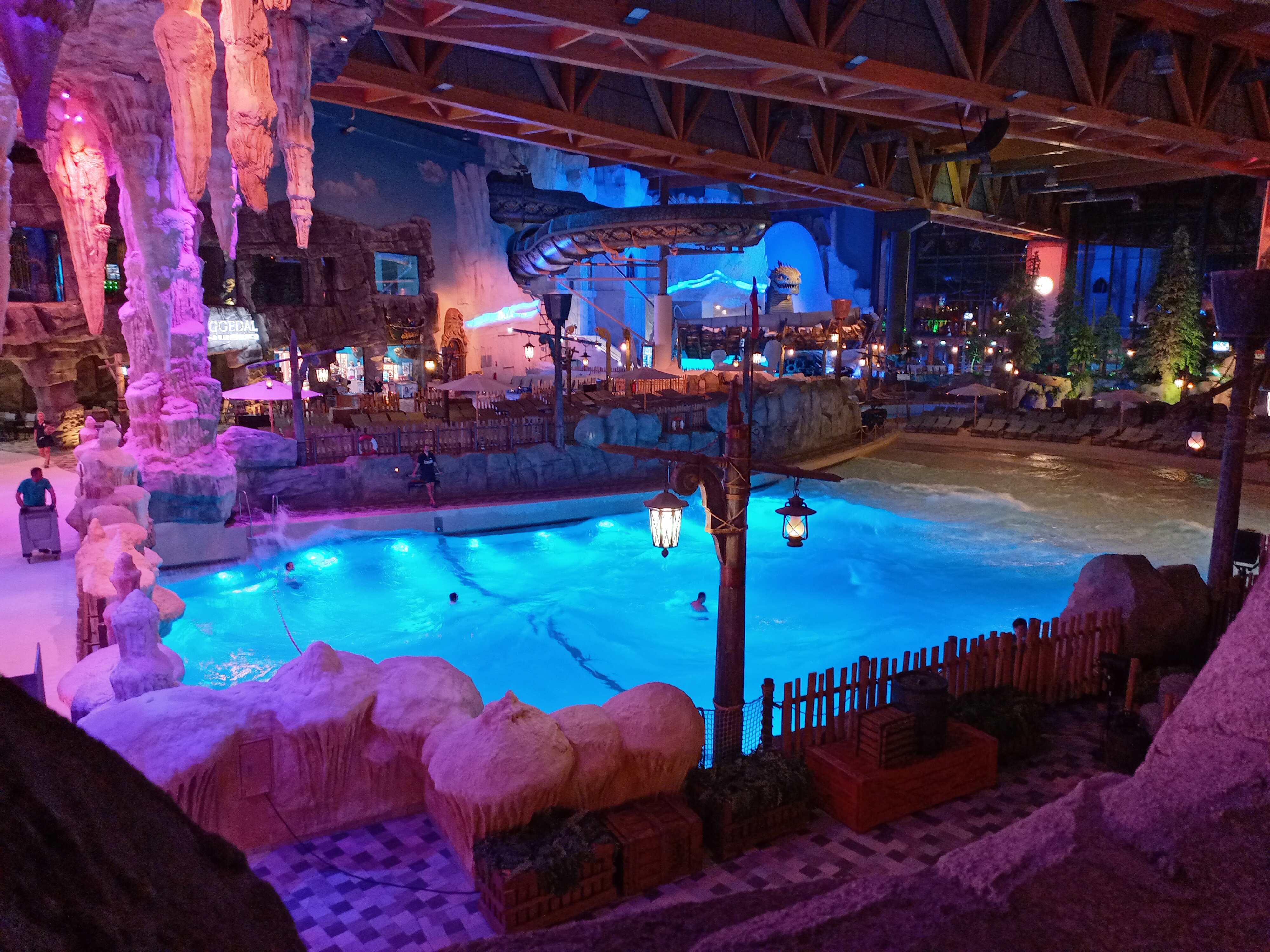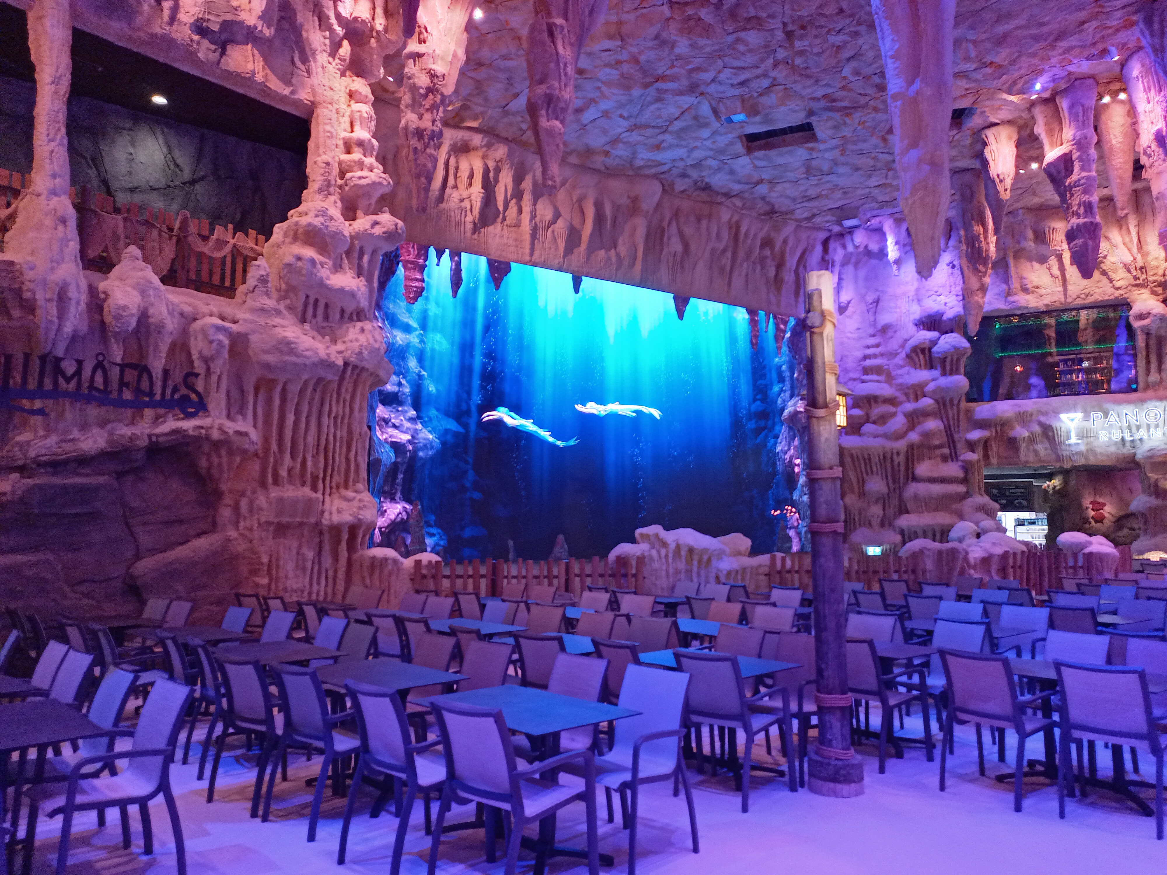 Es hat sich jedenfalls als goldrichtig erwiesen, unser Wasserpark-Abenteuer hiermit zu beginnen. Die gut 250 Meter lange und etwa zehnminütige friedliche Treibfahrt gewährt einen wunderbaren ersten Blick auf das Bad, sein Layout und alle Attraktionen, ausserdem lässt sich natürlich gerade hier in den mehreren Höhlen, Terrassen- und Brückenunterfahrten das sich eigentlich durch den ganzen Park ziehende Top-Level an nordischer Thematisierung erstmals so richtig bestaunen und geniessen. Verschiedenfarbige Lichtinstallationen lassen das Wasser und die detailreich ausgearbeiteten Felsverkleidungen der Höhlen erleuchten, epische Fantasymusik erklingt, stellenweise kribbeln Blubberdüsen am Bassingrund den Podex und Beamerprojektionen an den detailreich geformten Felswänden geben den Anschein, dass die Bläschen in der Grotte dann noch weiter aufsteigen... Und überall huschen Snorri und diverse andere Meeresbewohner auf verschiedenen Screens durch. Auf dem Video noch nicht zu sehen (weil glaube ich an einem Preview-Event aufgenommen) sind zwei zwischenzeitlich wohl ergänzte Stellen, an denen es ähnlich wie im Cross Country Creek in Blizzard Beach aus Kippkübeln auf die Besucher runterregnet, das zweite Mal von einem Snorri-Animatronic als eine Art Trommelspiel dargestellt.