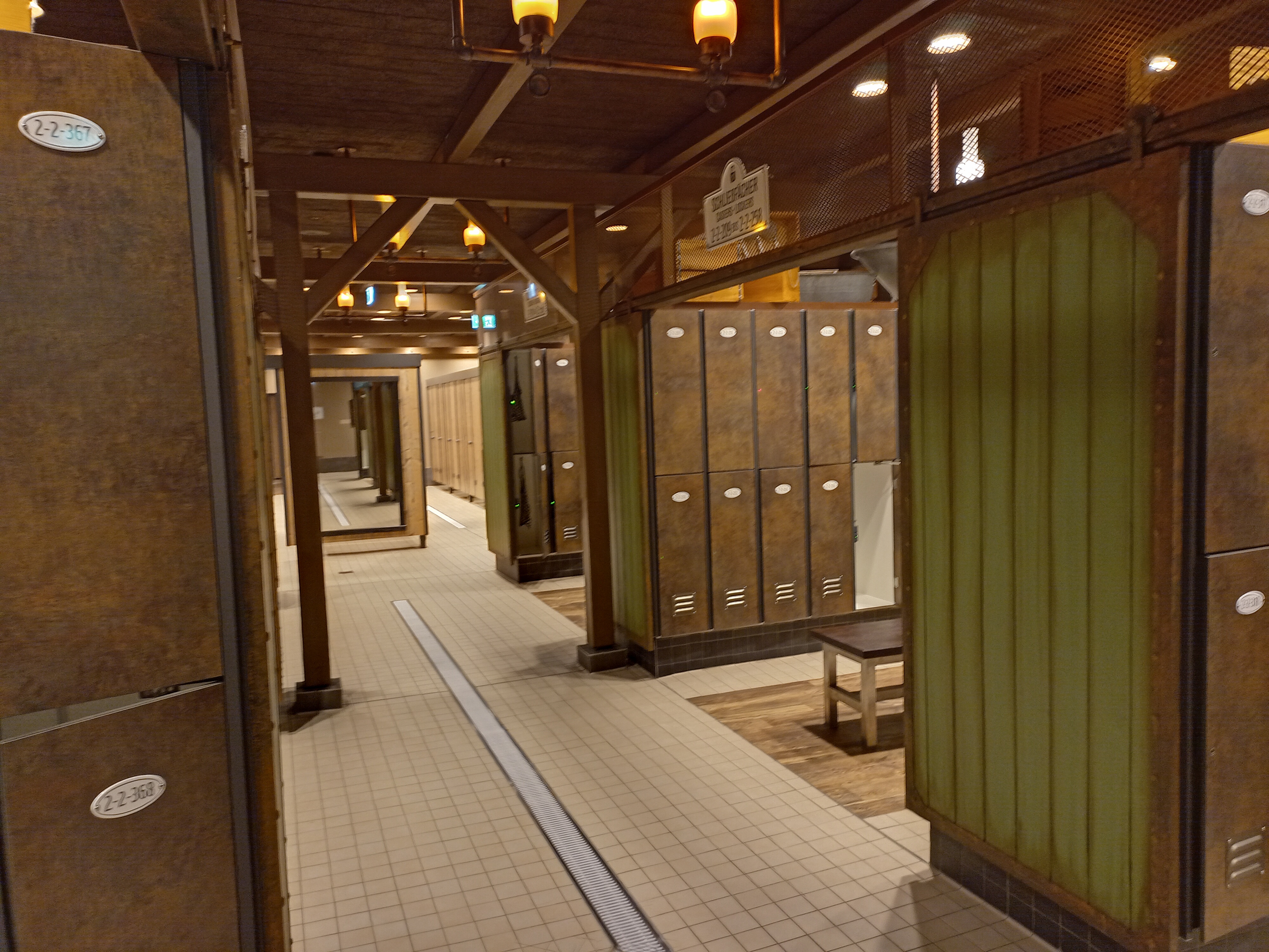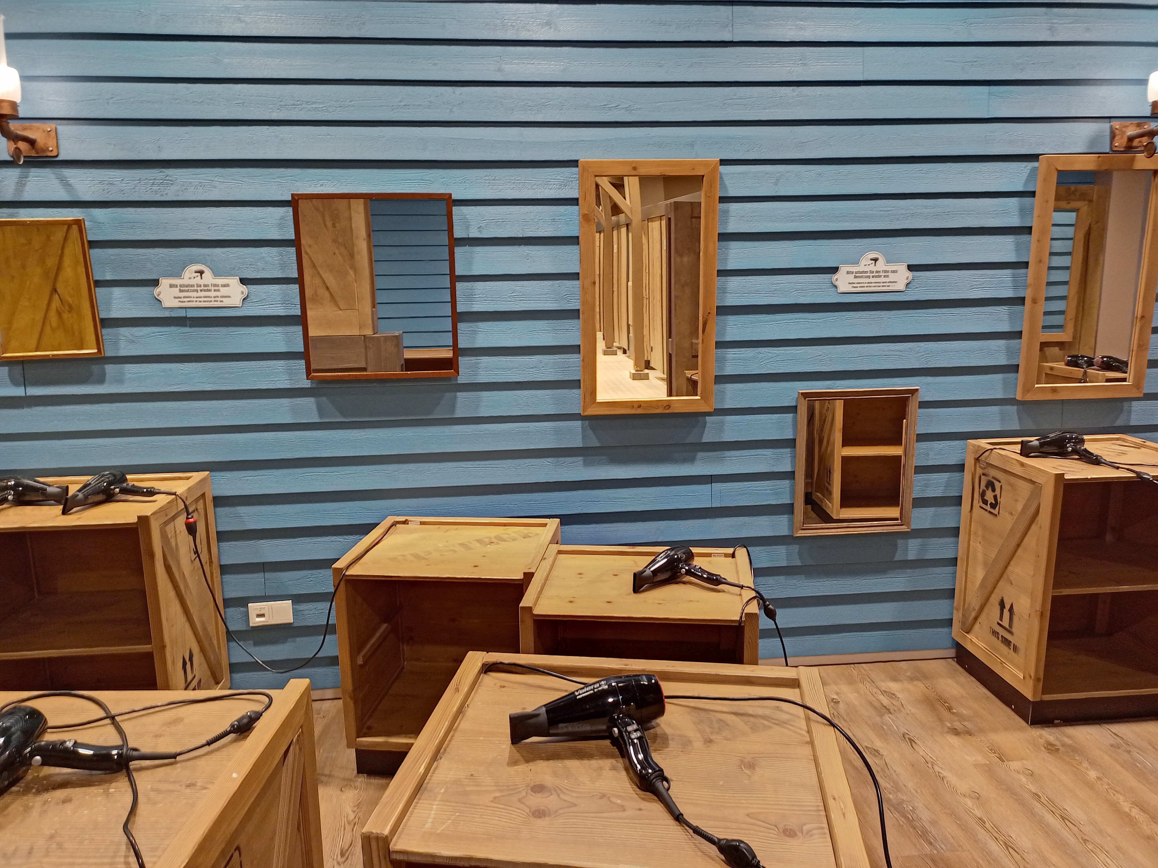Eigentlich mag ich Bäder nicht besonders, wo die Fönzone nicht zwischen Duschen und Spinden, sondern erst nach den Umziehkubikeln liegt, so dass man sich mit noch feuchten Haaren ankleiden muss. Aber auch hierzulande ist das bei Plauschbädern eben eher andersrum angeordnet als in einem typischen Hallenbad. Und wenn sie dann erst noch so durchthematisiert ist wie der ganze Rest des Bades, ist das dann doch verschmerzbar.