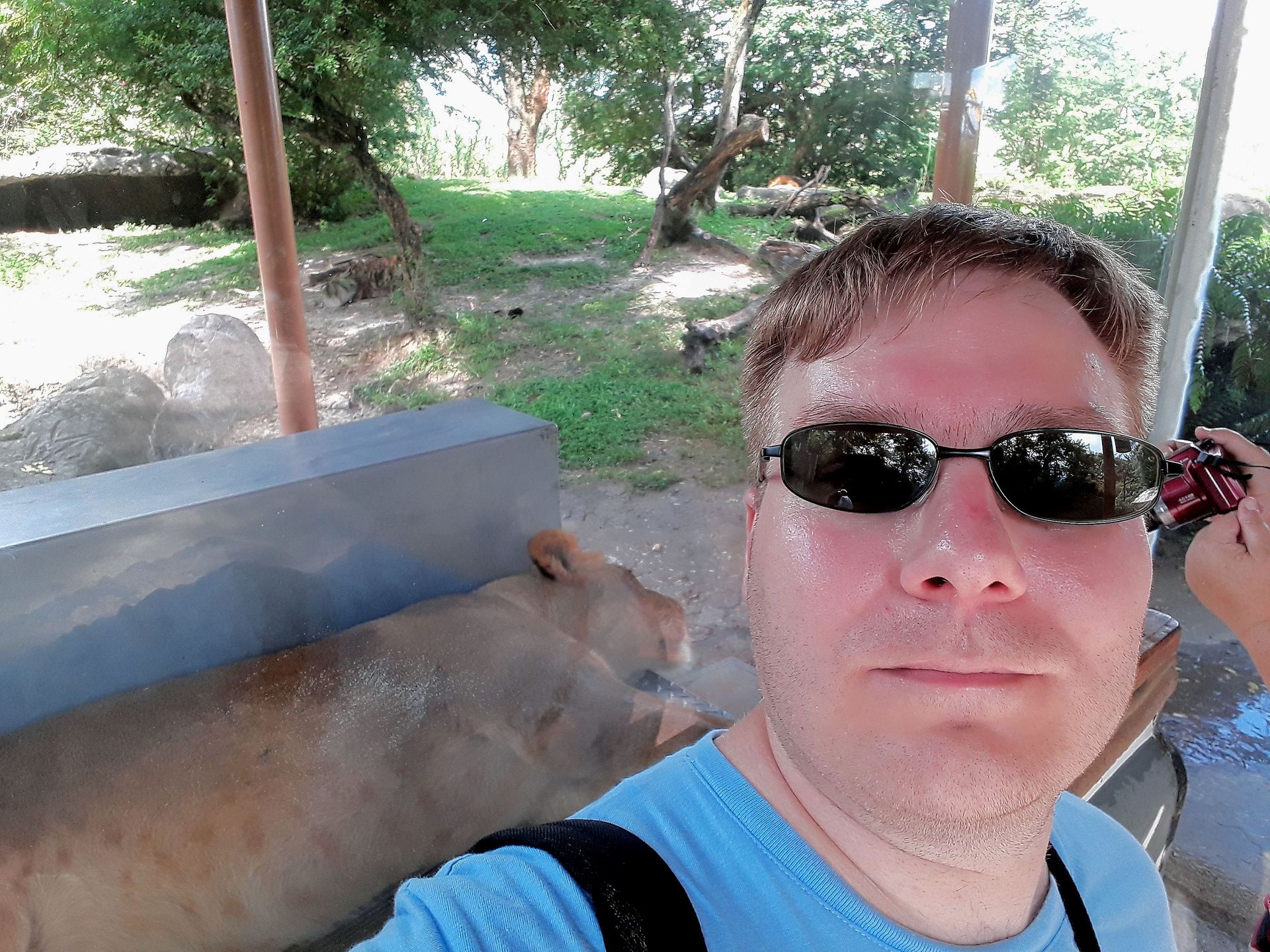 Einer sogar direkt an der Scheibe auf der ins Gehege ragenden Ladefläche eines Pick-Ups.