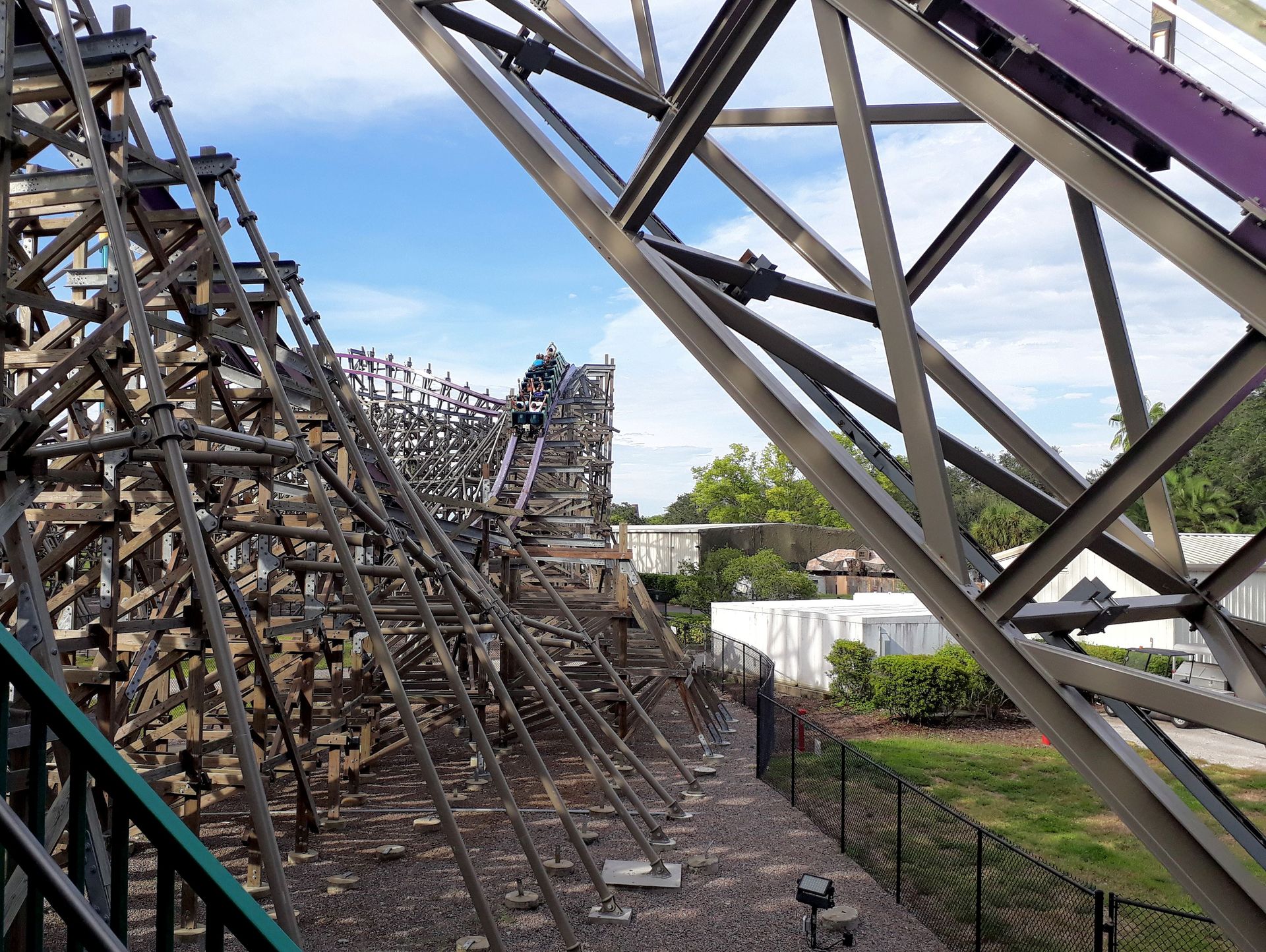 Great Coasters International, die 1999 eröffnet wurde. Die duellierenden Spuren hießen Lion und Tiger, bezugnehmend auf das afrikanische Fabelwesen Gwazi mit dem Kopf eines Tigers und dem Körper eines Löwen. Da man von dieser Legende eigentlich nur im Zusammenhang mit der Achterbahn liest, scheint es nicht ganz unwahrscheinlich, dass es sich um eine von Busch Gardens erfundene Geschichte handelt. Aber ich lasse mich gerne eines Besseren belehren, wenn jemand den tatsächlichen Ursprung kennt. Mit 32 Metern Höhe und einer Fahrstrecke von jeweils 1.069 Metern war der Dueling Woodie eine beeindruckende Erscheinung, was jedoch nicht über die zusehends schlechter werdenden Fahreigenschaften hinwegtäuschen konnte. Auch ein Retracking und der Einsatz von Millennium-Flyer-Zügen anstelle der PTC-Züge brachte keinen Erfolg, die Fahrt galt weiterhin als äußerst ruppig und die Besucherzahlen nahmen immer weiter ab. So wurde nach der Saison 2012 die Tiger-Spur geschlossen, um Wartungskosten einzusparen. Anfang 2015 setzte sich auch der Löwe zur Ruhe und Gwazi rottete fortan vor sich hin. Drei Jahre später deutete schließlich alles auf einen Umbau zum Hybrid Coaster durch