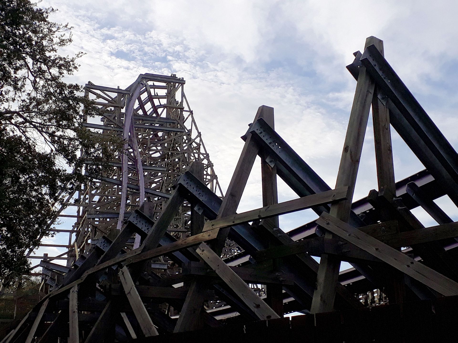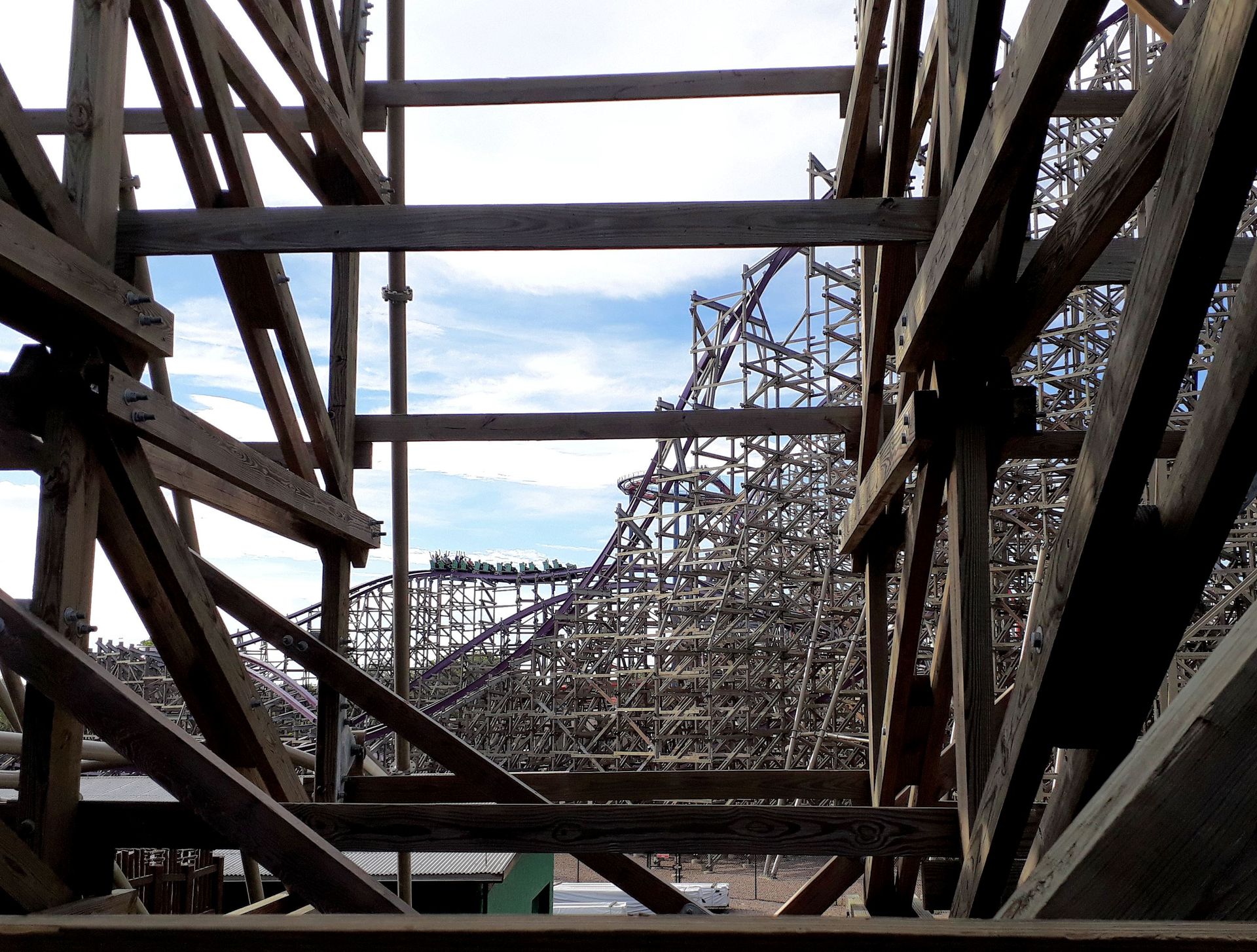Moment, hatte ich nicht eben geschrieben, dass der Park erst um 10 öffnen sollte? Ja, das habe ich und das stimmte auch. Aber der Sonntag war nicht umsonst unser T-Shirt-Day. Denn auch wenn es von Seiten des Parks zunächst nur eine Absage und dann eher unverschämte Angebote gab, konnte Dirk für uns am Ende dann doch ein ordentliches Sonderprogramm aushandeln. Gleich zu Beginn ging es zum ehemaligen Standort der Brauerei. Denn nach deren Abriss musste eine große Fläche mitten im Park gefüllt werden. Hierzu entschied man sich für eine doppelte Holzachterbahn des noch recht jungen Herstellers
