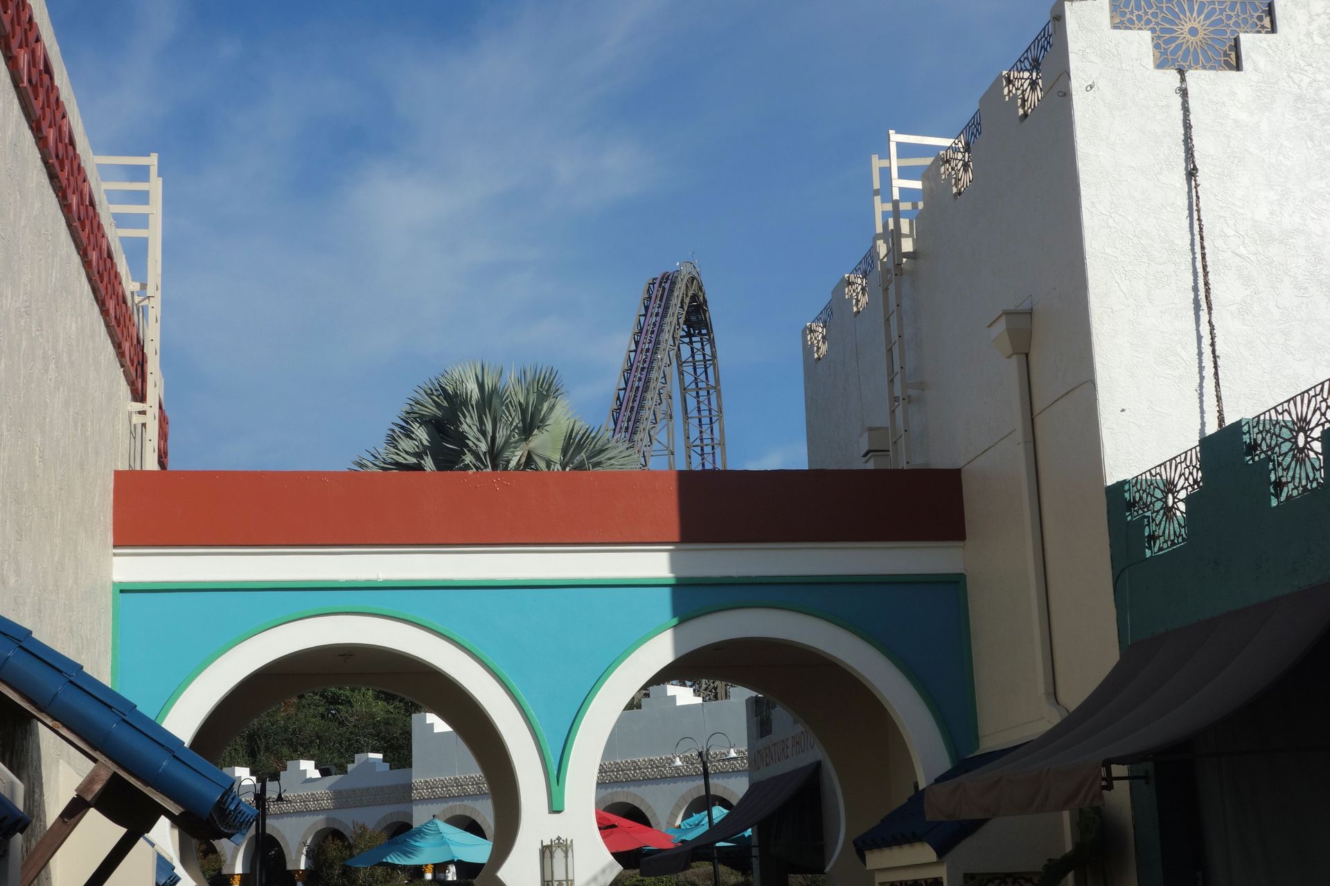 Bereits kurz vor 10 Uhr tauchten dann leider auch schon die ersten normalen Besucher auf und wir mussten uns erstmal wieder vom neuen Highlight des Parks verabschieden. Und weil das mein 797. Count war, hatte ich am Vorabend bereits den Parkplan studiert und eine Route ausgearbeitet, um möglichst ohne große Umwege die 800 auf der gewünschten Bahn feiern zu können. Nachdem ich den Rest der Gruppe von meinem Plan überzeugt hatte, ging es daher vom marokkanischen Eingangsbereich zur nächsten Achterbahn am Rande von Afrika.