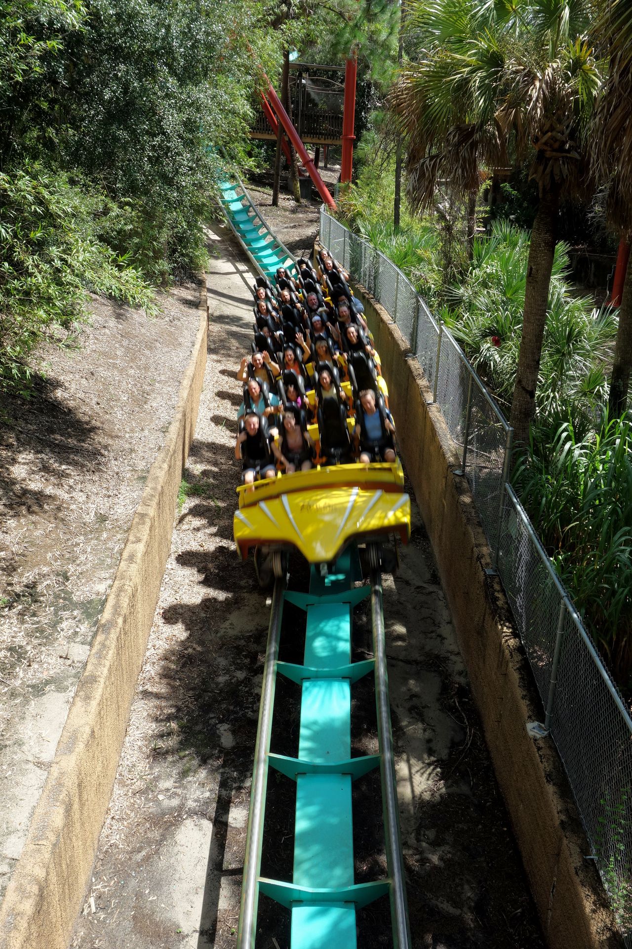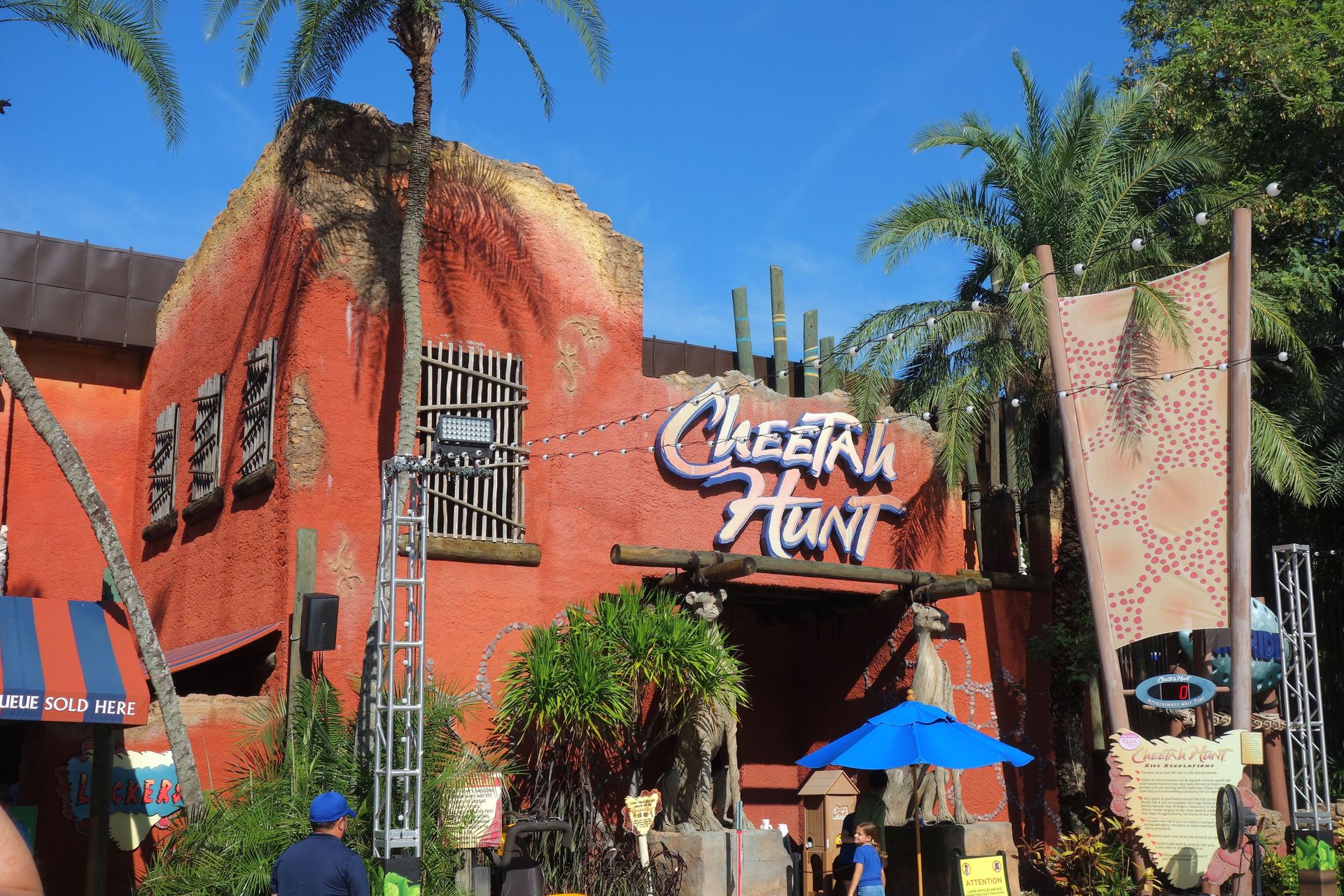 Vekoma ein besonderes Highlight verbauen. Gegen Ende der Fahrt blieb der Truck auf einer Ponton-Brücke stehen, die sich dann scheinbar von der Kraft des direkt daneben herabprasselnden Wasserfalls löste und führerlos der Strömung durch eben jenen Canyon folgte. Selbstverständlich war der davonschwimmende Ponton schienengeführt. Über eine dritte Schiene mit zugehöriger Hebelmechanik - ähnlich wie bei den ursprünglichen 4D-Coastern - wurde die Plattform noch passend zur Strömung hin und her gedreht. Schließlich blieb der Ponton dann quer zur Flussrichtung hängen, zufälligerweise mit einer weiterführenden Straße direkt voraus. Leider erwies sich die größtenteils unter Wasser befindliche Technik als sehr störanfällig und wartungsintensiv, sodass der Wasserpart häufig mit einer Abkürzung ausgelassen werden musste. Daher entschied man sich 2010 dazu, diesen Teil der Fahrt endgültig stillzulegen und den Canyon für Cheetah Hunt wiederzuverwenden. Der Landteil der Rhino Rally war noch bis Ende 2014 in Betrieb, wurde dann aber ebenfalls geschlossen. Während die alten Schienen den neuen für Cheetah Hunt weichen mussten, blieb das Wasser zunächst erhalten. Aber auch da fuhr man immer öfter auf Sparflamme und ließ die Pumpen aus, die letzten Jahre blieb der Canyon staubtrocken, so auch bei unserem Besuch. Im Dezember muss dann tatsächlich nochmal Wasser da gewesen sein, aber wohl nur für ein paar Tage. Hoffentlich wird das wieder der Normalzustand, nachdem man neuerdings auch zu Fuß in die Nähe des Canyons gelangt. Dort wurde nämlich für 2023 mit dem Serengeti Flyer die bisher größte Auslieferung einer Screaming Swing von