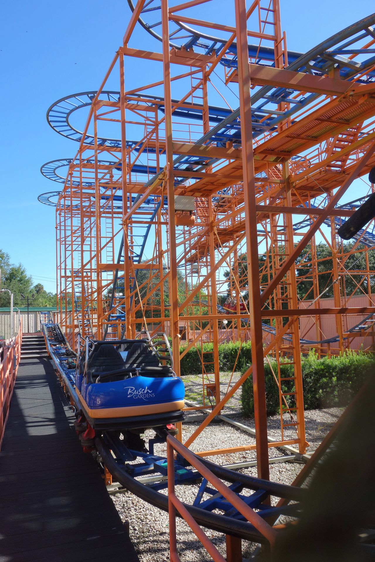 Damit fehlt halt die beste Stelle einer Wilden Maus. Doch damit nicht genug. Die Mauskurven wurden zwar noch ungebremst durchfahren, aber nach der weiten Wende und der langen Geraden eine Etage tiefer packte die Bremse voll zu und brachte den Wagen beinahe zum Stillstand. Die weiteren Bremsen waren dann wieder offen, nur die letzte vor der kleinen Senke zur Schlussbremse stoppte den Zug nochmal komplett. Also kurzum: Mit Abstand die schlechteste Achterbahn in Busch Gardens Tampa. Kann gerne weg das Altmetall.