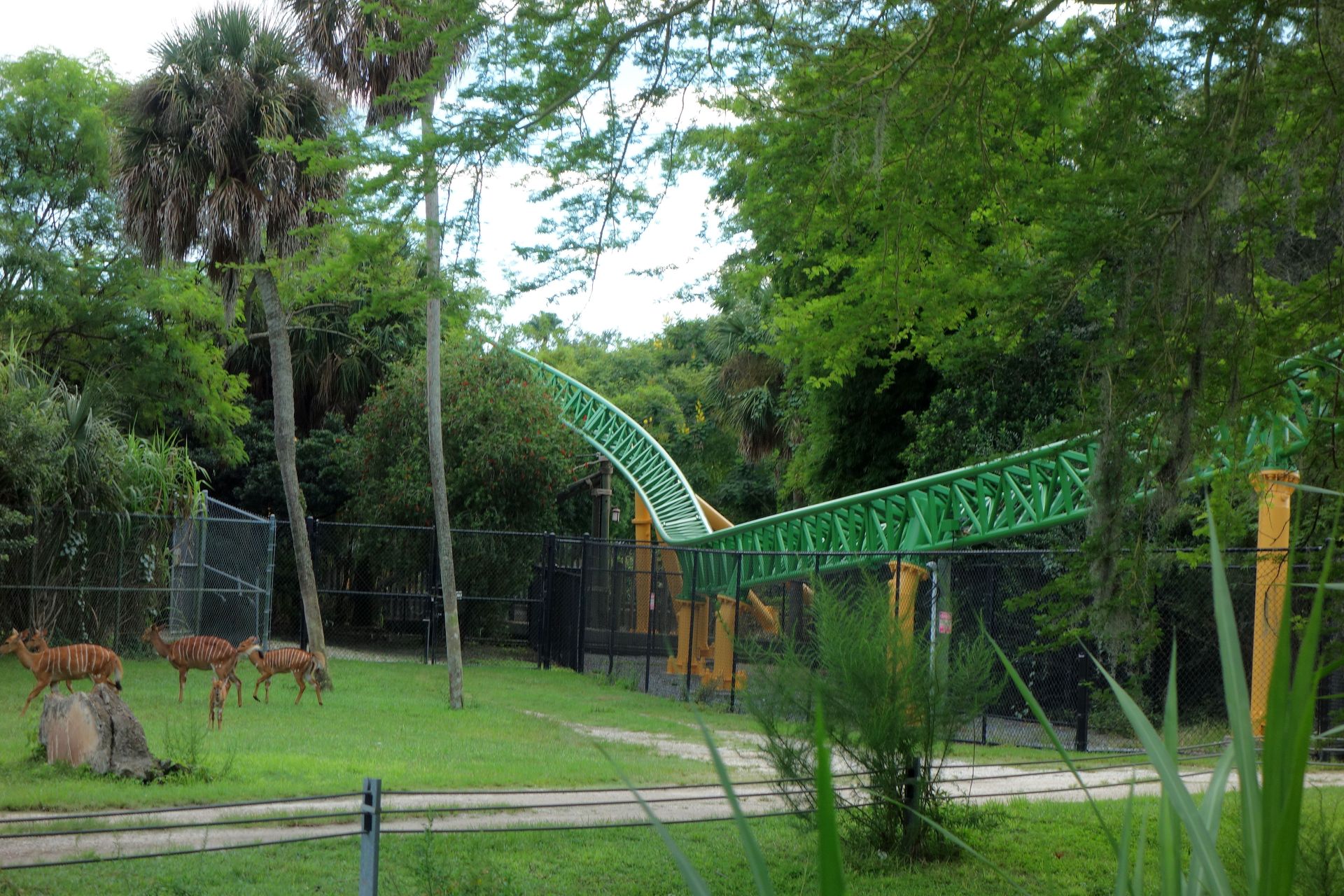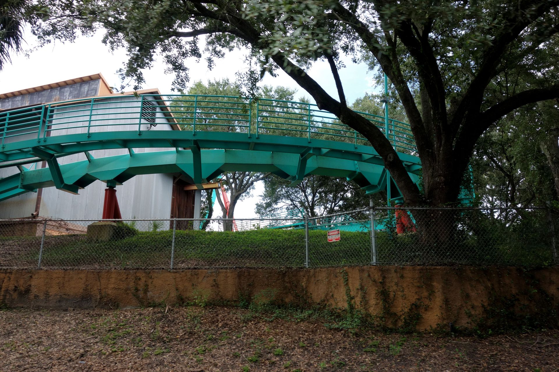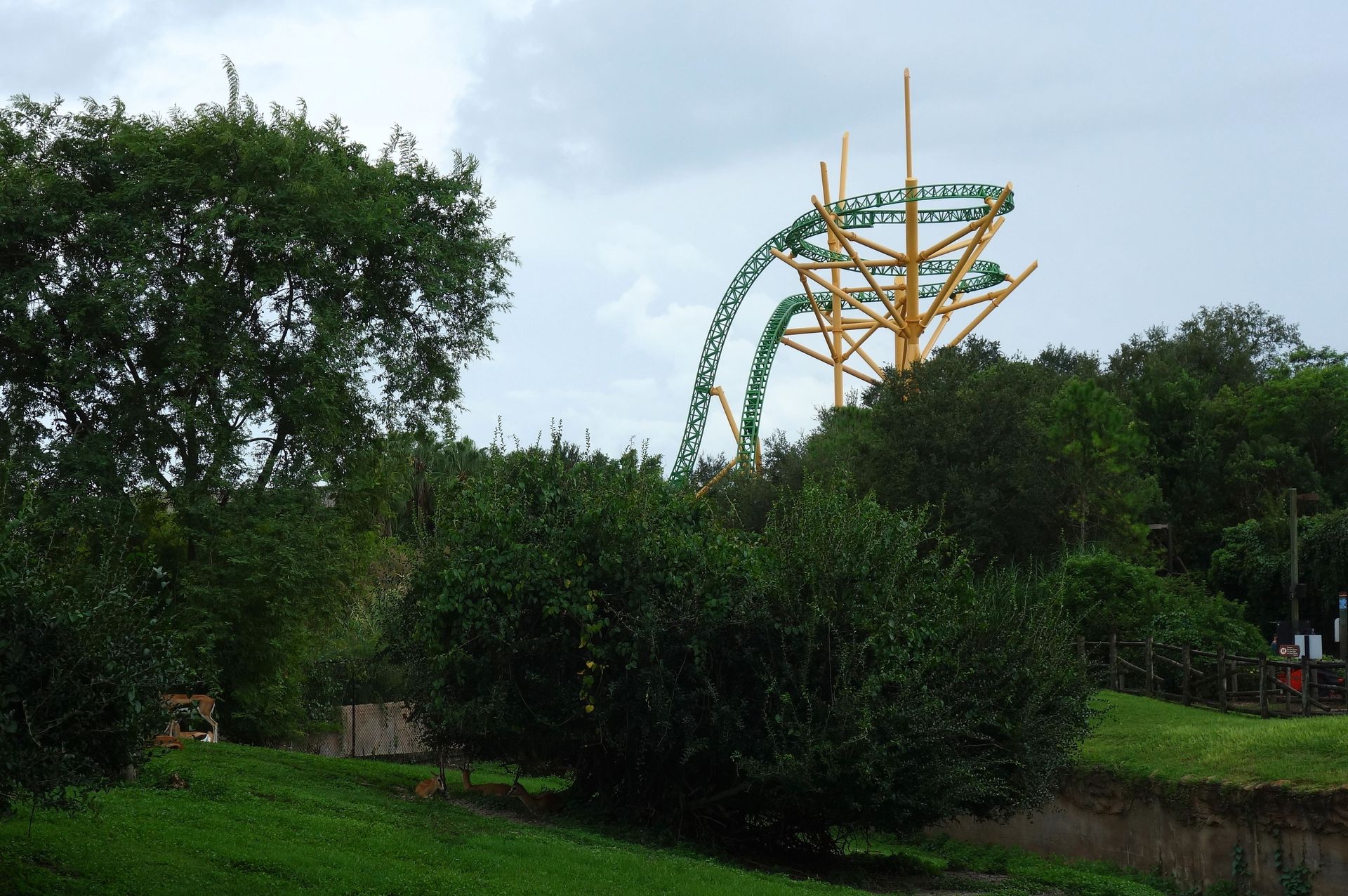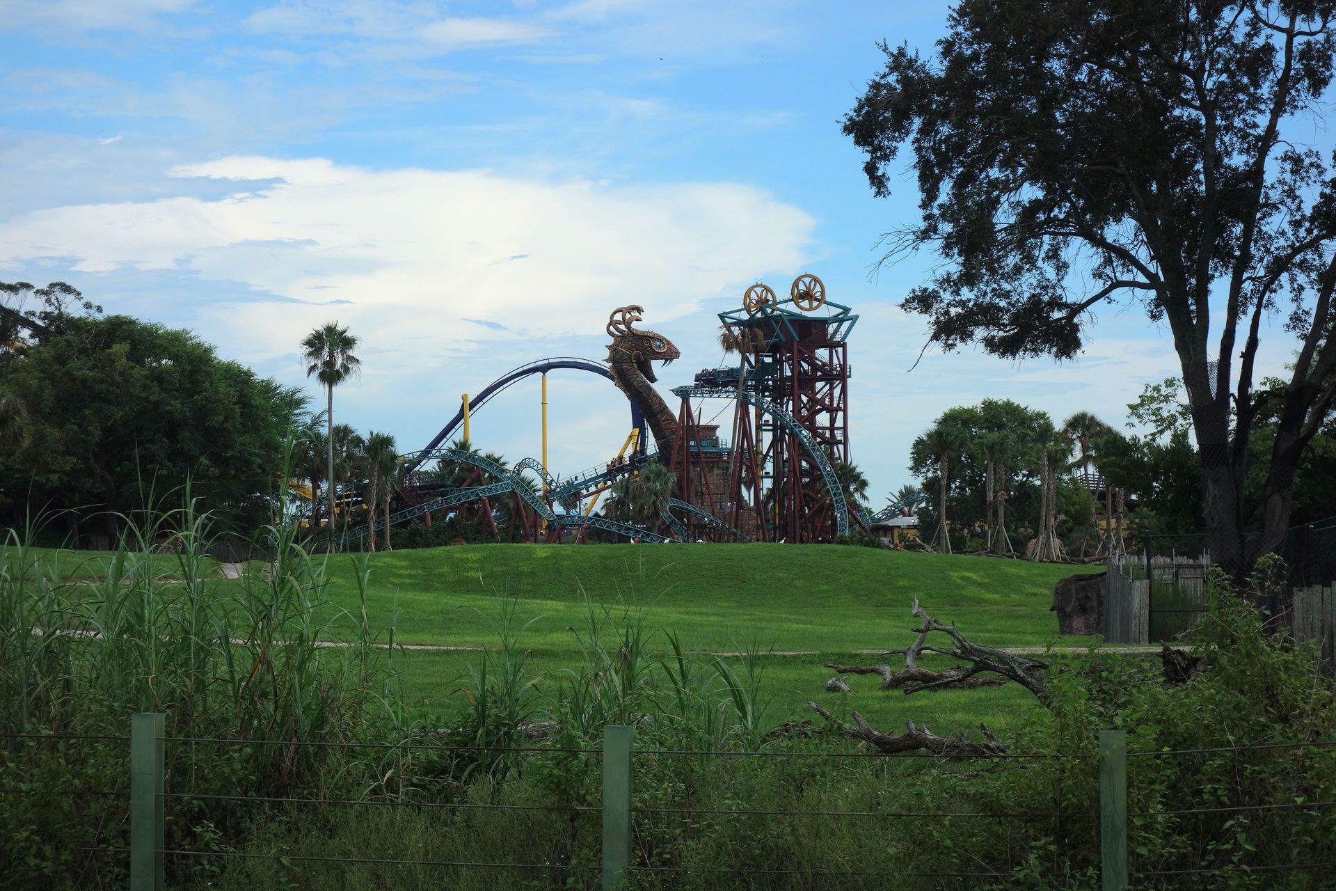 Zwischen dieser und dem am unteren Bildrand zu erkennenden Holzzaun - also quasi mitten im Freizeitpark - befinden sich die Backstage-Einrichtungen samt Mitarbeiter-Parkhaus. Vom Boden aus kann man davon glücklicherweise nicht viel sehen, die Brücke über die Zufahrtsstraße ist mit einem begrünten Tunnel abgeschirmt. Insbesondere von den direkt angrenzenden Achterbahnen SheiKra und Iron Gwazi ist die große graue Fläche mitten im Gelände aber leider kaum zu übersehen.