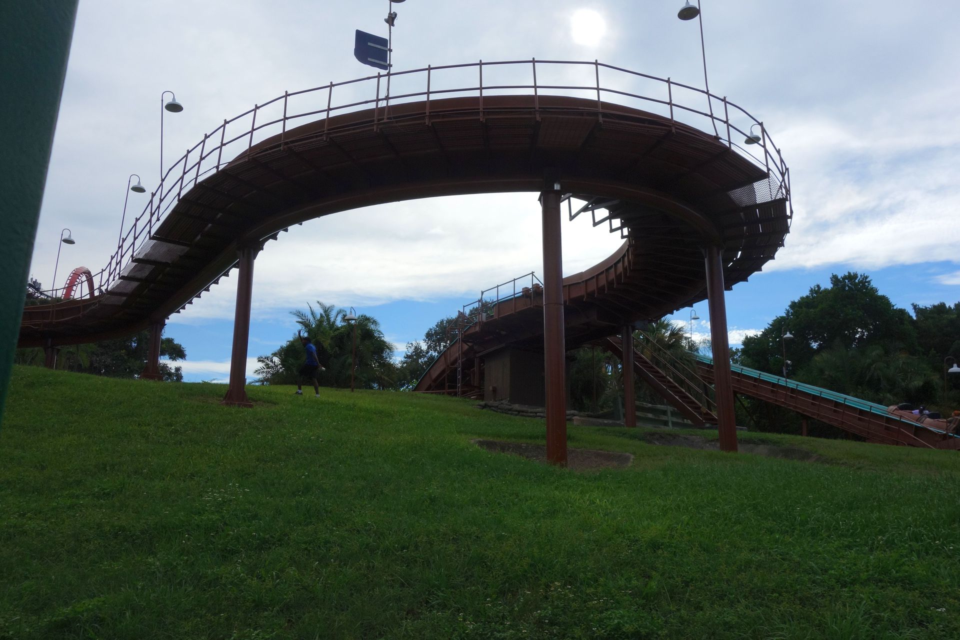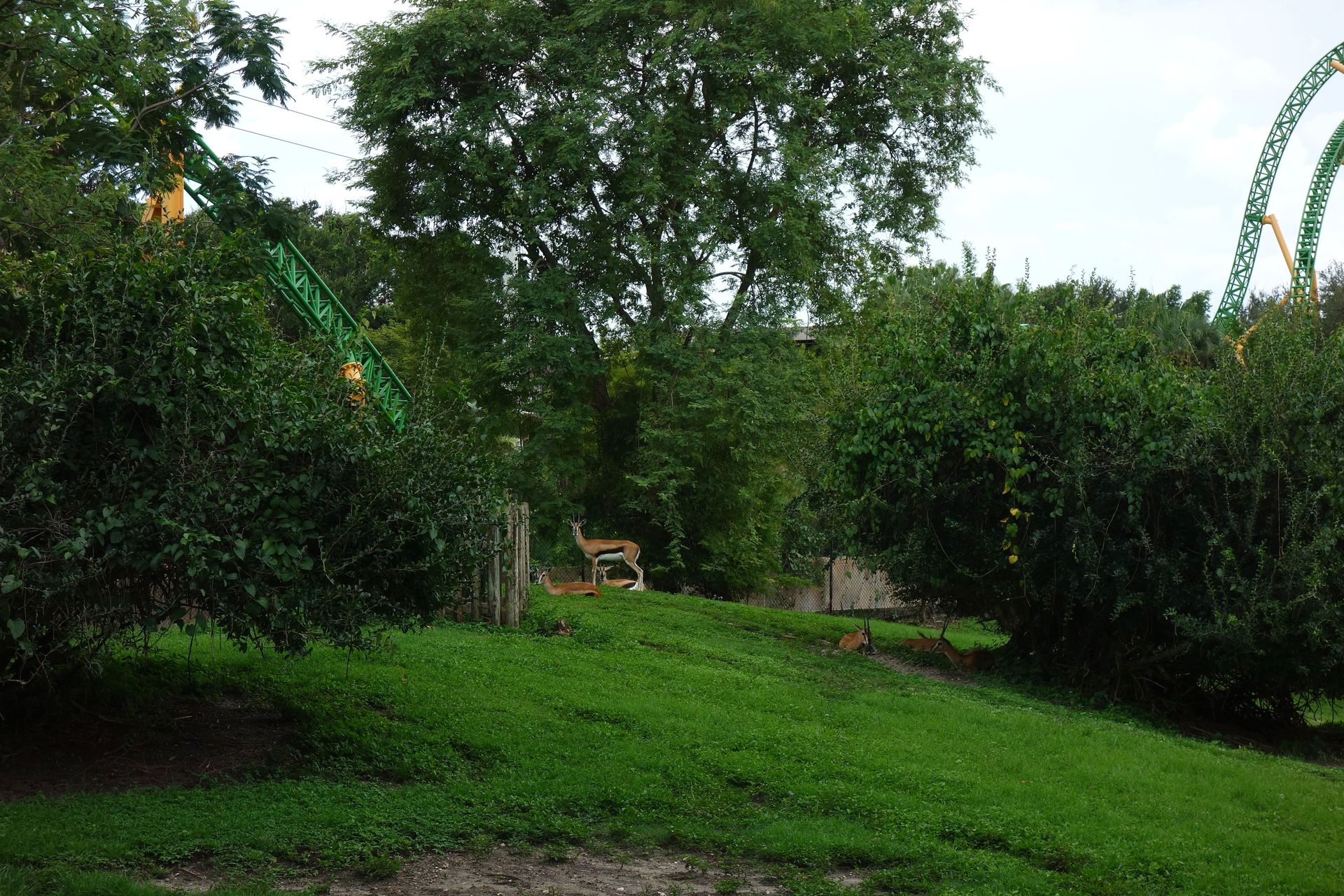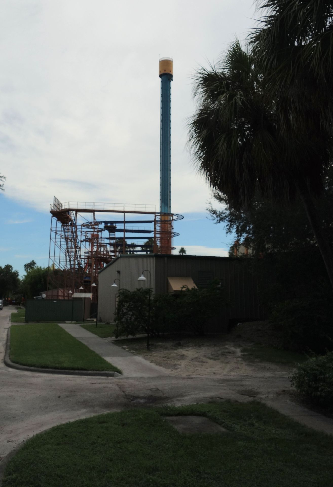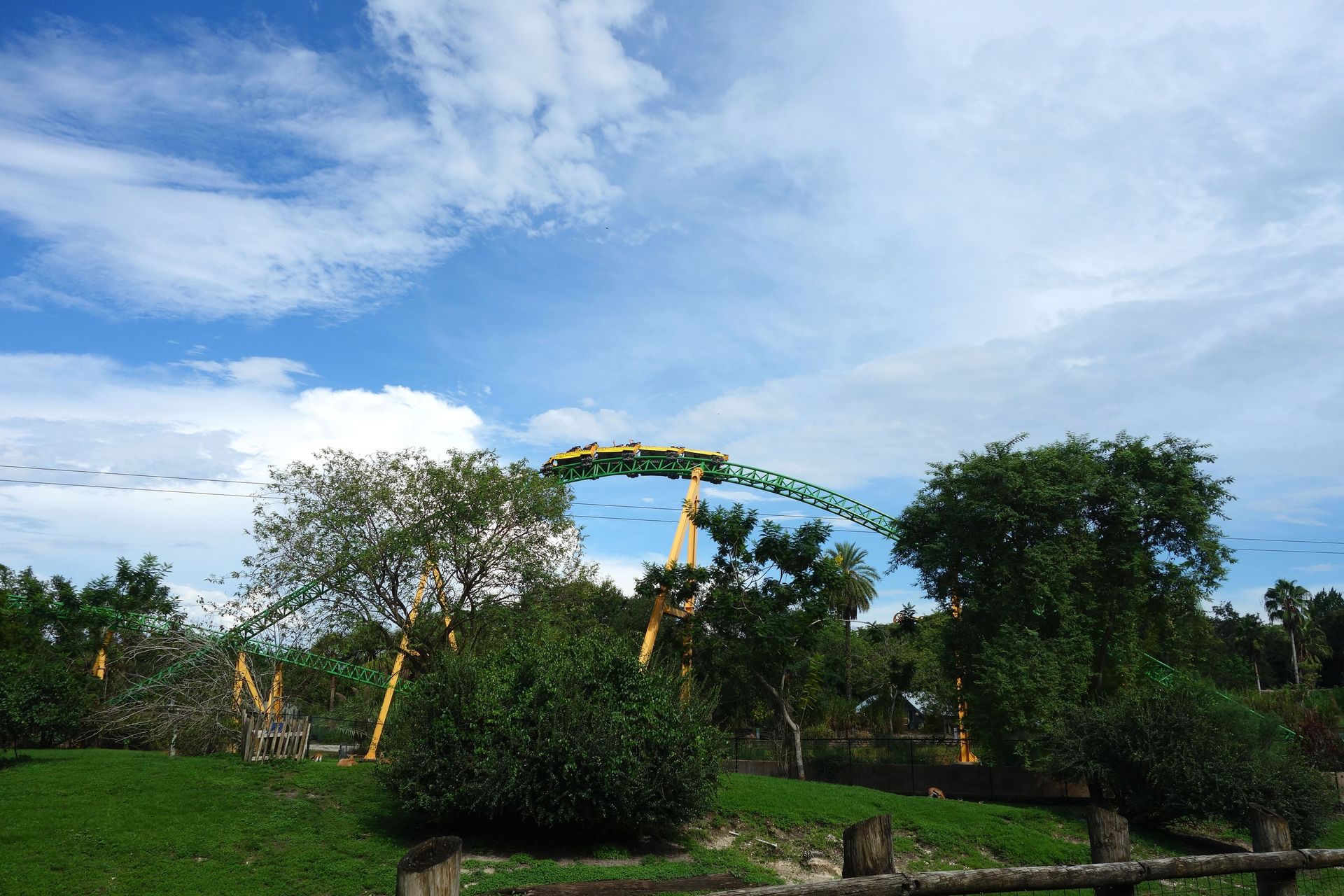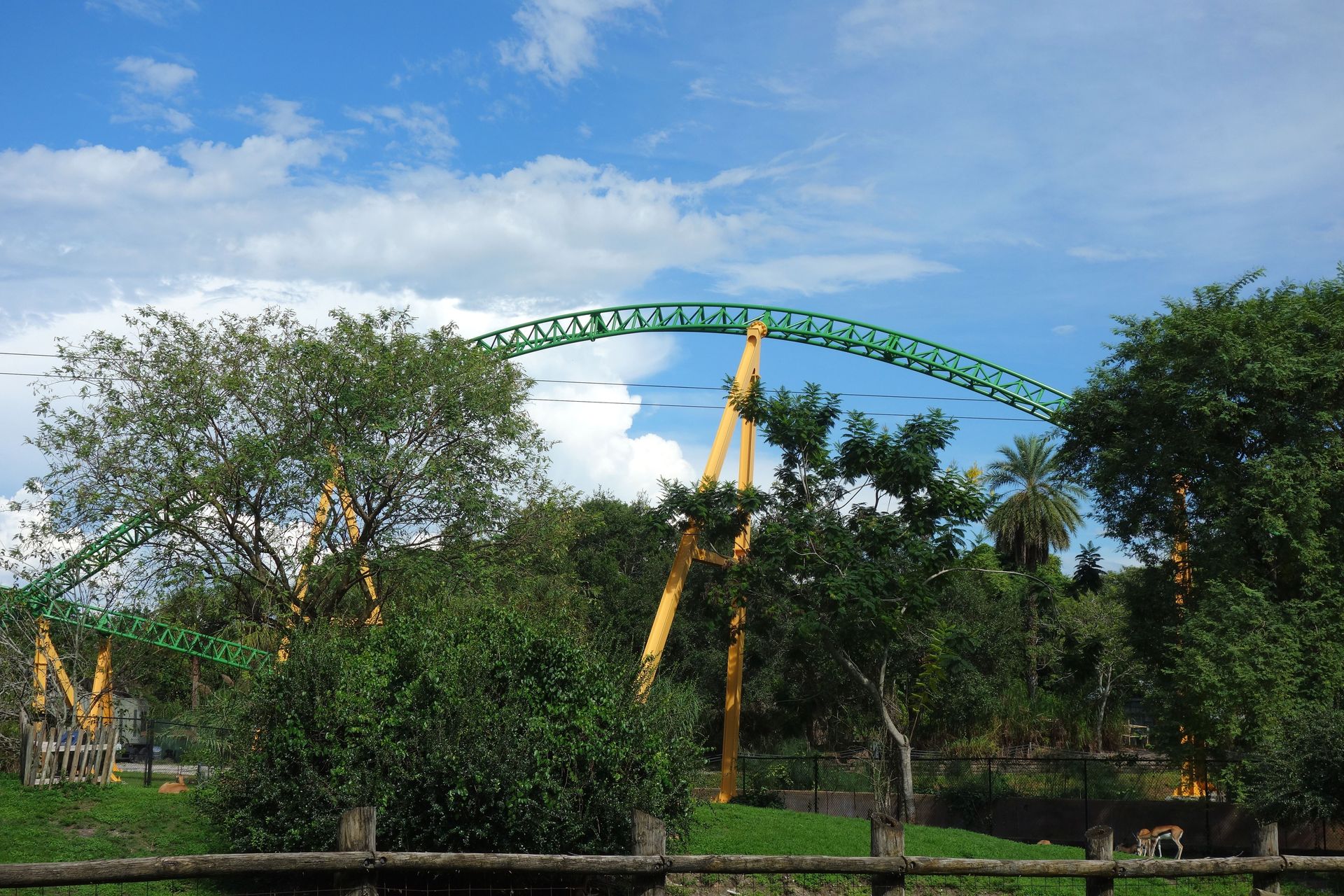 Zwischen dieser und dem am unteren Bildrand zu erkennenden Holzzaun - also quasi mitten im Freizeitpark - befinden sich die Backstage-Einrichtungen samt Mitarbeiter-Parkhaus. Vom Boden aus kann man davon glücklicherweise nicht viel sehen, die Brücke über die Zufahrtsstraße ist mit einem begrünten Tunnel abgeschirmt. Insbesondere von den direkt angrenzenden Achterbahnen SheiKra und Iron Gwazi ist die große graue Fläche mitten im Gelände aber leider kaum zu übersehen.