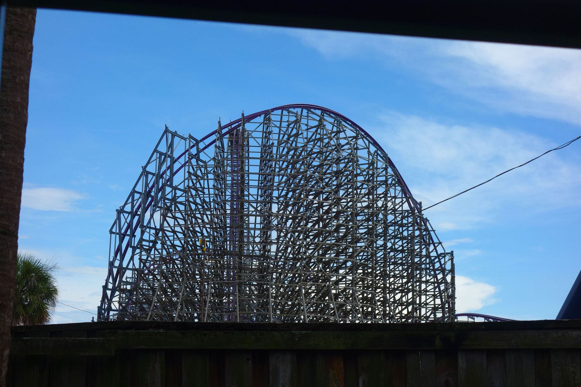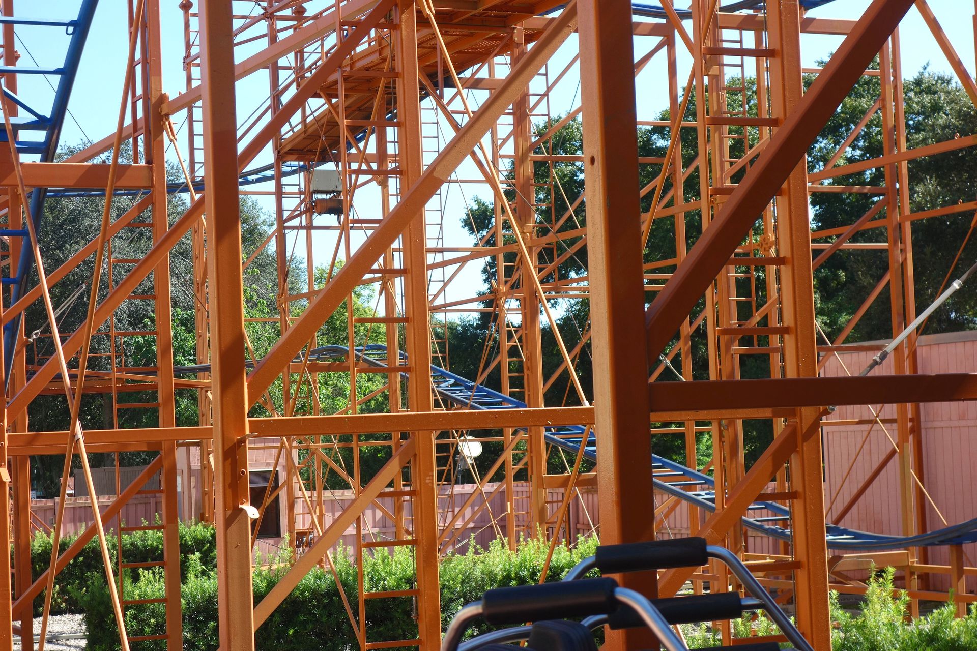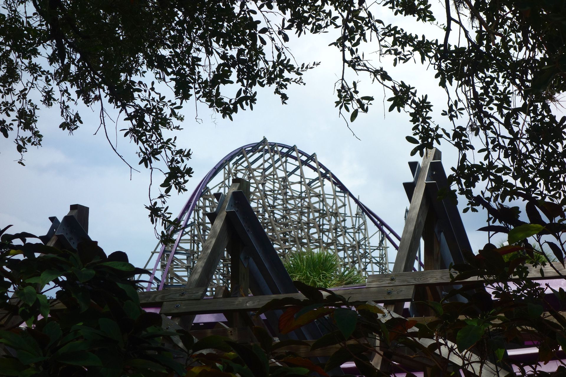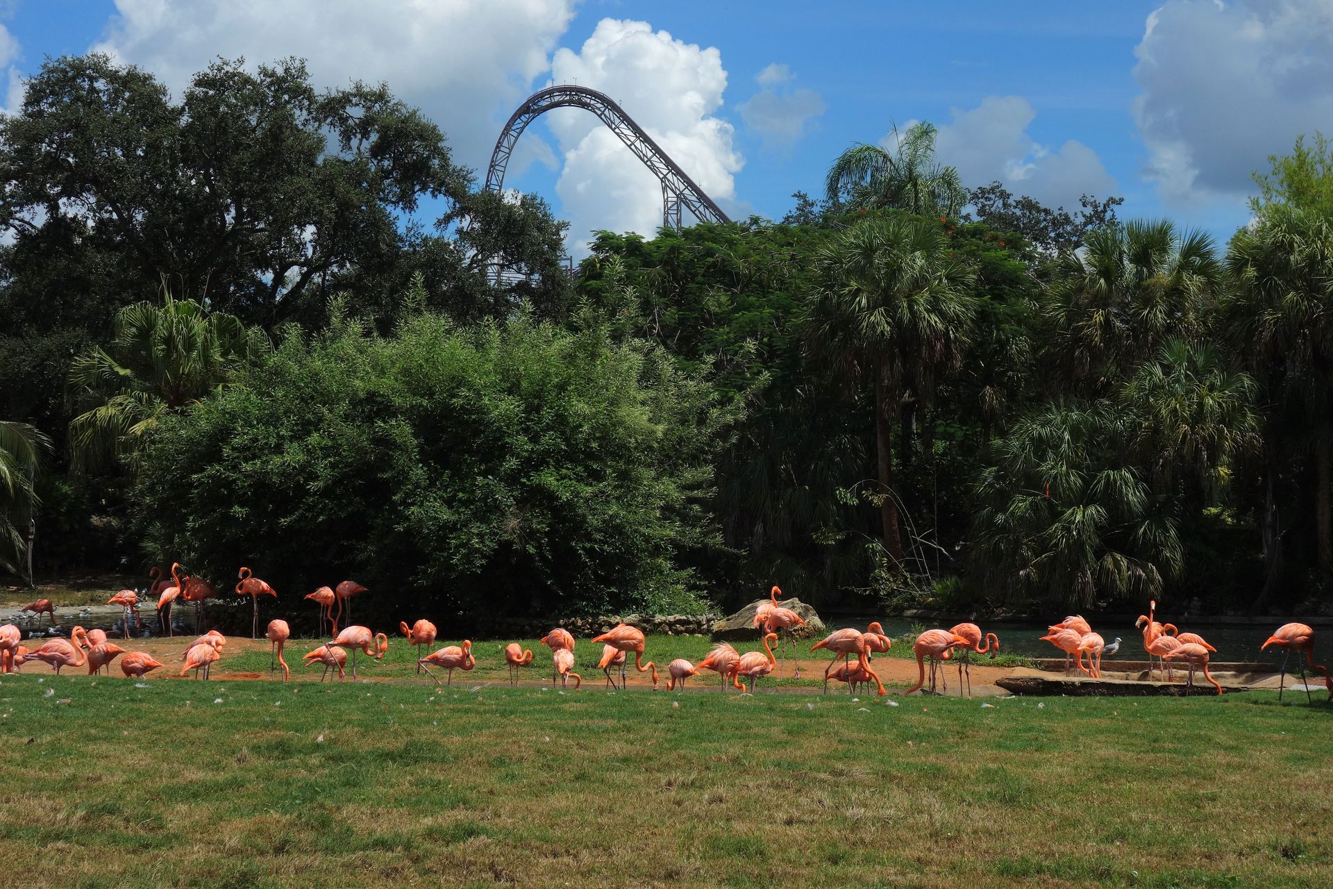Zwischen dieser und dem am unteren Bildrand zu erkennenden Holzzaun - also quasi mitten im Freizeitpark - befinden sich die Backstage-Einrichtungen samt Mitarbeiter-Parkhaus. Vom Boden aus kann man davon glücklicherweise nicht viel sehen, die Brücke über die Zufahrtsstraße ist mit einem begrünten Tunnel abgeschirmt. Insbesondere von den direkt angrenzenden Achterbahnen SheiKra und Iron Gwazi ist die große graue Fläche mitten im Gelände aber leider kaum zu übersehen.