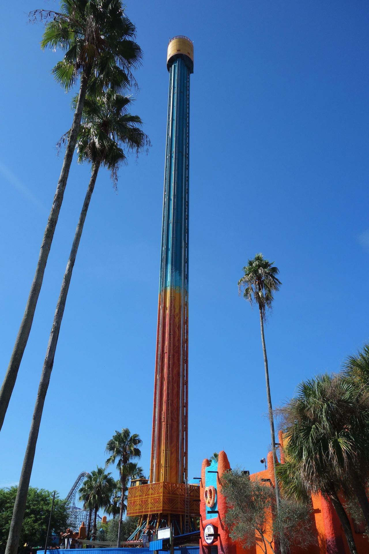 Es handelte sich um den Prototypen des Sky Jumps, bei dem die einzelnen Sitzgondeln an der Spitze des Turms nach hinten hochklappen, sodass die Mitfahrer im 90°-Winkel zum Turm hängen und geradewegs gen Boden blicken, auf den sie Sekunden später zustürzen. Damit man beim Bremsen nicht zu viel Druck auf die Brust bekommt, klappen die Sitze kurz vor der Bremsstrecke wieder in die normale Sitzposition zurück. Eine zweite Auslieferung - mit minimal kleinerem Gitterturm und nur zwei 8er-Gondeln - eröffnete 2017 in Gröna Lund. Und nachdem ich mich so sehr gefreut hatte, gleich beide in einem Jahr vergleichen zu können, hatte ich am Ende keinen getestet. Der schwedische entging mir bekanntlich wegen Corona, Falcon's Fury war bereits seit Monaten "in Wartung".