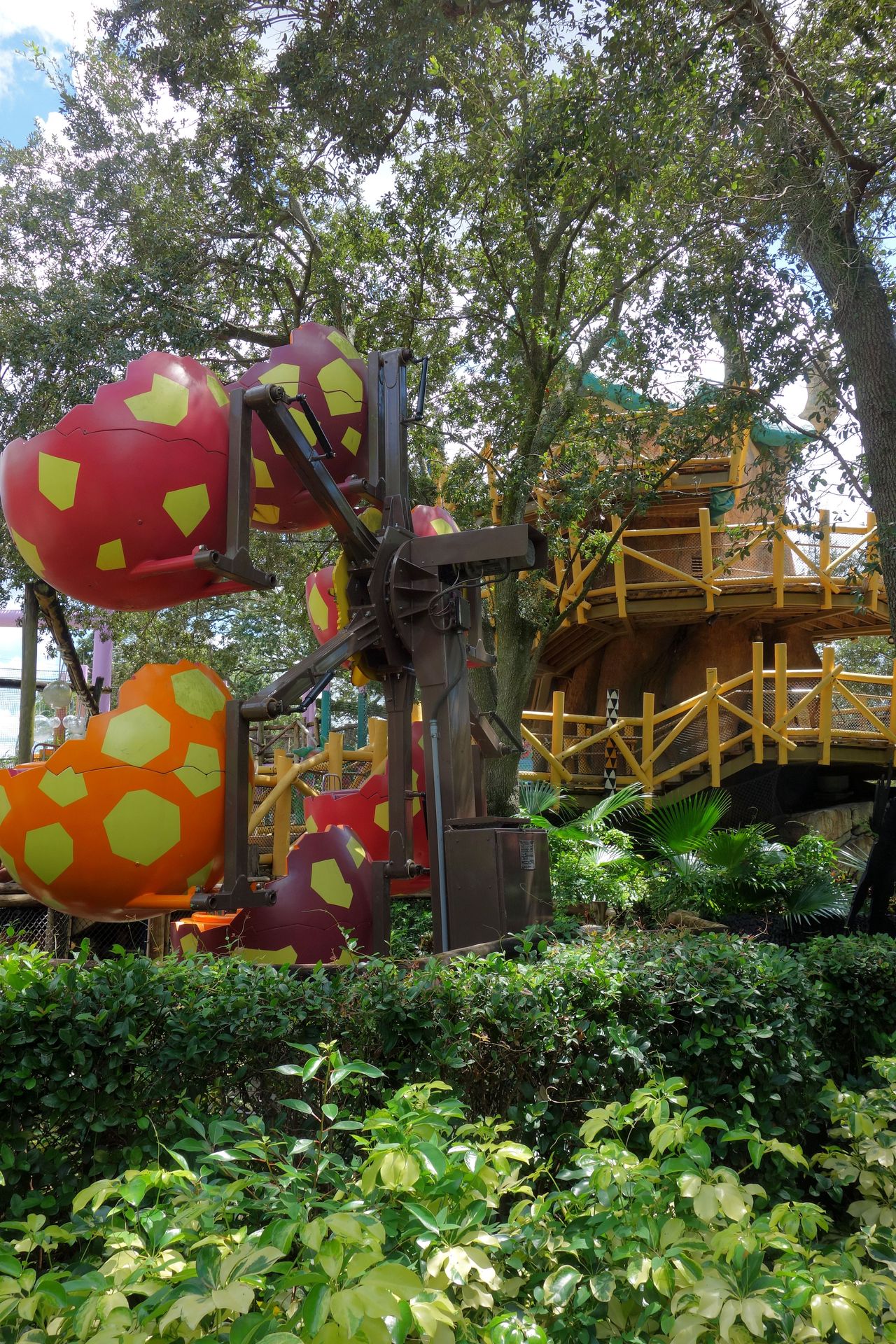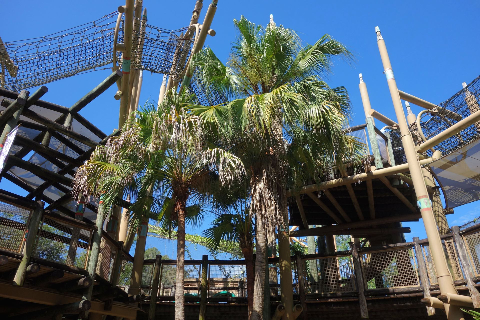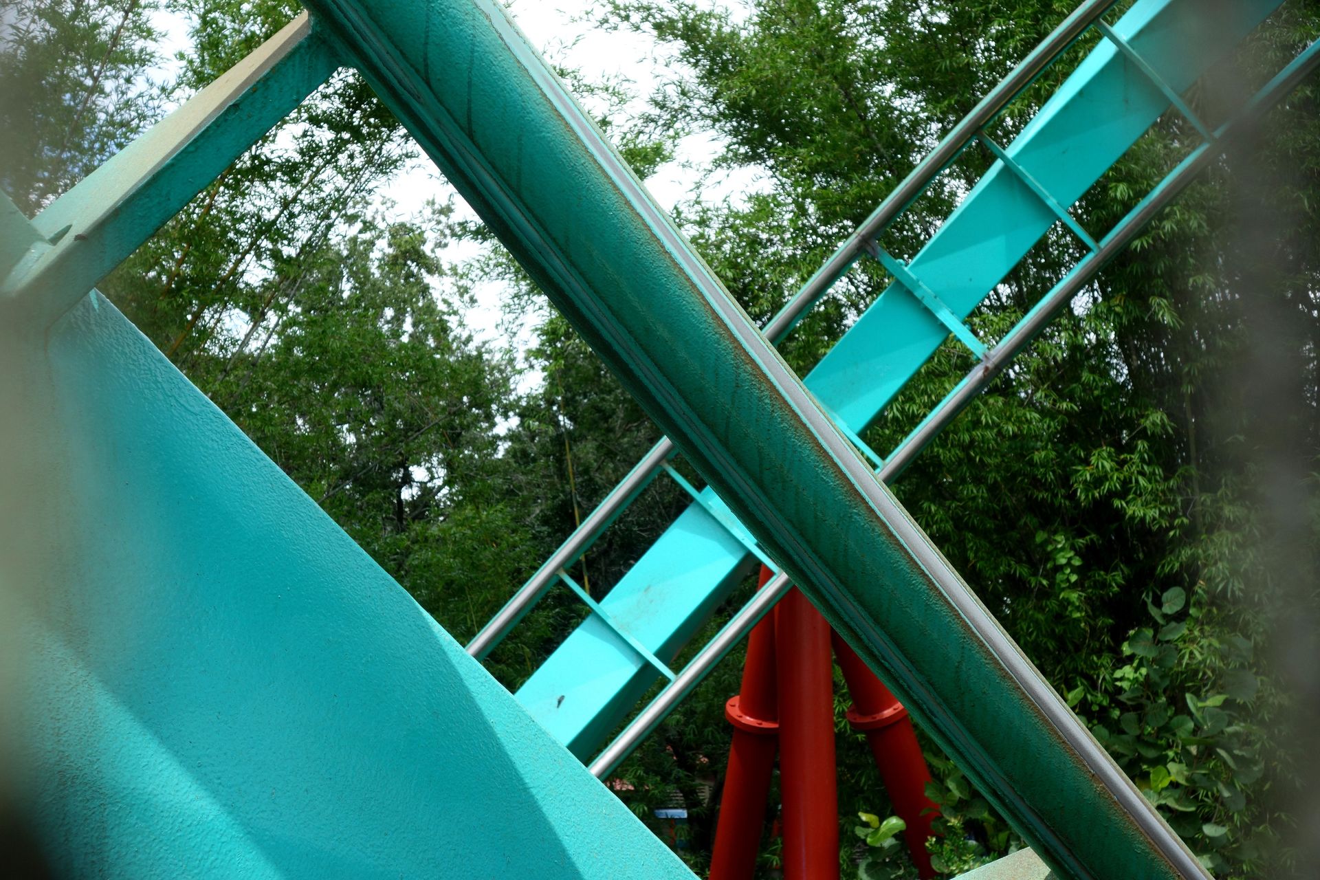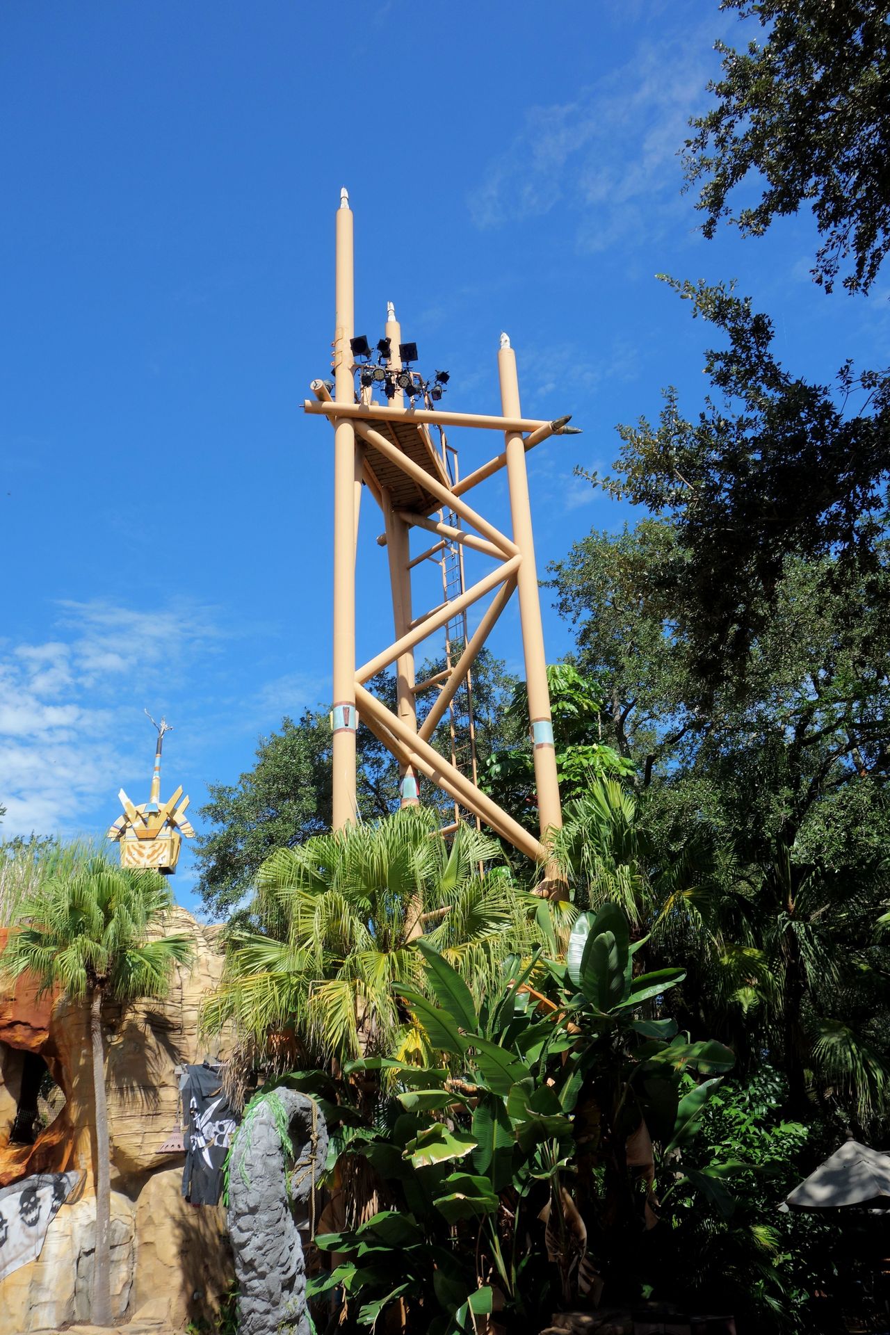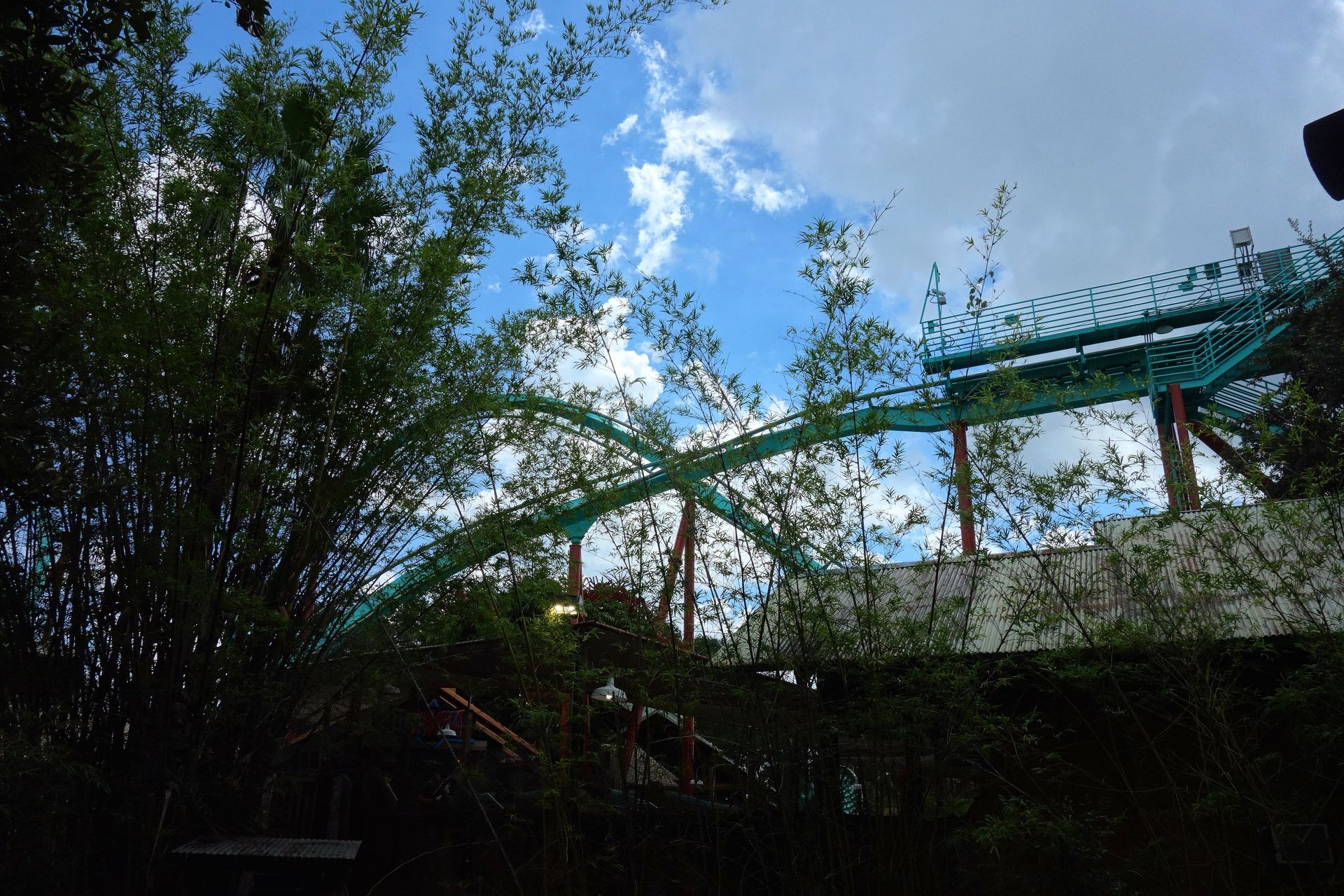 Und gemäß einigen Kommentaren im Netz war dessen Existenz aufgrund des guten Verstecks wohl auch vielen anderen Besuchern unbekannt. Mag aber auch damit zusammenhängen, dass der ganze Bereich rund um die Tree Top Trails 2018 geschlossen wurde. Die Jungle Flyers, also die Seilbahnen, wurden inzwischen offensichtlich schon entfernt. Wir konnten zwar wieder unter dem Kletterparcours herumlaufen - um festzustellen, dass es sich hier um eine Sackgasse handelt - die Trails selbst waren aber nach wie vor nicht zugänglich. Wild Surge wurde Ende 2021 nochmal geöffnet, ging Ende 2022 jedoch in eine Wartungspause, die schließlich mit dem Abriss des Turms endete - Gerüchten zufolge aufgrund eines Feuers, zu dem allerdings nichts Konkreteres zu finden ist. Was mit dem Rest des Bereichs passieren soll, ist bislang nicht bekannt, spekuliert wird aber unter anderem über eine kleine Holzachterbahn nach dem Vorbild von InvadR im Schwesterpark.
