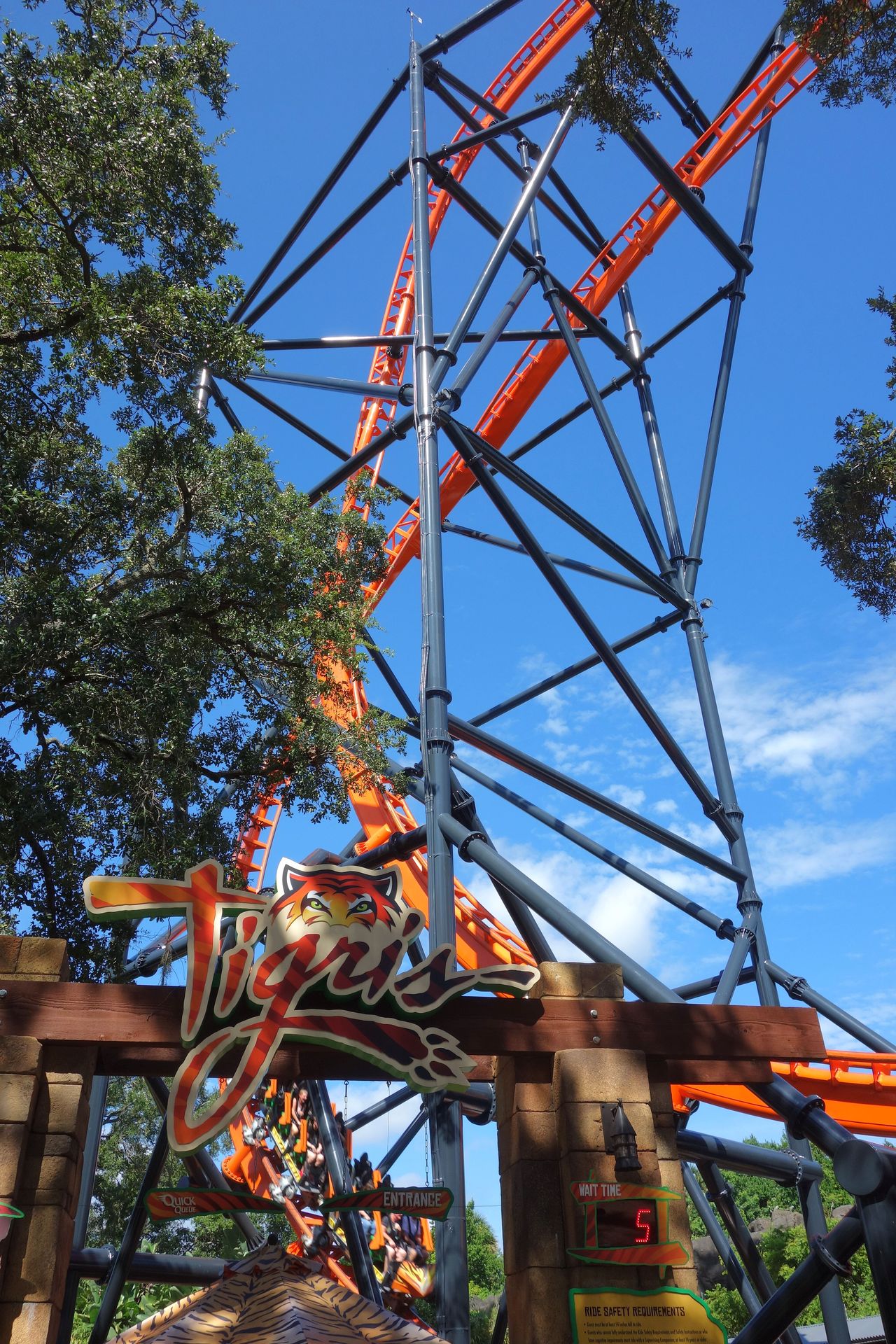 Stattdessen steht Tigris nun in etwa dort, wo sich einst die Schussfahrt befand (womit dahinter zusammen mit dem Gelände der Tree Top Trails noch reichlich Platz für eine künftige Neuheit verbleibt). Der Wartebereich folgt dem Verlauf des ersten Teils des alten Kanals, so konnte man abermals die bestehenden Felsformationen erhalten. Auch das alte Stationsgebäude steht noch, allerdings abseits des Weges. Keine Ahnung, ob da aktuell noch irgendwas drin ist. Die Wartezeit war wie oben zu sehen mit gerademal 5 Minuten veranschlagt, tatsächlich herrschte auch hier beinahe gähnende Leere und wir mussten nur ein oder zwei Fahrten warten, bis wir in den vermurksten Premier-Rides-Zug einsteigen konnten. Wie bei den anderen Anlagen der Gruppe in Williamsburg und San Diego hat auch Tigris einen zusätzlichen dritten Wagen am Zug, allerdings natürlich auch die dämlichen Schultergurte. Ansonsten gibt es zur Bahn nicht viel zu sagen, ist eben ein Sky Rocket II. Überraschenderweise hat mir Tigris dennoch ganz gut gefallen, die Anlage wurde wesentlich besser in die Umgebung integriert als die völlig deplatziert wirkende Tempesto im Schwesterpark.