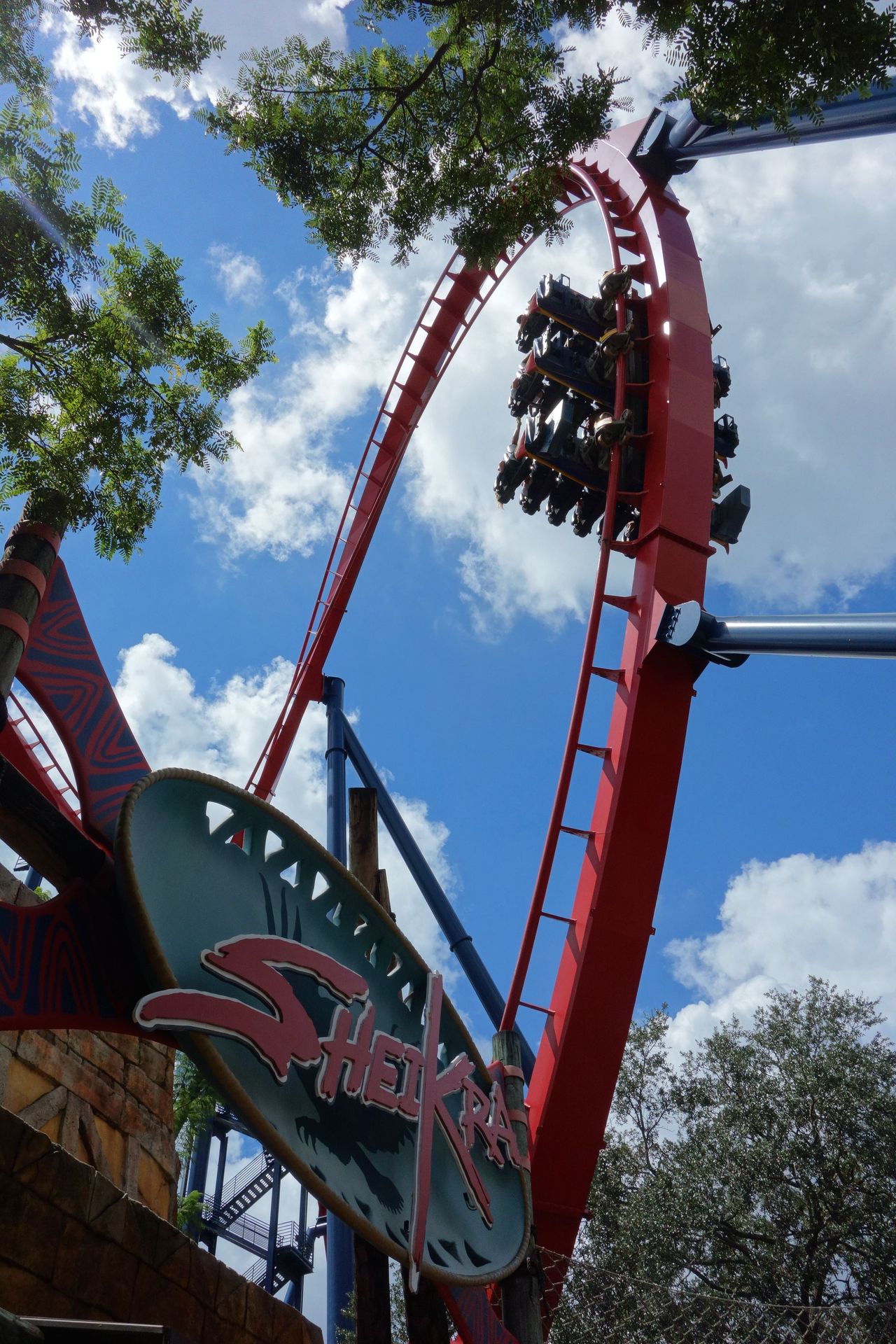 B&M verkauft. Eröffnet wurde dieser 2005, genau wie bei den beiden vorherigen Auslieferungen kamen Züge mit 8 Sitzen pro Reihe zum Einsatz, hier allerdings in drei statt zwei Reihen. Als dann 2007 der große Bruder Griffon im Schwesterpark mit bodenlosen 10er-Reihen aufwartete, wurde auch SheiKra auf Floorless-Züge umgebaut. Wie bei Cheetah Hunt können hier zwei Züge hintereinander parkend gleichzeitig beladen werden, dazu verfügt auch SheiKra über 5 Züge. Gebrauch machte man davon aber natürlich nicht, es war einzig die hintere Stationsposition in Betrieb. Cool fand ich, dass der Aufgang des Wartebereichs ein eigenes Gebäude ist, die Lücke zum eigentlichen Stationsgebäude wird dann mit einer Brücke geschlossen - und zwar für jede Reihe eine eigene, sodass die nächste Wagenladung theoretisch schon auf den Brücken eingeteilt werden kann. Sparte man sich an diesem Tag aber, da die Wartezeit eh überschaubar war. 1-2 Züge, dann konnten wir in der hintersten Reihe zusteigen. Aufgrund des Stadium Seatings sind die Sitze dort relativ hoch angebracht, da muss man schon regelrecht reinklettern.
