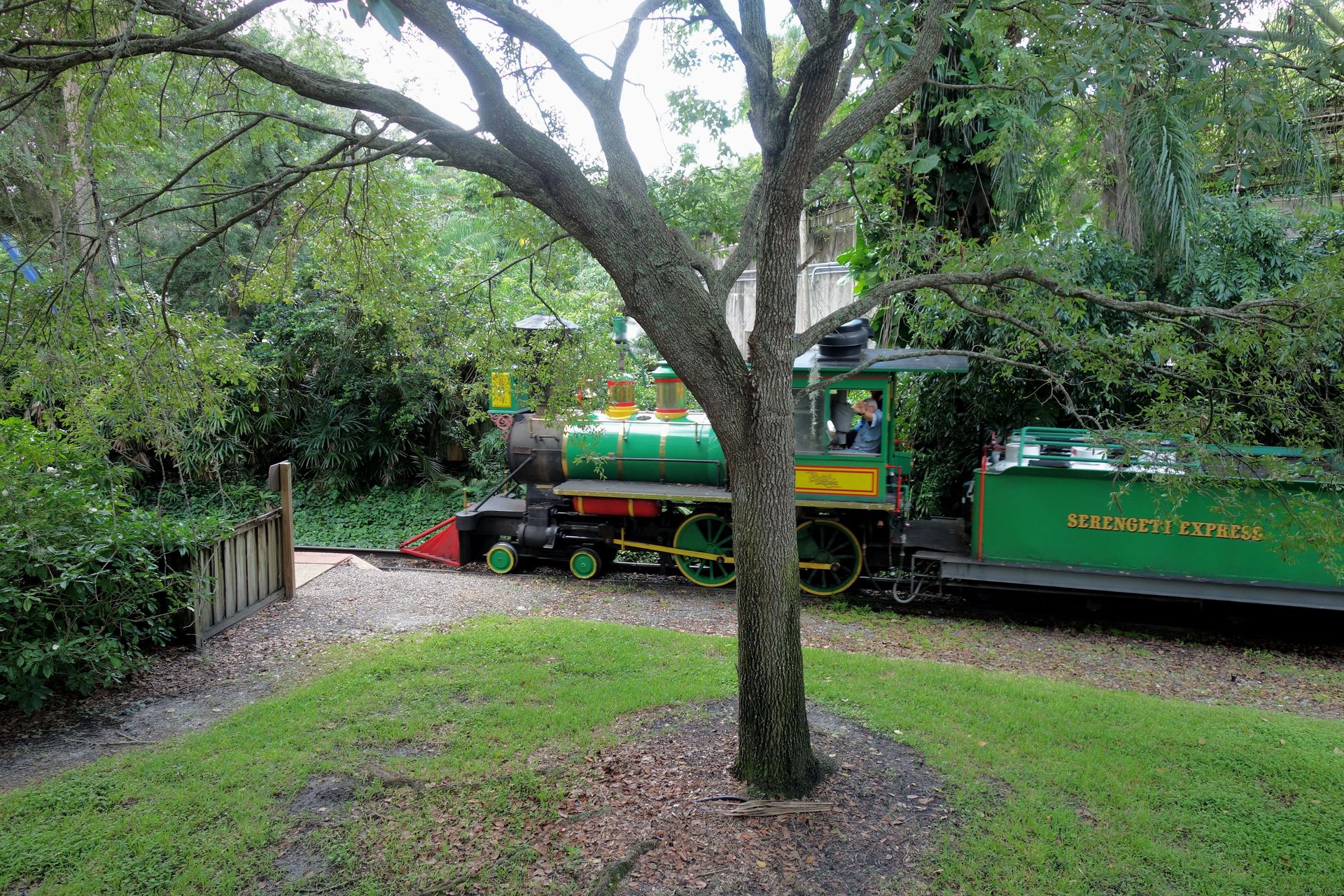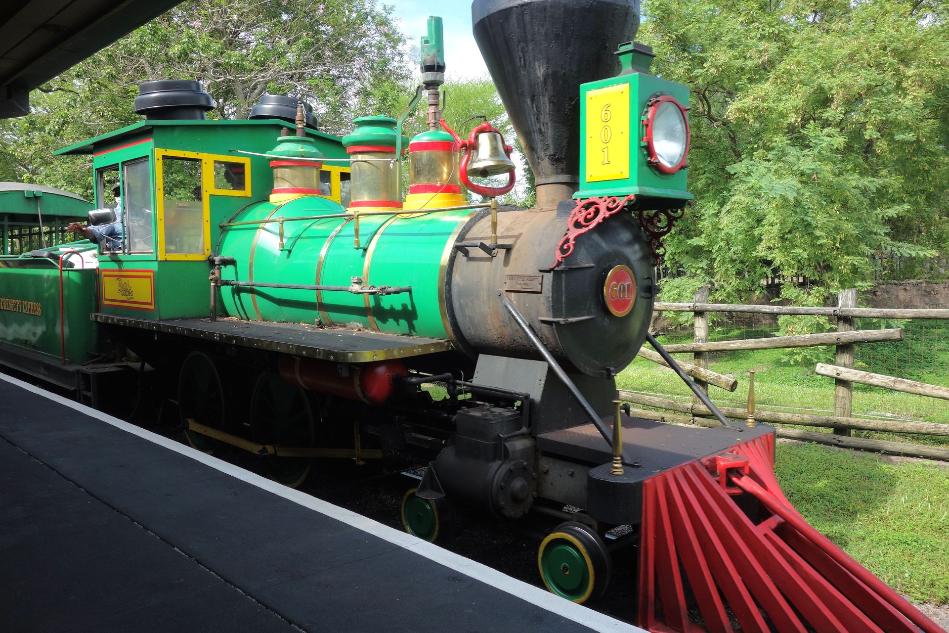 Die Schmalspurbahn führt über 3,5 Kilometer in einer großen Schleife um das riesige Serengeti-Gelände und in einer zweiten Schleife durch den Freizeitparkteil der Busch Gardens. Gezogen wurde unser Zug von der grünen Lok mit der Nummer 601 von Crown Metal Products, welche die jüngste der wohl vier Loks des Parks ist. Gebaut wurde sie nämlich für die 1975 eröffnete Old Dominion Line in Kings Dominion. Nach deren Schließung 1994 wurde diese Lok an Busch Gardens verkauft. Eine weitere Lok wurde in den 1980ern von Six Flags St. Louis übernommen, die beiden anderen sind die originalen Loks des Serengeti-Express, wobei eine davon laut Wikipedia aktuell außer Dienst sein soll.