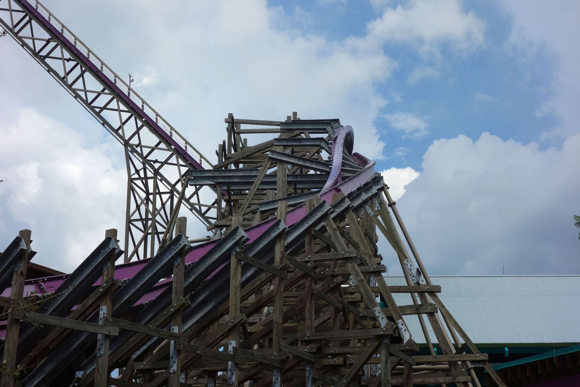 Nach Unterquerung des First Drops geht es in einer steilen Rechtskurve wieder nach oben und unter dem Lift hindurch.