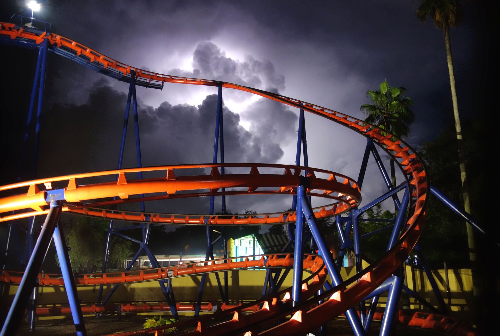 Kumba gönnte ich ebenfalls eine Wiederholungsfahrt in der Front Row (auch hier war die Station nahezu leer), dann wanderte ich zu SheiKra. Dort hätte ich auch gerne mal eine andere Reihe probiert, aber dann hätte ich womöglich noch einen Zug abwarten müssen. So fuhr ich einmal wie bei der Erstfahrt hinten links und dann nochmal hinten rechts. Bei der zweiten Fahrt saß ich dann wiederum ganz alleine in der 8er-Reihe. Das war ein ganz krasses Déjà-vu. Busch Gardens, Dive Coaster, Nacht, blitzender Himmel. Genau so war es auch 2015 in Williamsburg. Einziger Unterschied: Damals hatten wir eine ERT. Das wäre noch das Tüpfelchen auf dem I gewesen, aber auch so war die Fahrt der emotionale Höhepunkt des Tages. UN-VER-GESS-LICH.