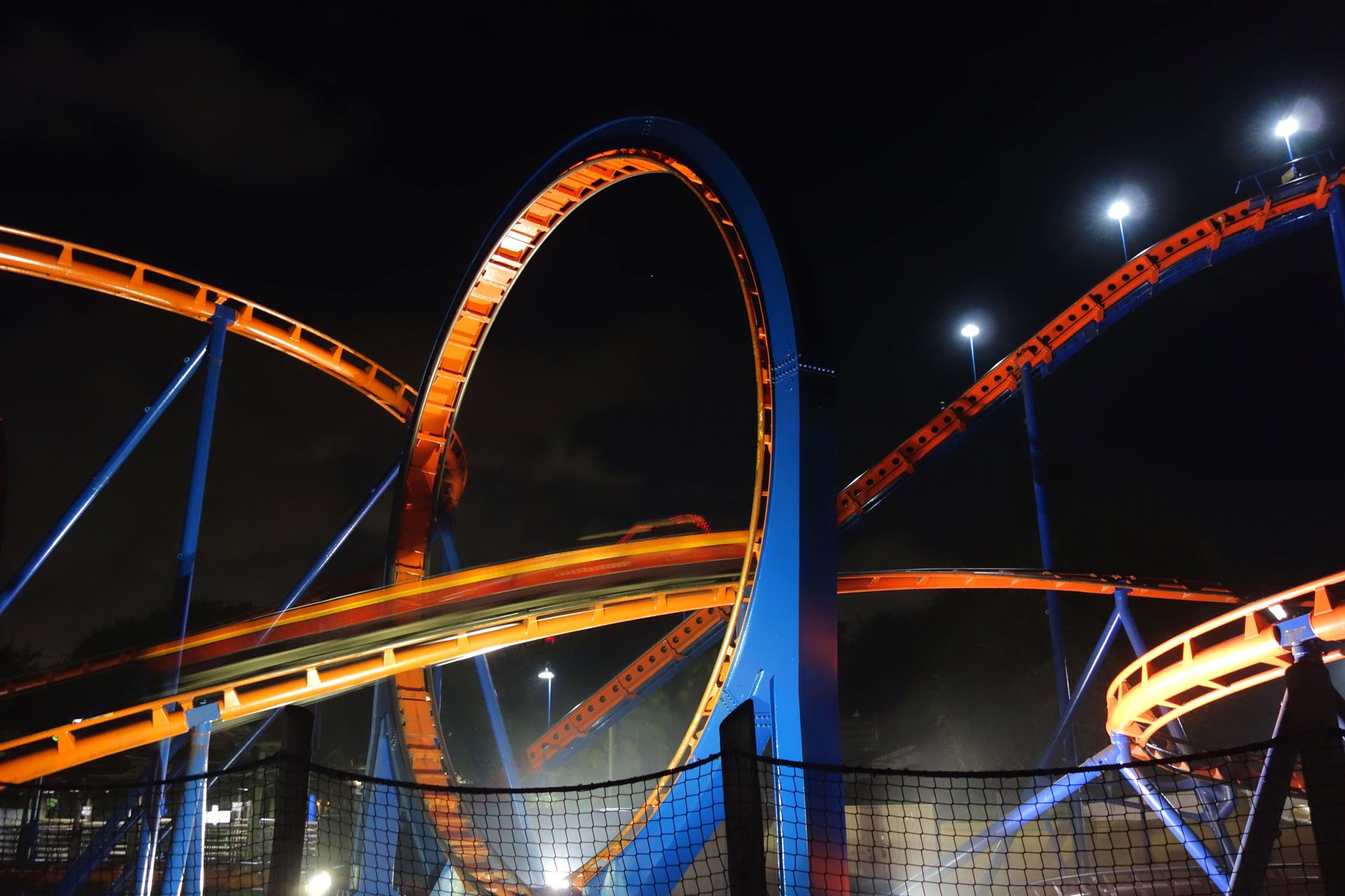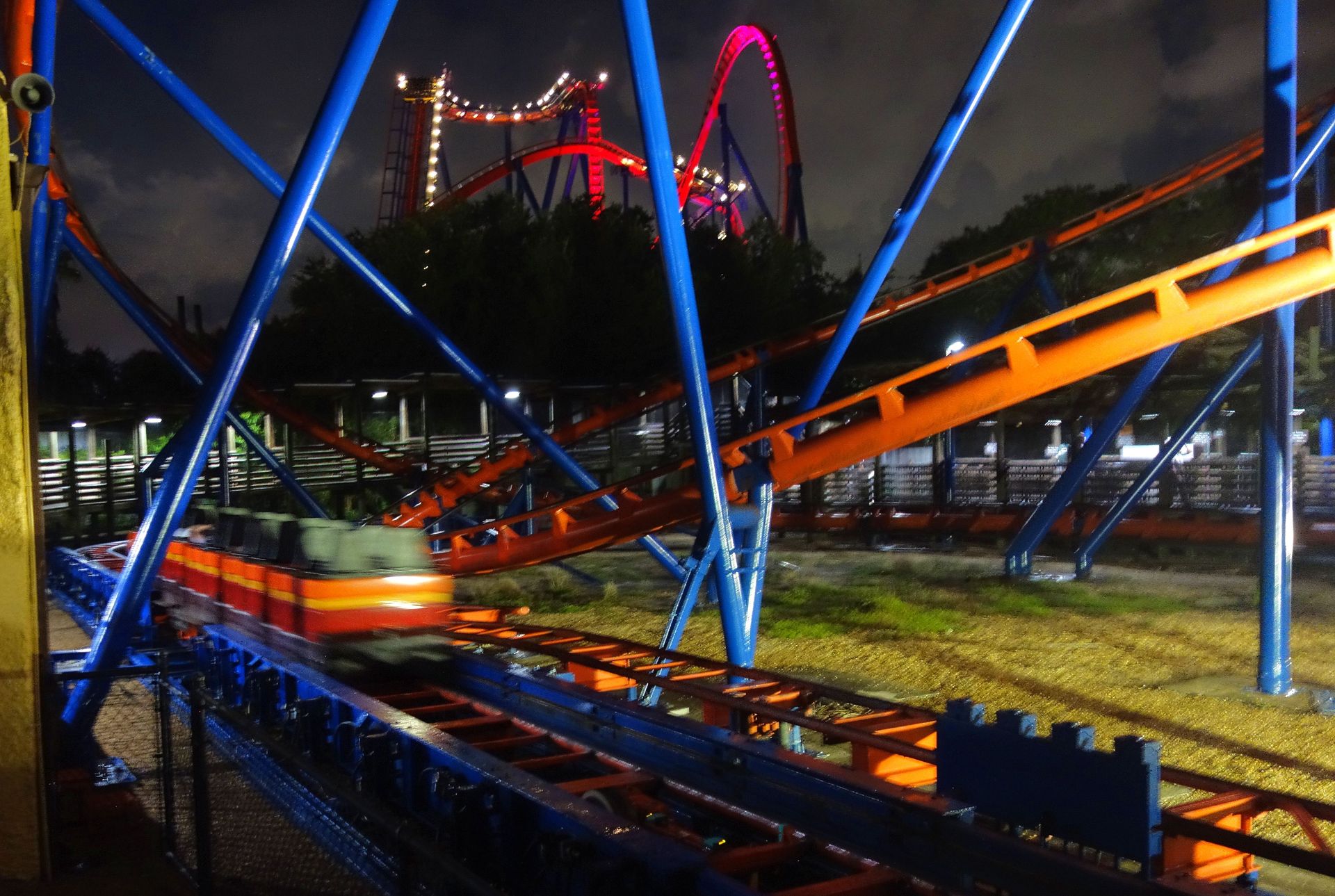 Kurzum: Ich liebe Cheetah Hunt bei Nacht. Und da die Station nach der Pause noch leer war, wollte ich gleich nochmal fahren. Als ich in die Station kam, stiegen gerade alle ein. Ich steuerte also für die nächste Fahrt diesmal die Front Row an und stand dort lange Zeit ganz alleine auf den nächsten Zug wartend. Dabei hörte ich, wie sich die Mitarbeiterinnen darüber wunderten, dass man noch immer mit drei Zügen fahre. Offenbar hatten sich die Wartezeiten hier den ganzen Tag über arg in Grenzen gehalten. Aber gut, mir sollte es Recht sein. Aus der Privatfahrt wurde allerdings nichts. Kurz bevor der Zug einrollte, kamen doch noch weitere Mitfahrer. Tatsächlich überlegte ich, einfach den Rest des Abends Cheetah Hunt zu fahren. Aber ein paar andere Bahnen hatten definitiv auch Wiederholungsfahrten verdient.