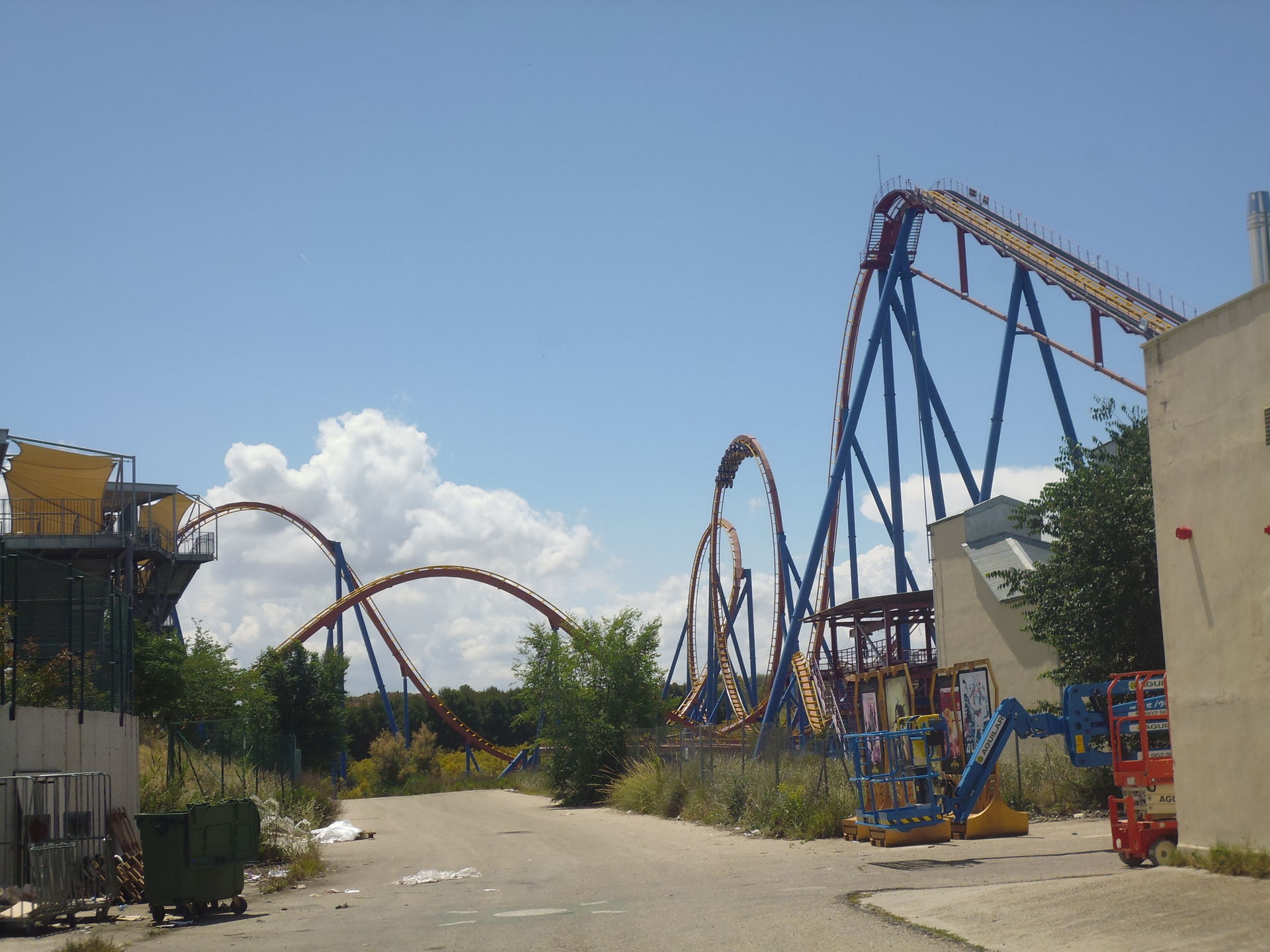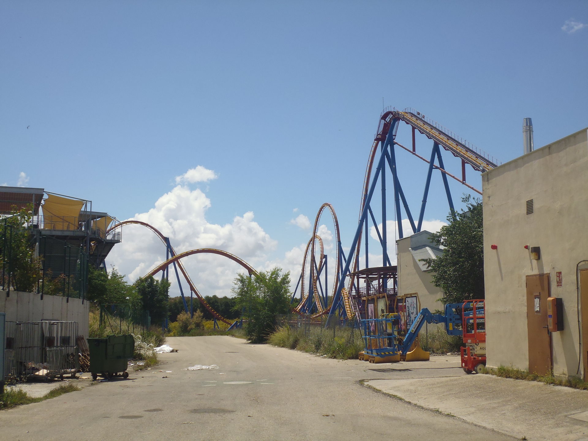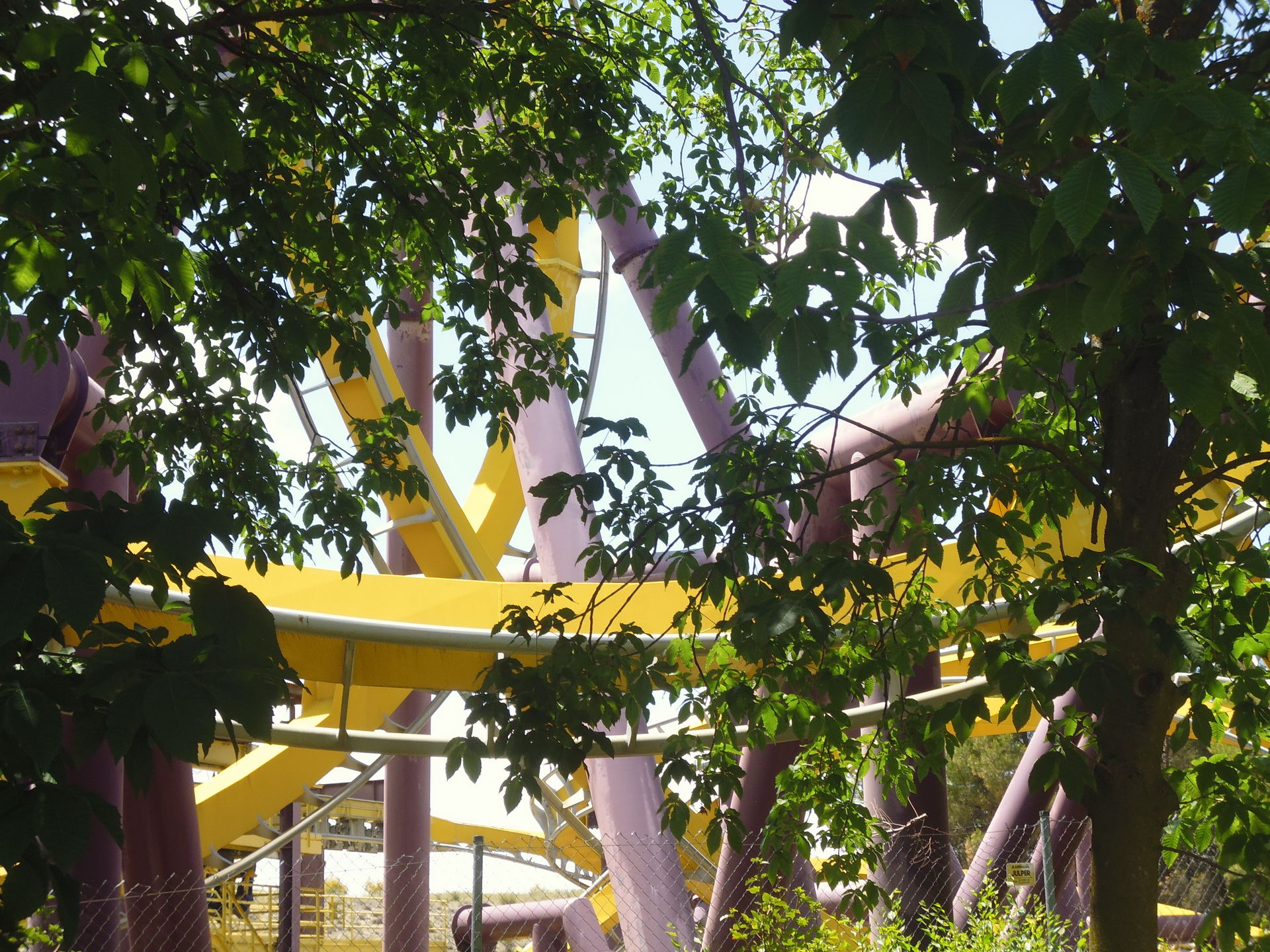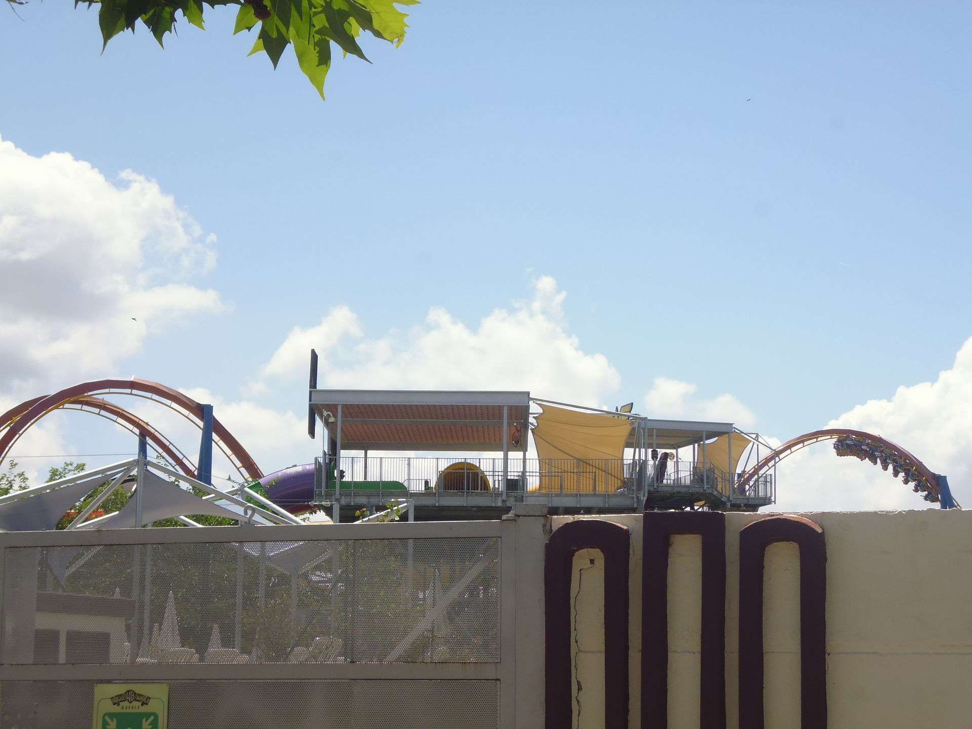 Cobra Roll von einem Rutschenturm des zwischenzeitlich da gebauten Wasserparks Warner Beach versperrt, dessen Saison jedoch erst Ende Juni beginnt.