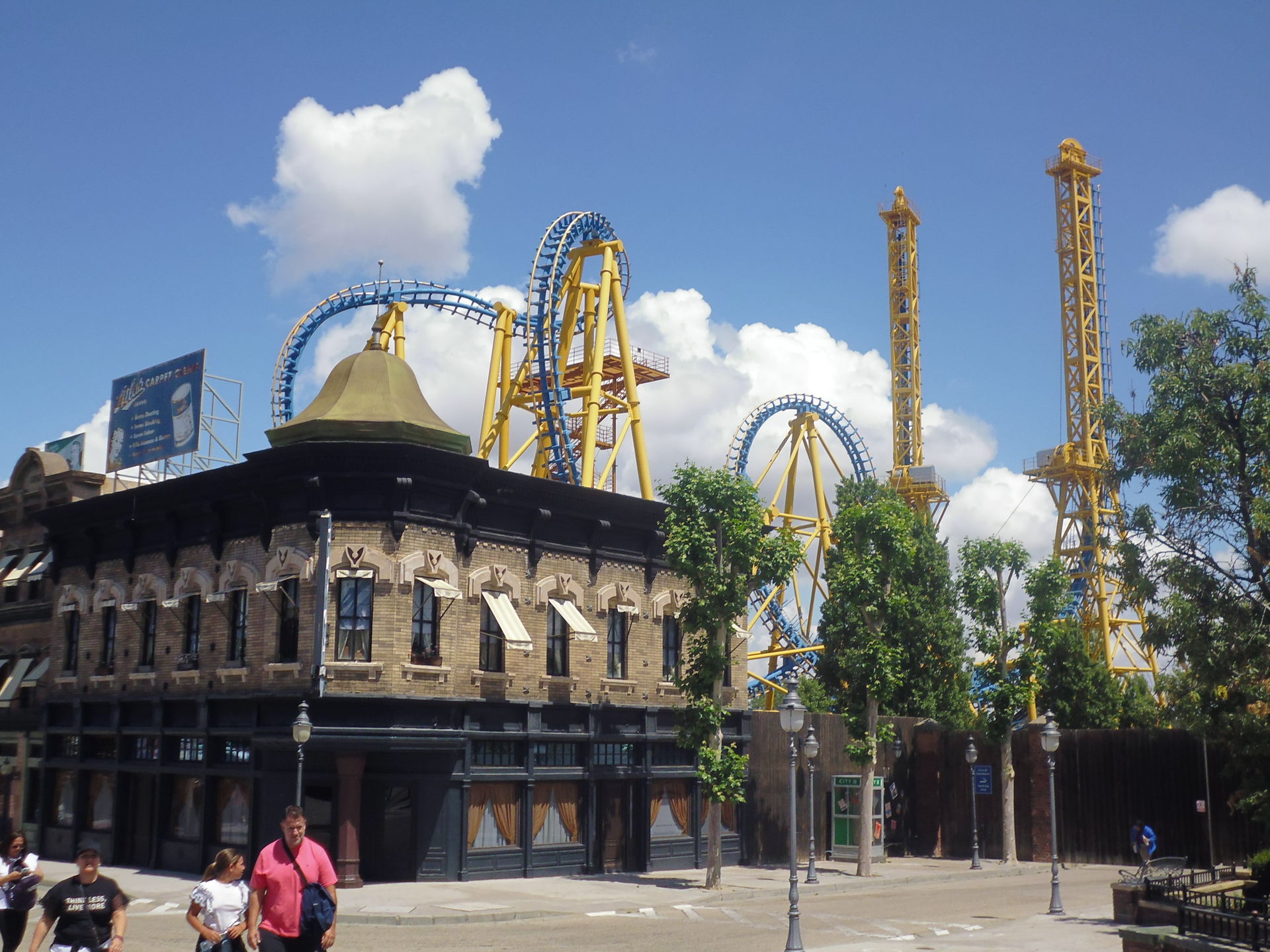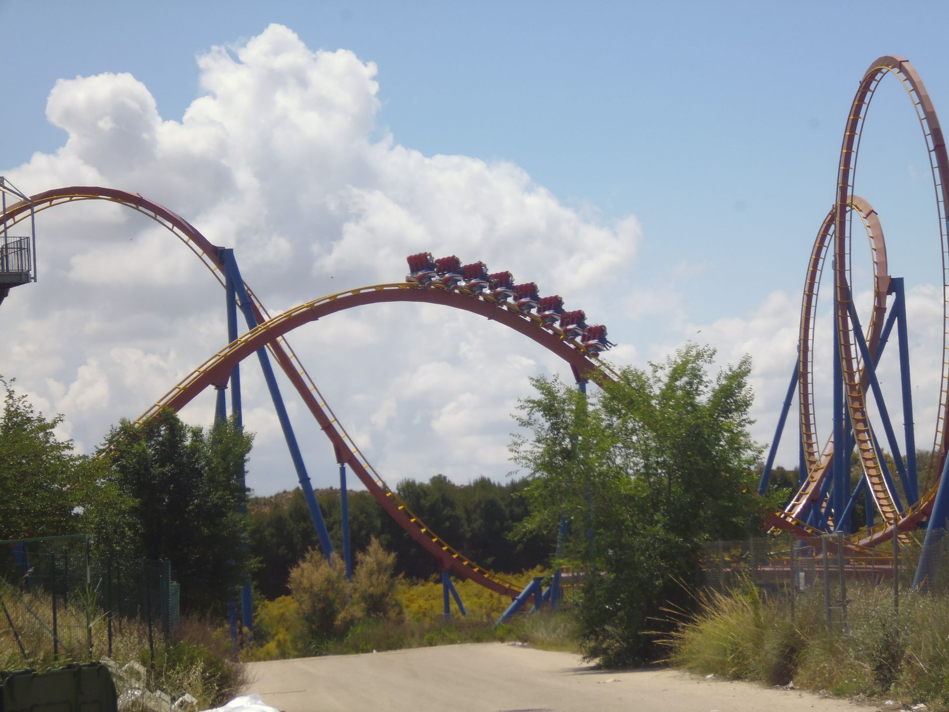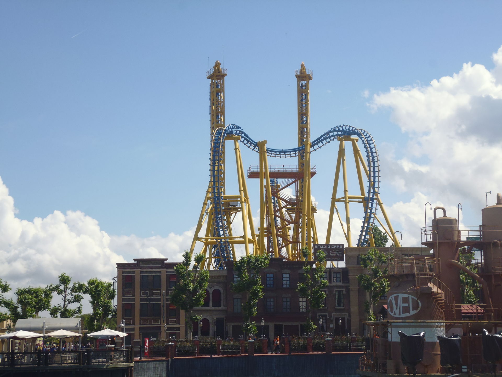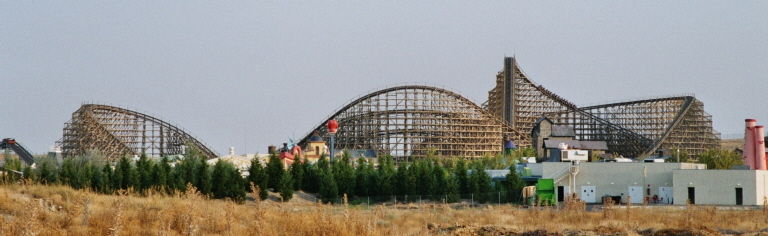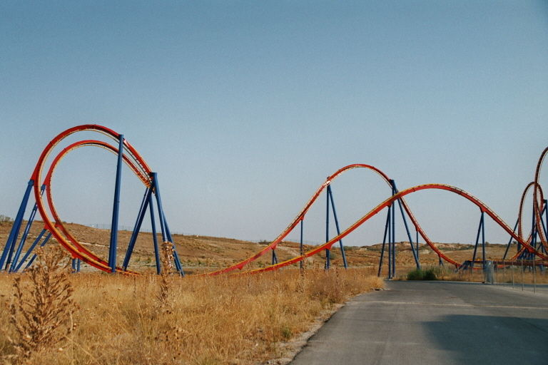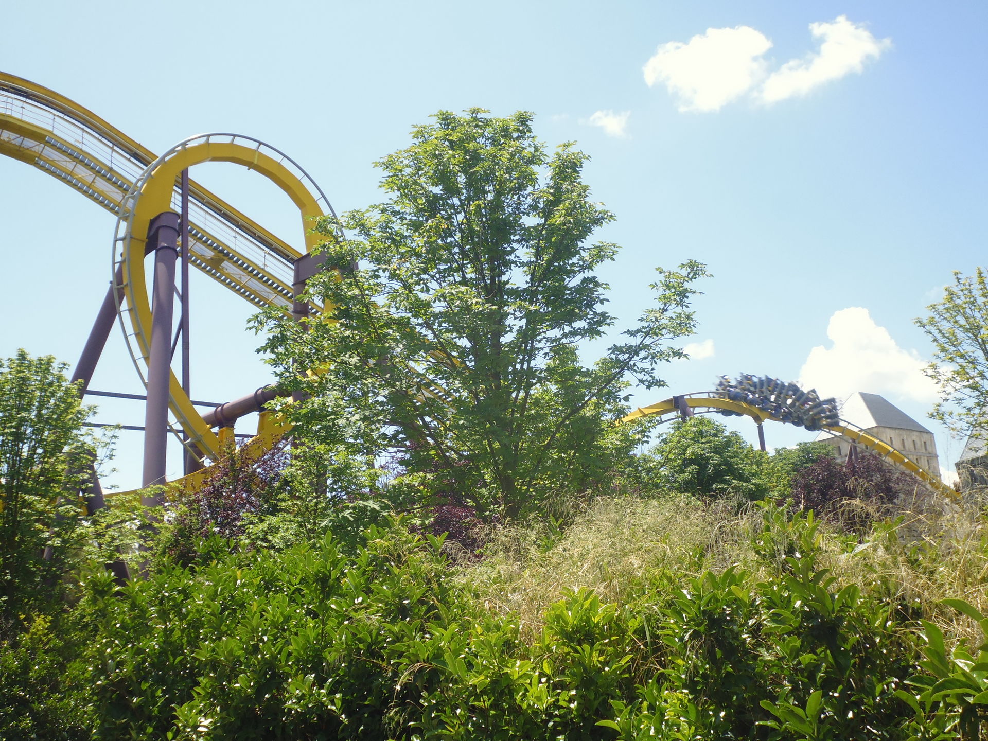 Cobra Roll von einem Rutschenturm des zwischenzeitlich da gebauten Wasserparks Warner Beach versperrt, dessen Saison jedoch erst Ende Juni beginnt.